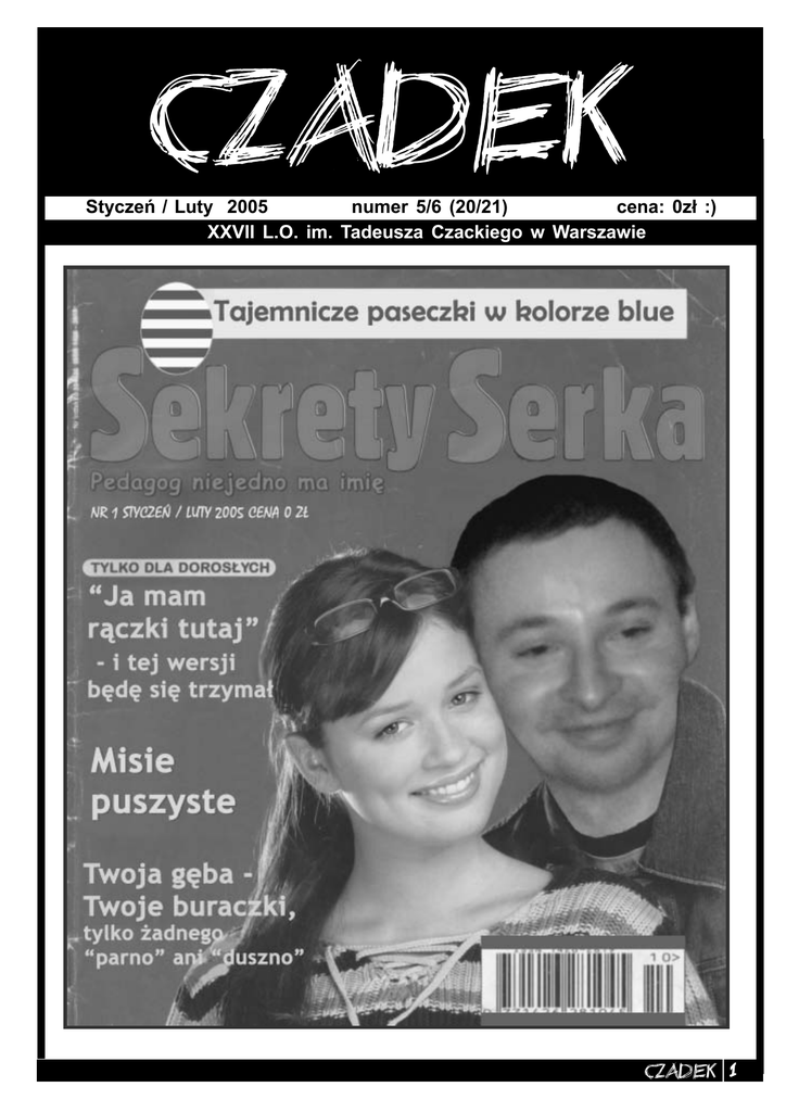 CZADEK Styczeń / Luty 2005 numer 5/6 (20/21) cena: 0zł :) XXVII L.O. im. Tadeusza Czackiego w Warszawie CZADEK 1 z życia czackiego - Jak oceniasz postawę społeczności uczniowskiej, która do końca prosiła Radę, również Twoimi ustami, o zmianę decyzji w sprawie pójścia chłopaków na studniówkę? wstępniak Parę słów na początek. Styczniowo-lutowo będzie, a trochę się działo w tym czasie. Przede wszystkim wróciła zima i śnieg. A wraz z nimi oczywiste oziębienie kontaktów uczniowskonauczycielskich; cóż, taka pora roku. Na ocieplenie czy wręcz zaognienie atmosfery musimy poczekać do wiosny (matury, koniec roku, od razu krew szybciej płynie w żyłach). Za nami także studniówka, jak zwykle jedyna w swoim rodzaju, ale chyba w tym roku wyjątkowo niezapomniana ze względu na bezpłatne atrakcje, jej towarzyszące. Trwają Stożki, semestr się kończy i zaraz znów zaczyna, życie wre jednym słowem. Także Festiwal nie daje o sobie zapomnieć – – 7 lutego mogliśmy przeżyć jego namiastkę jeszcze raz, ale tym razem już w Teatrze Powszechnym (ach, jak miło znów musieć zostawać w Szkole do 1900). Niniejszym zapraszamy do czytania, a także kontemplowania tudzież zreflektowania, co kto woli. ata & śvistak Wywiad z konsulem - Jak się czujesz po tej ciężkiej próbie, jakiej został poddany Czacki w ciągu ostatnich dwóch tygodni? I jak wg Ciebie z niej wyszedł: zwycięski czy pokonany? - Nie mogę odpowiedzieć na tak postawione pytanie. To, jak się czuję w wyniku tej afery, nie jest naprawdę ważne. - Uważasz, że Pani Dyrektor może odpowiedzieć na to pytanie, a Ty nie? - Myślę, że dla Pani Dyrektor był to większy szok. Ona odpowiada za tę Szkołę. My wystąpiliśmy tutaj w roli mediatora. A Czacki wyszedł pokonany – uważam, że ta sprawa nie powinna wyjść poza Szkołę, powinniśmy ją rozwiązać we własnym gronie – bez względu na decyzję, lepiej by byłoby, gdyby pozostała to decyzja szkolnych organów. - Czy lepiej by się stało, gdyby nasi koledzy nie poszli na studniówkę? - Trudno mi powiedzieć. To jest bardziej pytanie do nauczycieli, nie do nas. - Gdyby kara nie została uchylona, można by mówić o swego rodzaju ostrzeżeniu dla innych, takim przykładzie konsekwencji. Czy podjęta przez Radę decyzja nie była przede wszystkim dydaktyczną przestrogą dla innych, a nie karą dla nich? - Myślę, że nie. Przestrogą była cała afera, wszystko, co się wydarzyło. Zakaz był przede wszystkim karą dla chłopaków. 2 CZADEK - Bardzo dobrze oceniam, bardzo cieszę się, że uczniowie potrafią się zjednoczyć. Byłoby bardzo źle, gdyby uczniowie nie chcieli zaangażować się w problem, dotyczący ich kolegów. - Może to będzie przykre pytanie, ale powiedz, gdybyś w tej chwili był obecny na ustnej maturze któregoś z chłopaków, byłbyś w stanie zapomnieć, co zrobili, i oceniać ich obiektywnie? - Z całą stanowczością: tak. Myślę, że trzeba wyraźnie oddzielić dokonania naukowe chłopaków od tego przykrego incydentu, gdyż to ludzka rzecz popełniać błędy. - Czemu część nauczycieli po odtańczeniu przez abiturientów poloneza opuściła budynek NOT-u? - Nie mam zielonego pojęcia, nie byłem na studniówce. Ale to bardzo ciekawe pytanie, sam chętnie poznałbym powód takiego zachowania. - Czy uważasz, że w jakiś sposób zmieni się oblicze codzienności w Szkole? - Myślałem najpierw, że w szkolnej codzienności nic się nie zmieni, bo po pierwszych kilku dniach nic na to nie wskazywało. Nie miał i nie ma miejsca żaden konflikt między uczniami a nauczycielami. Teraz jednak widać, że wielu nauczycieli żywi jakiś żal do uczniów (przynajmniej do tych bardziej zaangażowanych w sprawę), a to, niestety, powoduje, że powstaje i pogłębia się dystans, jakaś bariera między Radą a uczniami. Ma to, niestety, negatywne odbicie w codziennej pracy Szkoły. - Czy to wszystko, co się dzieje, spowoduje spadek atmosfery wzajemnego zaufania, zmianę polityki wobec uczniów, generalną zmianę wizerunku Szkoły jako tolerancyjnej wobec ucznia? - To nie jest kwestia tolerancji. Myślę jednak, że sporo się zmieni. Podejście uczniów do nauczycieli – będą się obawiali, że to, co powiedzą szczerze, nie do końca zostanie wysłuchane i zrozumiane; tak samo nauczyciele: będą na nas patrzeć z większą podejrzliwością. Myślę, że pewne porozumienie zostało nadszarpnięte. I raczej nieprędko będzie odbudowane, gdyż tutaj dwoje musi chcieć naraz. - Czy to, co się dzieje, można określić Czarnym Rokiem Naszej Szkoły (afera festiwalowa, teraz ta studniówkowa)? - Ja bym tak nie przesadzał, to normalne sytuacje, które mogą mieć miejsce w każdej szkole. - Naprawdę? Jak tu jestem trzy lata - nie było ich tylu naraz. - Czasy się zmieniają. - Dzięki za rozmowę. - Wzajemnie. rozmawiał Dzikus z życia czackiego Wywiad z prof. koszycką - Jak się Pani czuje po tej ciężkiej próbie, jakiej został poddany Czacki w ciągu ostatnich dwóch tygodni? I jak wg pani z niej wyszedł: zwycięski czy pokonany? - Jak wyszedł z niej Czacki? Czacki stoi niezłomnie na pierwszym piętrze. Natomiast jak ja się czuję? Ja się czuję przede wszystkim zmęczona. Różne dodatkowe spotkania, stres, nerwy, brak snu ... Jeśli chodzi o Szkołę…myślę, że na pewno ucierpiała atmosfera w Szkole. Ciężko jest o tym mówić w kategoriach: ”zwycięski - pokonany”, myślę, że na pewno „Czacki” wyszedł mądrzejszy. - Czy lepiej by się stało, gdyby nasi koledzy nie poszli na studniówkę? -Wiesz, kilku z nich nie poszło, ja bardzo szanuję ich za to, że przyjęli nałożoną na nich karę bez względu na odgórne decyzje administracyjne czy jakieś zarzuty prawne. Uważam, że ci, którzy na tej studniówce się nie pojawili, postąpili honorowo. Taka postawa jest uczciwa: zrobiłem coś złego, poczuwam się do winy, więc przyjmuję karę. - A gdyby równie