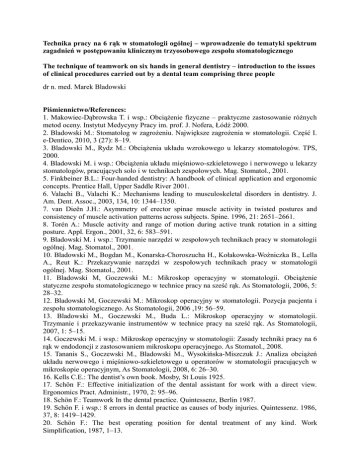 Technika pracy na 6 rąk w stomatologii ogólnej – wprowadzenie do tematyki spektrum zagadnień w postępowaniu klinicznym trzyosobowego zespołu stomatologicznego The technique of teamwork on six hands in general dentistry – introduction to the issues of clinical procedures carried out by a dental team comprising three people dr n. med. Marek Bladowski Piśmiennictwo/References: 1. Makowiec-Dąbrowska T. i wsp.: Obciążenie fizyczne – praktyczne zastosowanie różnych metod oceny. Instytut Medycyny Pracy im. prof. J. Nofera, Łódź 2000. 2. Bladowski M.: Stomatolog w zagrożeniu. Największe zagrożenia w stomatologii. Część I. e-Dentico, 2010, 3 (27): 8–19. 3. Bladowski M., Rydz M.: Obciążenia układu wzrokowego u lekarzy stomatologów. TPS, 2000. 4. Bladowski M. i wsp.: Obciążenia układu mięśniowo-szkieletowego i nerwowego u lekarzy stomatologów, pracujących solo i w technikach zespołowych. Mag. Stomatol., 2001. 5. Finkbeiner B.L.: Four-handed dentistry: A handbook of clinical application and ergonomic concepts. Prentice Hall, Upper Saddle River 2001. 6. Valachi B., Valachi K.: Mechanisms leading to musculoskeletal disorders in dentistry. J. Am. Dent. Assoc., 2003, 134, 10: 1344–1350. 7. van Dieën J.H.: Asymmetry of erector spinae muscle activity in twisted postures and consistency of muscle activation patterns across subjects. Spine. 1996, 21: 2651–2661. 8. Torén A.: Muscle activity and range of motion during active trunk rotation in a sitting posture. Appl. Ergon., 2001, 32, 6: 583–591. 9. Bladowski M. i wsp.: Trzymanie narzędzi w zespołowych technikach pracy w stomatologii ogólnej. Mag. Stomatol., 2001. 10. Bladowski M., Bogdan M., Konarska-Choroszucha H., Kołakowska-Woźniczka B., Lella A., Reut K.: Przekazywanie narzędzi w zespołowych technikach pracy w stomatologii ogólnej. Mag. Stomatol., 2001. 11. Bladowski M, Goczewski M.: Mikroskop operacyjny w stomatologii. Obciążenie statyczne zespołu stomatologicznego w technice pracy na sześć rąk. As Stomatologii, 2006, 5: 28–32. 12. Bladowski M, Goczewski M.: Mikroskop operacyjny w stomatologii. Pozycja pacjenta i zespołu stomatologicznego. As Stomatologii, 2006 ,19: 56–59. 13. Bladowski M., Goczewski M., Buda L.: Mikroskop operacyjny w stomatologii. Trzymanie i przekazywanie instrumentów w technice pracy na sześć rąk. As Stomatologii, 2007, 1: 5–15. 14. Goczewski M. i wsp.: Mikroskop operacyjny w stomatologii: Zasady techniki pracy na 6 rąk w endodoncji z zastosowaniem mikroskopu operacyjnego. As Stomatol., 2008. 15. Tananis S., Goczewski M., Bladowski M., Wysokińska-Miszczuk J.: Analiza obciążeń układu nerwowego i mięśniowo-szkieletowego u operatorów w stomatologii pracujących w mikroskopie operacyjnym, As Stomatologii, 2008, 6: 26–30. 16. Kells C.E.: The dentist’s own book. Mosby, St Louis 1925. 17. Schön F.: Effective initialization of the dental assistant for work with a direct view. Ergonomics Pract. Administr., 1970, 2: 95–96. 18. Schön F.: Teamwork In the dental practice. Quintessenz, Berlin 1987. 19. Schön F. i wsp.: 8 errors in dental practice as causes of body injuries. Quintessenz. 1986, 37, 8: 1419–1429. 20. Schön F.: The best operating position for dental treatment of any kind. Work Simplification, 1987, 1–13. 21. Bladowski M.: Atlas techniki pracy na 4 ręce w stomatologii ogólnej, Wydawnictwo Euro-Direct-Media, Gliwice, 1999. 22. Jańczuk Z., Bladowski M.: Zasady pracy przy leżącym pacjencie w stomatologii. Wydanie II zmienione. Wydawnictwo Kwintesencja, Warszawa 2006. 23. Paul J.E.: Team Dentistry. Martin Dunitz, London 1991. 24. Bladowski M., Goczewski M., Mikroskop operacyjny w stomatologii. Pozycja pacjenta, operatora i asyst w technice pracy na sześć rąk.As Stomatologii, 2006, 19: 56–59. 25. Bladowski M., Głuszankow P.: Stopnie podparcia ciała operatora w utrzymaniu prawidłowej pozycji podczas pracy w technikach zespołowych w stomatologii ogólnej. As Stomatologii, 2005, 1: 6–9. 26. Bladowski M., Kotowicz A.: Specjalistyczne krzesło dentystyczne firmy Support Design. As Stomatol., 2006, 14: 50–54. 27. Hokwerda O. i wsp.: Ergonomic requirements for dental equipment. Guidelines and recommendations for designing, constructing and selecting dental equipment. Wydawnictwo ESDE, 2006. 28. Valachi B.: Can delivery systems deliver pain? Dent. Pract. Rep., 2006, 6: 60–62. 29. Bladowski M.: Studia metodyczne nad wykonywaniem zabiegów z zakresu stomatologii zachowawczej w znieczuleniu ogólnym. Wydawnictwo Uniwersytetu WarmińskoMazurskiego w Olsztynie, Olsztyn 2011. 30. Bladowski M., Iwanowska-Sosnowska M., Nischk M.: Znieczulenie ogólne w stomatologii klinicznej. Tryb ambulatoryjny. Część I. Wydawnictwo Czelej, Lublin 2001. 31. Bladowski M.: Stomatologia zachowawcza w znieczuleniu ogólnym. Tryb ambulatoryjny. Pacjent stomatologiczny a znieczulenie. Nowa Stomatol., 2001, 1: 34–36. 32. Bladowski M.: Wskazania i przeciwwskazania do przeprowadzania zabiegów stomatologicznych w znieczuleniu ogólnym w trybie ambulatoryjnym. Nowa Stomatol., 1999, 3: 46–52. 33. Bladowski M.: Ocena punktowej skali trudności wykonywania zabiegów z zakresu stomatologii zachowawczej w znieczuleniu ogólnym. Nowa Stomatol., 2003, 3: 131–143. 34. Bladowski M.: Stomatologia zachowawcza w znieczuleniu ogólnym. Tryb ambulatoryjny. Podstawy ergonomii pracy zespołu stomatologicznego i zasady zespołowych technik pracy podczas zabiegów wykonywanych w znieczuleniu ogólnym. Nowa Stomatol., 2002, 2: 73–87. 35. Bladowski M.: Stomatologia zachowawcza w znieczuleniu ogólnym. Tryb ambulatoryjny. Błędy zespołu stomatologicznego. Nowa Stomatol., 2002, 3: 135–139.