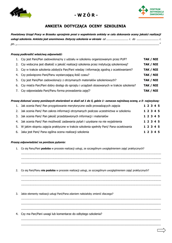 -WZÓRANKIETA DOTYCZĄCA OCENY SZKOLENIA Powiatowy Urząd Pracy w Brzesku uprzejmie prosi o wypełnienie ankiety w celu dokonania oceny jakości realizacji usługi szkolenia. Ankieta jest anonimowa. Dotyczy szkolenia w okresie od ............................. r. do ............................. r. pn. „...................................................................................................................................................................” Proszę podkreślić właściwą odpowiedź: 1. Czy jest Pani/Pan zadowolona/ny z udziału w szkoleniu organizowanym przez PUP? TAK / NIE 2. Czy widoczna jest dbałość o jakość realizacji szkolenia przez instytucję szkoleniową? TAK / NIE 3. Czy w trakcie szkolenia zdobył/a Pan/Pani wiedzę i informację zgodną z oczekiwaniami? TAK / NIE 4. Czy poświęcono Pani/Panu wystarczającą ilość czasu? TAK / NIE 5. Czy jest Pani/Pan zadowolona/y z otrzymanych materiałów szkoleniowych? TAK / NIE 6. Czy miał/a Pan/Pani dobry dostęp do sprzętu i urządzeń stosowanych w trakcie szkolenia? TAK / NIE 7. Czy odpowiadała Pani/Panu forma prowadzenia zajęć? TAK / NIE Proszę dokonać oceny poniższych stwierdzeń w skali od 1 do 5, gdzie 1- oznacza najniższą ocenę, a 5- najwyższą: 1. Jak ocenia Pani/ Pan przygotowanie merytoryczne osób prowadzących zajęcia 1 2 3 4 5 2. Jak ocenia Pani/ Pan zakres informacji otrzymanych podczas uczestnictwa w szkoleniu 1 2 3 4 5 3. Jak ocenia Pani/ Pan jakość przedstawionych informacji i materiałów 1 2 3 4 5 4. Jak ocenia Pani/ Pan możliwość zadawania pytań i uzyskane na nie wyjaśnienia 1 2 3 4 5 5. W jakim stopniu zajęcia praktyczne w trakcie szkolenia spełniły Pani/ Pana oczekiwania 1 2 3 4 5 6. Jaka jest Pani/ Pana ogólna ocena realizacji szkolenia 1 2 3 4 5 Proszę odpowiedzieć na poniższe pytania: 1. Co się Panu/Pani podoba w procesie realizacji usługi, ze szczególnym uwzględnieniem zajęć praktycznych? .................................................................................................................................................................................. .................................................................................................................................................................................. .................................................................................................................................................................................. 2. Co się Pani/Panu nie podoba w procesie realizacji usługi, ze szczególnym uwzględnieniem zajęć praktycznych? .................................................................................................................................................................................. .................................................................................................................................................................................. .................................................................................................................................................................................. 3. Jakie elementy realizacji usługi Pani/Pana zdaniem należałoby zmienić dlaczego? .................................................................................................................................................................................. ................................................................................................................................................................ ................................................................................................................................................................ 4. Czy ma Pan/Pani uwagi lub komentarze do odbytego szkolenia? ................................................................................................................................................................ ................................................................................................................................................................ INFORMACJE O UCZESTNIKU SZKOLENIA (proszę zaznaczyć właściwą odpowiedź krzyżykiem) 1. Wiek: do 25 roku życia 26- 40 lat 41- 50 lat powyżej 50 roku życia 2. Płeć: kobieta mężczyzna 3. Miejsce zamieszkania: miasto wieś 4. Poziom wykształcenia: wyższe wyższe zawodowe średnie zawodowe średnie ogólnokształcące zasadnicze zawodowe podstawowe lub gimnazjalne 5. Zawód wyuczony: ............................................................................................................................. 6. Zawód wykonywany: ........................................................................................................................ 7. Staż pracy (ogółem): ........................................................................................................................ 8. Status: bezrobotny z prawem do zasiłku bezrobotny bez prawa do zasiłku poszukujący pracy w tym: długotrwale bezrobotny niepełnosprawny samotnie wychowujący dziecko do lat 18 ..................................................................... /miejscowość, data/ Dziękujemy za wypełnienie ankiety!