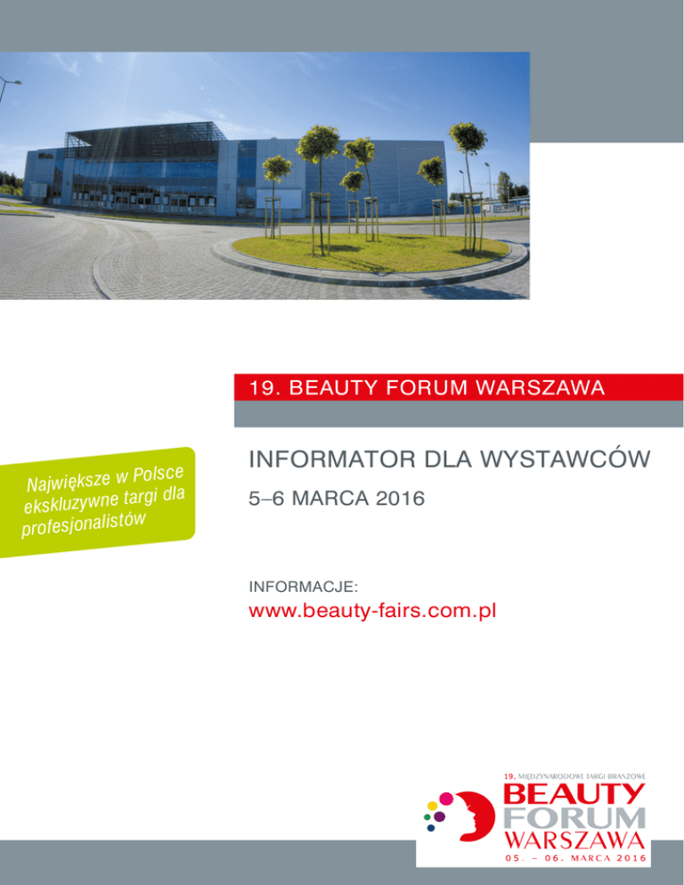 19. BEAUTY FORUM WARSZAWA Polsce w e z s k ię jw a N rgi dla ta e n w y z lu k s ek tów profesjonalis INFORMATOR DLA WYSTAWCÓW 5–6 MARCA 2016 INFORMACJE: www.beauty-fairs.com.pl POPRZEDNIA EDYCJA Targi BEAUTY FORUM 2015 Ponad 11 500 zainteresowanych profesjonalistów (wzrost o 15% w stosunku do roku 2014) 260 wystawców (wzrost o 5%) 9000 m2 powierzchni targowej (wzrost o 36%) 28 wykładów i warsztatów, w których wzięło udział blisko 1000 uczestników 5 ekscytujących mistrzostw, w tym 3 objęte międzynarodową klasyfikacją KOSMETYKA Opinie wystawców dotyczące Targów BEAUTY FORUM 2015 Targi Beauty Forum stanowią ważną pozycję w naszym kalendarzu wydarzeń branżowych. Otwierają sezon wiosenny i jesienny – czyli dwa najważniejsze dla branży okresy. Cenimy profesjonalną organizacją, indywidualne podejście do naszych potrzeb i oczekiwań, elastyczność oraz rozbudowane możliwości promocji marki wśród gości imprezy. Dziękujemy za długoletnią współpracę i z pozytywnym nastawieniem przygotowujemy się do kolejnej edycji. PAZNOKCIE KOSMETYKA/PODOLOGIA Wojciech Kmiecik Dyrektor Handlowy Bielenda Professional Największe Targi dla profesjonalistów z branży kosmetycznej. Zawsze pełne nowości. Wszystko zorganizowane i przygotowane od A do Z. Nie można w niech nie uczestniczyć. Zarówno z punktu widzenia wystawcy jak i odwiedzających. Powody, dla których powinno się wziąć udział w targach BEAUTY FORUM: wyselekcjonowana grupa biznesowych odwiedzających klarowny podział stref wystawienniczych szerokie możliwości promocyjne zarówno przed, po, jak i w trakcie targów profesjonalny organizator z ponad 19-letnim doświadczeniem na polskim rynku dr n. med. Mirosława Gałęcka MIRAEX Od wielu lat współpracujemy z firmą Health and Beauty Media w zakresie udziału w targach branżowych oraz zamieszczania materiałów prasowych w czasopismach BEAUTY FORUM i Nailpro. Nasze wieloletnie relacje cechuje pełen profesjonalizm, kreatywność , rzetelność i wiarygodność. W ciągu ostatnich lat nasza współpraca w zakresie Targów BEAUTY FORUM stała się jeszcze bardziej systematyczna i poukładana. Organizatorów cechuje również umiejętność skutecznego reagowania na niespodziewane sytuacje. Organizację Targów przez firmę Health and Beauty Media charakteryzuje bardzo wysoki standard realizacji. Małgorzata Ekert Właścicielka EKERT NAILS® STREFY TARGOWE Bądź z nami! Bądź obecny ze swoją marką i produktami w Warszawie! Targi BEAUTY FORUM oferują imprezę branżową na najwyższym poziomie z klarownym podziałem na strefę kosmetyczną i paznokciową. W tym wyjątkowym miejscu możesz spotkać się ze swoimi lojalnymi klientami, a poprzez zaprezentowanie produktów i usług zyskać całkiem nową grupę klientów. BEAUTY Najnowsze zabiegi i produkty z zakresu kosmetyki pielęgnacyjnej, dekoracyjnej, aparaturowej i podologii Grupy docelowe: salony kosmetyczne, farmy piękności, hotele wellness i spa, day spa, gabinety odnowy biologicznej, gabinety medycyny estetycznej, gabinety makijażu permanentnego, apteki, drogerie, szkoły kosmetyczne i studenci Program dodatkowy: – 19. Polskie Mistrzostwa Makijażu – 11. Konkurs Młodych Talentów o Puchar BLUE DIAMOND – 3. Konkurs Młodych Talentów o Puchar RED DIAMOND – Międzynarodowy Kongres Kosmetyczny (IFC) – Międzynarodowy Kongres Makijażu Permanentnego PAZNOKCIE Najnowsze produkty z zakresu pielęgnacji dłoni i stylizacji paznokci Grupy docelowe: studia manikiuru, salony kosmetyczne, drogerie, szkoły kosmetyczne i studenci Program dodatkowy: – 9. Mistrzostwa Nailart Trophy – 18. Polskie Mistrzostwa Modelowania Paznokci – Międzynarodowy Kongres Kosmetyczny (IFC) Fot.: iStock©/Carol, Gubcio Powierzchnia i preferowane wymiary stoiska pow. m² dł. x gł. mxm pow. m² dł. x gł. mxm pow. m² dł. x gł. mxm pow. m² dł. x gł. mxm niezabudowana zabudowana * Prosimy wpisać ilość zamawianych metrów w odpowiedniej rubryce Ceny stoisk Ceny stoisk Powierzchnia niezabudowana Typ stoiska: Szeregowe Narożne Półwyspowe Wyspowe Powierzchnia zabudowana Cena podstawowa netto PLN/m² 425,475,520,555,- Cena podstawowa netto PLN/m² Cena specjalna netto PLN/m² Typ stoiska: 405,- stoisko o pow. ≥ 15 m² 450,- stoisko o pow. ≥ 24 m² 470,- stoisko o pow. ≥ 42 m² 505,- stoisko o pow. ≥ 50 m² Szeregowe Narożne Półwyspowe Wyspowe 524,574,619,654,- Cena specjalna netto PLN/m² 504,- stoisko o pow. ≥ 15 m² 549,- stoisko o pow. ≥ 24 m² 569,- stoisko o pow. ≥ 42 m² 604,- stoisko o pow. ≥ 50 m² 1010% % rabatu,o zgłoszenie zostanie Od wskazanych powyżej powyżej cen cenza zapowierzchnię powierzchnięniezabudowaną niezabudowanąmożliwe możliwejest jestuzyskanie uzyskanie rabatu, ile o ile zgłoszenie dokonane 28.11. 2014 i jednocześnienastąpi nastąpizapłata zapłatazgodnie zgodniezzpkt. pkt.11 Uczestnictwa. zostanie dokonane dodo30.11.2015 r. ir.jednocześnie 11 Warunków Warunków Uczestnictwa. W celu zgłoszenia udziału firmy w targach prosimy o kontakt, bądź pobranie formularza zgłoszeniowego ze strony Napięcie V Cena netto PLN Moc kW Zamawiam podłączenie do zasilania elektrycznego www.beauty-fairs.com.pl 230 <3 243,Uwaga! Zgodnie z punktem 10 Warunków Uczestnictwa Każdy Wystawca Targów BEAUTY FORUM 2016 ma prawo do uzyskania 30% rabatu na zakupienie powierzchni w cenę powierzchni zabudowanej wkalkulowano podłączenie 3,01 – 9 375,wystawienniczej na targach BEAUTY FORUM LIPSK (23-24.04.2016). 400 elektryczne stoiska (230V). Podłączenie stoisk niezabudowanych 400 9,01 – 14 431,jest dodatkowo płatne i następuje po odbiorze instalacji na Zespół targowy stoisku przez elektryka Organizatora. Pozostaje doczas Państwa dyspozycji: Zamawiamy prezentacji naszej 400 Zamawiamy reklamę w katalogu firmy na scenie Meeting Point targowym Małgorzata Szulc Managing Director £ Czas 30 min. Cena 600 PLN + VAT £ 1/2 strony – Cena 1 525 PLN + V