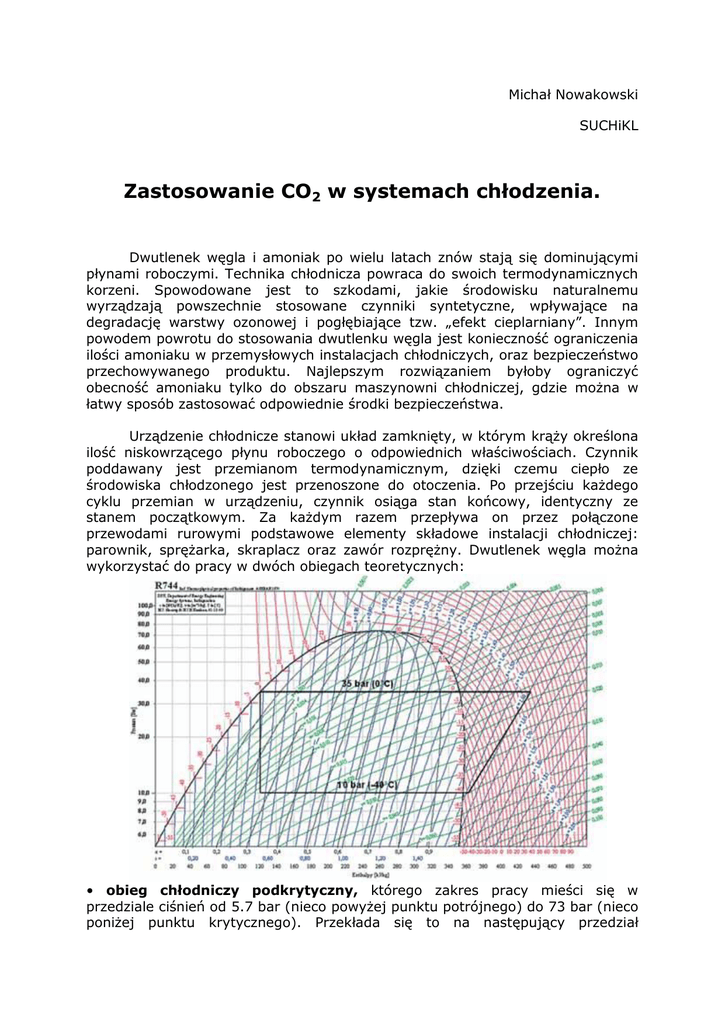 Michał Nowakowski SUCHiKL Zastosowanie CO2 w systemach chłodzenia. Dwutlenek węgla i amoniak po wielu latach znów stają się dominującymi płynami roboczymi. Technika chłodnicza powraca do swoich termodynamicznych korzeni. Spowodowane jest to szkodami, jakie środowisku naturalnemu wyrządzają powszechnie stosowane czynniki syntetyczne, wpływające na degradację warstwy ozonowej i pogłębiające tzw. „efekt cieplarniany”. Innym powodem powrotu do stosowania dwutlenku węgla jest konieczność ograniczenia ilości amoniaku w przemysłowych instalacjach chłodniczych, oraz bezpieczeństwo przechowywanego produktu. Najlepszym rozwiązaniem byłoby ograniczyć obecność amoniaku tylko do obszaru maszynowni chłodniczej, gdzie można w łatwy sposób zastosować odpowiednie środki bezpieczeństwa. Urządzenie chłodnicze stanowi układ zamknięty, w którym krąży określona ilość niskowrzącego płynu roboczego o odpowiednich właściwościach. Czynnik poddawany jest przemianom termodynamicznym, dzięki czemu ciepło ze środowiska chłodzonego jest przenoszone do otoczenia. Po przejściu każdego cyklu przemian w urządzeniu, czynnik osiąga stan końcowy, identyczny ze stanem początkowym. Za każdym razem przepływa on przez połączone przewodami rurowymi podstawowe elementy składowe instalacji chłodniczej: parownik, sprężarka, skraplacz oraz zawór rozprężny. Dwutlenek węgla można wykorzystać do pracy w dwóch obiegach teoretycznych: • obieg chłodniczy podkrytyczny, którego zakres pracy mieści się w przedziale ciśnień od 5.7 bar (nieco powyżej punktu potrójnego) do 73 bar (nieco poniżej punktu krytycznego). Przekłada się to na następujący przedział temperaturowy od –55ºC do 30ºC. Realizowany jest on za pomocą prostych układów chłodniczych, lecz jak widać jest mało korzystny z powodu ograniczeń wynikających z temperatur i wysokich ciśnień. Zazwyczaj układy realizujące obieg podkrytyczny pracują w przedziale ciśnień od 5.7 bar do 35 bar. • obieg chłodniczy trans krytyczny wykorzystywany jest w małych, komercyjnych układach chłodniczych, takich jak: klimatyzacja samochodowa (wypiera powoli czynnik R 134a z zastosowania klimatyzacyjnego w samochodach), małe pompy ciepła, klimatyzacja komfortu oraz układy chłodzenia w supermarketach • obieg dwustopniowy, to wykorzystanie w układzie chłodniczym obu poprzednich obiegów teoretycznych. Układy chłodzenia oparte na dwutlenku węgla stosowane w obiektach przemysłowych typu chłodnia składowa, konstruowane są w większości przypadków jako urządzenia kaskadowe. Układ kaskadowy jest połączeniem ze sobą przynajmniej dwóch oddzielnych obiegów chłodniczych, przy czym skraplacz pierwszego stopnia jest w nich jednocześnie parownikiem kolejnego stopnia. Ciepło odbierane w parowniku z przestrzeni chłodzonej jest przekazywane do otoczenia za pośrednictwem kolejnego obiegu, stanowiącego następny stopień kaskady. W każdym ze stopni kaskady może być realizowany zarówno obieg jedno-, jak i dwustopniowy, ponadto każdy ze stopni można napełnić innym rodzajem czynnika chłodniczego. Możliwość różnicowania czynników pozwala na dobór najbardziej odpowiedniego płynu roboczego do danego zakresu temperatur pracy, co stanowi jedną z najważniejszych zalet układów kaskadowych. Przemiany termodynamiczne zachodzące w dwustopniowym układzie kaskadowym przedstawia rysunek: Widoczne są na nim dwie pary krzywych granicznych, po jednej dla każdego czynnika. Jak widać, temperatura skraplania w dolnym stopniu przewyższa temperaturę parowania w górnym stopniu, co jest wynikiem założonego kierunku przekazywania ciepła. System chłodzenia opary na układzie kaskadowym NH3 – CO2 z dwutlenkiem węgla w części niskotemperaturowej. Układ chłodniczy niskotemperaturowy oparty na systemie kaskadowym z amoniakiem w górnym stopniu przedstawia rysunek: Jak widać, dolny stopień kaskady napełniony dwutlenkiem węgla jest systemem pompowym. W systemie tym ciekły CO2 pompowany jest z oddzielacza ciekłego czynnika do chłodnicy powietrza, gdzie częściowo odparowuje zanim powróci z powrotem do oddzielacza. Pary czynnika zasysane są i sprężane w sprężarce CO2, i skraplają się w kaskadowym wymienniku ciepła CO2 – NH3. Wymiennik ten jest skraplaczem dwutlenku węgla, i jednocześnie parownikiem amoniaku. Często spotykaną modyfi kacją tego typu rozwiązania technicznego, jest wykorzystywanie dodatkowej sprężarki dwutlenku węgla do oszraniania chłodnic powietrza gorącym gazem, co ilustruje rysunek: Zalety: - mała zawartość czynnika chłodniczego, w porównaniu z tradycyjnym układem amoniakalnym (napełnienie układu można zmniejszyć o około 1/10) - duża niezawodność ruchu - dobra efektywność energetyczna, aczkolwiek gorsza niż w systemach bezpośrednich - możliwość zastosowania różnych rodzajów czynników syntetycznych i naturalnych np.: NH3, izobutanu, propanu - objętość skokowa sprężarki CO2 jest 10 razy mniejsza od odpowiedniej sprężarki niskiego stopnia NH3 Wady: - dodatkowa energia niezbędna do napędu pomp - większa sieć przewodów wymagających izolacji zimnochronnej - większa liczba sprężarek konieczność stosowania dodatkowego urządzenia chłodniczego do utrzymywania niskiej temperatury w oddzielaczu podczas postoju układu Pośredni system chłodzenia. Dwutlenek węgla jako czynnik pośredni w instalacji amoniaku. Pośredni system chłodzenia jest realizowany przez dwa obiegi chłodnicze: obieg pierwotny i obieg wtórny. Obieg pierwotny często ograniczony jest do maszynowni chłodniczej, natomiast obieg wtórny realizuje chłodzenie komór chłodniczych. Oba obiegi są sprzęgnięte ze sobą poprzez parownik obiegu pierwotnego i ochładzacz chłodziwa obiegu wtórnego. W tym miejscu instalacji dokonuje się schładzanie czynnika wtórnego powracającego obiegiem wtórnym z odbiorników chłodu. Schem