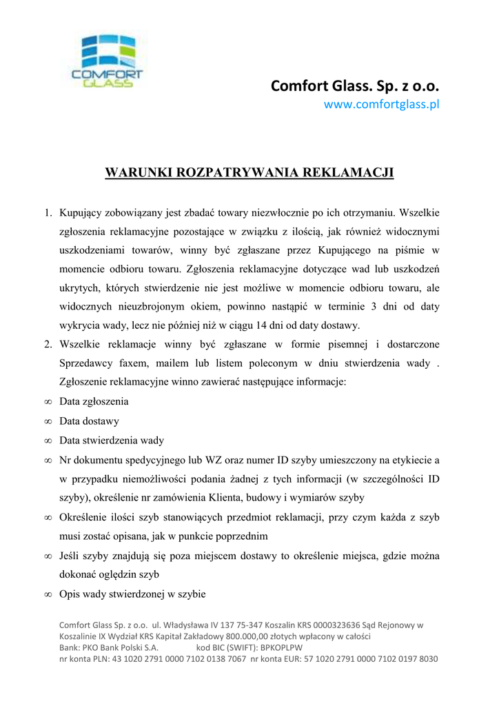 warunki rozpatrywania reklamacji - COMFORT GLASS