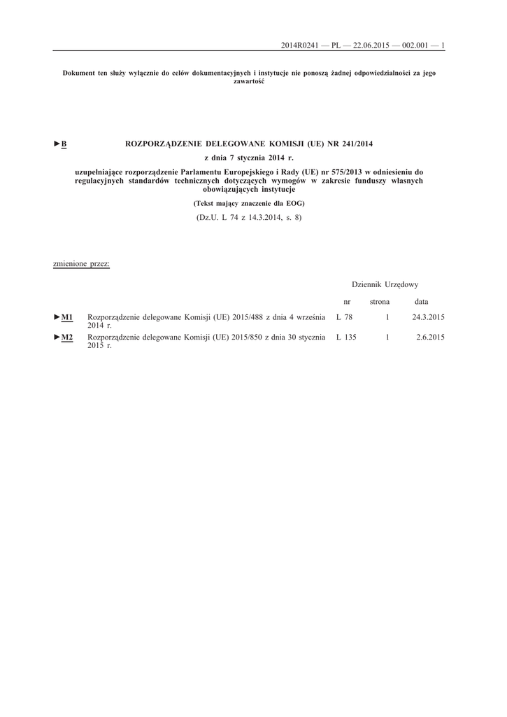 2014R0241 — PL — 22.06.2015 — 002.001 — 1 Dokument ten służy wyłącznie do celów dokumentacyjnych i instytucje nie ponoszą żadnej odpowiedzialności za jego zawartość ROZPORZĄDZENIE DELEGOWANE KOMISJI (UE) NR 241/2014 ►B z dnia 7 stycznia 2014 r. uzupełniające rozporządzenie Parlamentu Europejskiego i Rady (UE) nr 575/2013 w odniesieniu do regulacyjnych standardów technicznych dotyczących wymogów w zakresie funduszy własnych obowiązujących instytucje (Tekst mający znaczenie dla EOG) (Dz.U. L 74 z 14.3.2014, s. 8) zmienione przez: Dziennik Urzędowy ►M1 ►M2 Rozporządzenie delegowane Komisji (UE) 2015/488 z dnia 4 września 2014 r. Rozporządzenie delegowane Komisji (UE) 2015/850 z dnia 30 stycznia 2015 r. nr strona L 78 1 24.3.2015 L 135 1 2.6.2015 data 2014R0241 — PL — 22.06.2015 — 002.001 — 2 ▼B ROZPORZĄDZENIE DELEGOWANE 241/2014 KOMISJI (UE) NR z dnia 7 stycznia 2014 r. uzupełniające rozporządzenie Parlamentu Europejskiego i Rady (UE) nr 575/2013 w odniesieniu do regulacyjnych standardów technicznych dotyczących wymogów w zakresie funduszy własnych obowiązujących instytucje (Tekst mający znaczenie dla EOG) KOMISJA EUROPEJSKA, uwzględniając Traktat o funkcjonowaniu Unii Europejskiej, uwzględniając rozporządzenie Parlamentu Europejskiego i Rady (UE) nr 575/2013 z dnia 26 czerwca 2013 r. w sprawie wymogów ostrożno ściowych dla instytucji kredytowych i firm inwestycyjnych, zmieniające rozporządzenie (UE) nr 648/2012 (1), w szczególności jego art. 26 ust. 4 akapit trzeci, art. 27 ust. 2 akapit trzeci, art. 28 ust. 5 akapit trzeci, art. 29 ust. 6 akapit trzeci, art. 32 ust. 2 akapit trzeci, art. 36 ust. 2 akapit trzeci, art. 41 ust. 2 akapit trzeci, art. 52 ust. 2 akapit trzeci, art. 76 ust. 4 akapit trzeci, art. 78 ust. 5 akapit trzeci, art. 79 ust. 2 akapit trzeci, art. 83 ust. 2 akapit trzeci, art. 481 ust. 6 akapit trzeci oraz art. 487 ust. 3 akapit trzeci, a także mając na uwadze, co następuje: (1) Przepisy zawarte w niniejszym rozporządzeniu są ze sobą ściśle powiązane, ponieważ odnoszą się do wymogów w zakresie skład ników funduszy własnych obowiązujących instytucje oraz odli czeń od tych samych składników funduszy własnych na potrzeby stosowania rozporządzenia (UE) nr 575/2013. Aby zapewnić spójność między tymi przepisami, które powinny wejść w życie w tym samym czasie, oraz aby ułatwić całościowy wgląd w te przepisy i łatwy dostęp do nich osobom podlegającym tym obowiązkom, wskazane jest włączenie do jednego rozporządzenia wszystkich regulacyjnych standardów technicznych dotyczących wymogów w zakresie funduszy własnych, wymaganych na mocy rozporządzenia (UE) nr 575/2013. (2) Aby zwiększyć poziom konwergencji w Unii w zakresie sposobu odliczania możliwych do przewidzenia dywidend od zysków z bieżącego okresu lub zysków rocznych, należy ustalić hierar chię metod szacowania odliczeń: po pierwsze, decyzja o wypłacie zysków podjęta przez odpowiedni podmiot, po drugie, polityka w zakresie dywidend, i po trzecie, historyczny wskaźnik wypłat. (3) Poza ogólnymi wymogami w zakresie funduszy własnych doda nymi lub zmienionymi na mocy szczegółowych wymogów doty czących funduszy własnych nałożonych na te instytucje, okre ślenie warunków, zgodnie z którymi właściwe organy mogą uznać, że dany rodzaj przedsiębiorstwa uznawany na mocy mają cego zastosowanie prawa krajowego kwalifikuje się jako towa rzystwo ubezpieczeń wzajemnych, spółdzielnia, instytucja oszczędnościowa lub podobna instytucja do celów funduszy własnych jest niezbędne do ograniczenia ryzyka prowadzenia przez jakąkolwiek instytucję działalności jako towarzystwo (1) Dz.U. L 176 z 27.6.2013, s. 1. 2014R0241 — PL — 22.06.2015 — 002.001 — 3 ▼B ubezpieczeń wzajemnych, spółdzielnia, instytucja oszczędno ściowa lub podobna instytucja, która może podlegać szczegó łowym wymogom w zakresie funduszy własnych, w przypadku gdy taka instytucja nie posiada cech charakterystycznych dla instytucji unijnego sektora bankowości spółdzielczej. (4) W przypadku instytucji uznawanej na mocy mającego zastoso wanie prawa krajowego za towarzystwo ubezpieczeń wzajem nych, spółdzielnię, instytucję oszczędnościową lub podobną instytucję należy w niektórych przypadkach dokonać rozróżnienia między posiadaczami instrumentów w kapitale podstawowym Tier I instytucji a członkami takiej instytucji, ponieważ człon kowie muszą z reguły posiadać instrumenty kapitałowe, aby móc korzystać z prawa do dywidendy, jak również z prawa do części zysków i rezerw. (5) Ogólnie rzecz biorąc, cechą wspólną spółdzielni, instytucji oszczędnościowej, towarzystwa ubezpieczeń wzajemnych lub podobnej instytucji jest fakt, że prowadzą one działalność na rzecz klientów i członków instytucji, świadcząc również usługi na rzecz ogółu społeczeństwa. Podstawowym ich celem nie jest osiąganie i wypłacanie zysku finansowego zewnętrznym dostawcom kapitału, takim jak udziałowcy spółek akcyjnych. Z tego względu instrumenty kapitałowe wykorzystywane przez te instytucje różnią się od instrumentów kapitałowych emitowa nych przez spółki akcyjne, które zasadniczo przyznają posiada czom pełny dostęp do rezerw i zysków w przypadku kontynuacji działalności i likwidacji oraz podlegają zbyciu na rzecz osoby trzeciej. (6) Jeżeli chodzi o instytucje o charakterze spółdzielni, ich wspólną cechą jest zasadniczo fakt, że członkowie mogą zrezygnować z członkostwa, a tym samym zażądać wykupu posiadanych instrumentów w kapitale podstawowym Tier I. Nie uniemożliwia to spółdzielni emitowania instrumentów kapitałowych kwalifiku jących się jako instrumenty w kapitale podstawowym Tier I, w przypadku których nie ma możliwości, aby posiadacze mogli je zwrócić instytucji, pod warunkiem że takie instrumenty speł niają wymogi określone