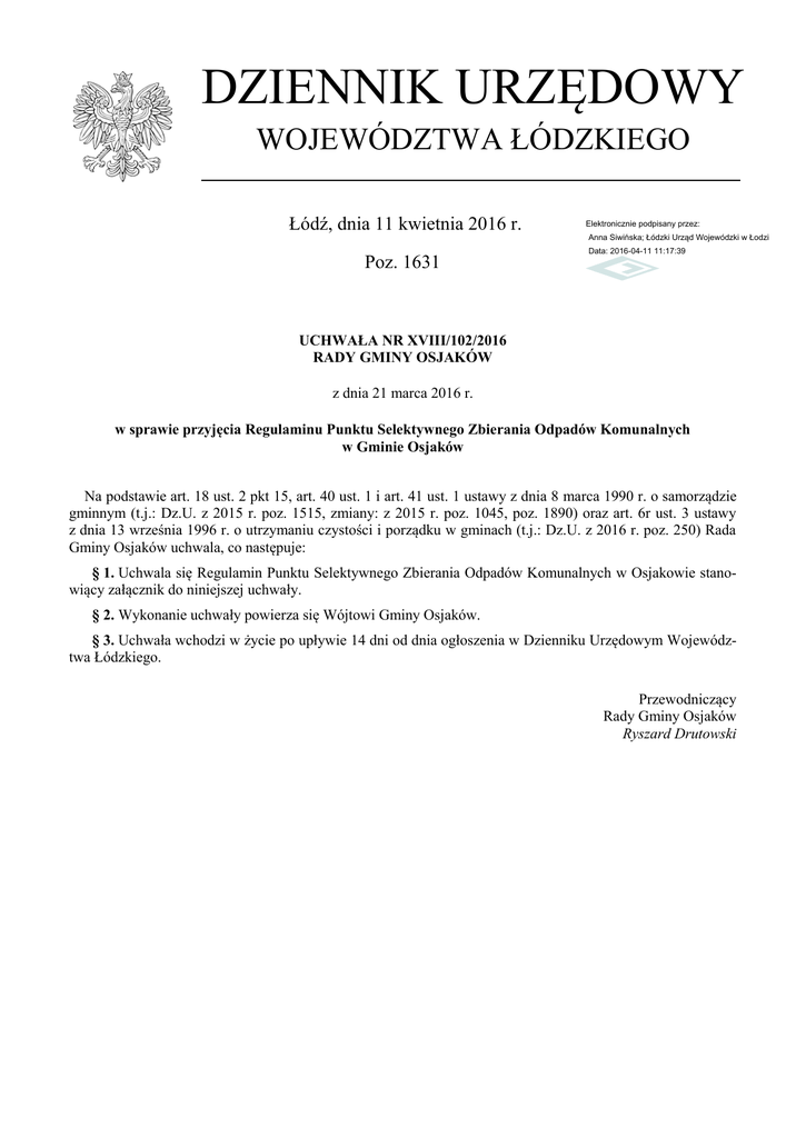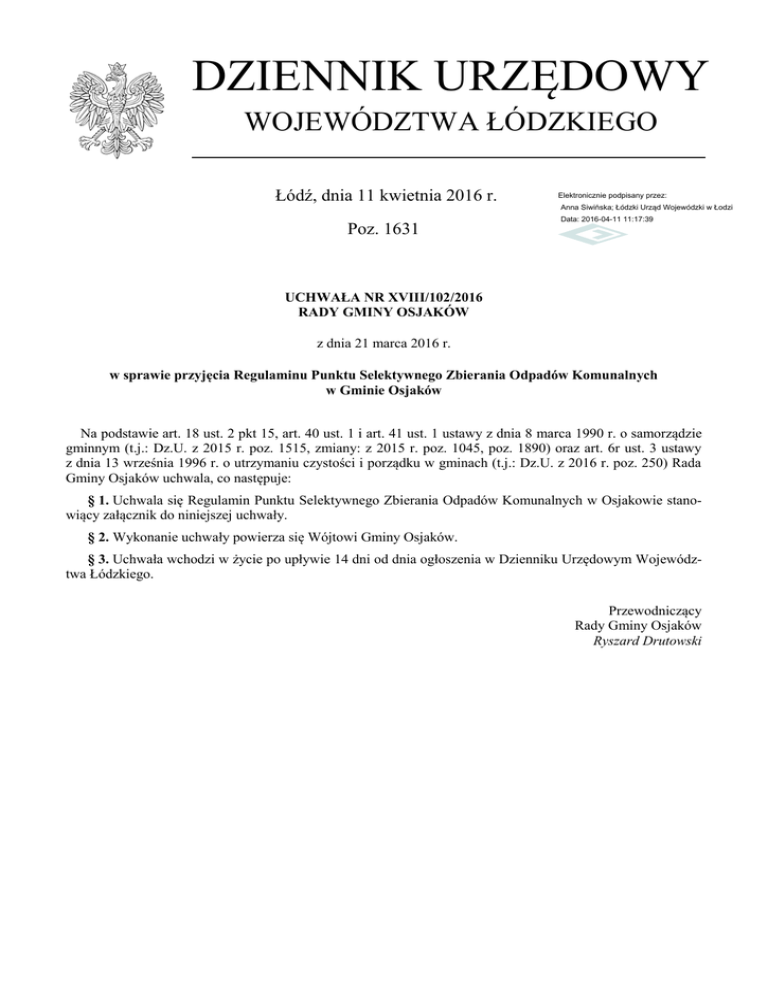 DZIENNIK URZĘDOWY WOJEWÓDZTWA ŁÓDZKIEGO Łódź, dnia 11 kwietnia 2016 r. Elektronicznie podpisany przez: Anna Siwińska; Łódzki Urząd Wojewódzki w Łodzi Poz. 1631 Data: 2016-04-11 11:17:39 UCHWAŁA NR XVIII/102/2016 RADY GMINY OSJAKÓW z dnia 21 marca 2016 r. w sprawie przyjęcia Regulaminu Punktu Selektywnego Zbierania Odpadów Komunalnych w Gminie Osjaków Na podstawie art. 18 ust. 2 pkt 15, art. 40 ust. 1 i art. 41 ust. 1 ustawy z dnia 8 marca 1990 r. o samorządzie gminnym (t.j.: Dz.U. z 2015 r. poz. 1515, zmiany: z 2015 r. poz. 1045, poz. 1890) oraz art. 6r ust. 3 ustawy z dnia 13 września 1996 r. o utrzymaniu czystości i porządku w gminach (t.j.: Dz.U. z 2016 r. poz. 250) Rada Gminy Osjaków uchwala, co następuje: § 1. Uchwala się Regulamin Punktu Selektywnego Zbierania Odpadów Komunalnych w Osjakowie stanowiący załącznik do niniejszej uchwały. § 2. Wykonanie uchwały powierza się Wójtowi Gminy Osjaków. § 3. Uchwała wchodzi w życie po upływie 14 dni od dnia ogłoszenia w Dzienniku Urzędowym Województwa Łódzkiego. Przewodniczący Rady Gminy Osjaków Ryszard Drutowski Dziennik Urzędowy Województwa Łódzkiego –2– Poz. 1631 Załącznik do uchwały nr XVIII/102/2016 Rady Gminy Osjaków z dnia 21 marca 2016 r. REGULAMIN PUNKTU SELEKTYWNEGO ZBIERANIA ODPADÓW KOMUNALNYCH W GMINIE OSJAKÓW Zasady ogólne § 1. 1. Regulamin określa szczegółowe zasady funkcjonowania Punktu Selektywnego Zbierania Odpadów Komunalnych w Gminie Osjaków, zwanym dalej PSZOK zlokalizowanym w Osjakowie przy ul. Wesołe Kąty 3. 2. Punkt Selektywnego Zbierania Odpadów Komunalnych przyjmuje nieodpłatnie selektywnie zebrane odpady komunalne z nieruchomości zamieszkałych wytworzone wyłącznie przez mieszkańców gminy Osjaków, z przeznaczeniem do unieszkodliwienia lub odzysku. 3. Odpady w PSZOK gromadzone są selektywnie, w specjalnie do tego przeznaczonych, oznakowanych pojemnikach, bądź w wyznaczonych miejscach w sposób bezpieczny dla zdrowia, ludzi i środowiska. 4. Korzystający z PSZOK zobowiązani są do bezwzględnego przestrzegania regulaminu, zasad BHP i ppoż. (w szczególności nie używania źródeł otwartego ognia) oraz poleceń pracownika punktu. 5. Na terenie PSZOK dzieci mogą przebywać jedynie pod opieką osoby pełnoletniej. Ustalenia szczegółowe § 2. 1. W PSZOK nie przyjmuje się zmieszanych odpadów komunalnych. 2. PSZOK przyjmuje odpady we wtorki i piątki od godziny 9.00 do godziny 11.00 oraz w pierwszą sobotę miesiąca w godzinach od 8.00 do 10.00. 3. PSZOK przyjmuje odpady tylko od mieszkańców gminy Osjaków po okazaniu ostatniego dowodu wpłaty opłaty za gospodarowanie odpadami komunalnymi. 4. Odpady dostarczone do PSZOK muszą być posegregowane i nie mogą być zanieczyszczone innymi odpadami. 5. Przyjęcia odpadów dokonuje pracownik obsługi PSZOK po sprawdzeniu zgodności dostarczonych odpadów z wykazem przyjmowanych odpadów. 6. Osoba dostarczająca odpady do PSZOK zobowiązana jest umieścić je w odpowiednich kontenerach pod nadzorem pracownika. 7. W PSZOK przyjmowane są wyłącznie odpady komunalne zebrane w sposób selektywny, w tym: 1) opakowania z papieru i tektury oraz papier i tektura; 2) metale; 3) tworzywa sztuczne; 4) opakowania szklane oraz szkło; 5) opakowania wielomateriałowe; 6) odpady ulegające biodegradacji (zielone); 7) zużyte baterie i akumulatory; 8) zużyty sprzęt elektryczny i elektroniczny; 9) przeterminowane leki; Dziennik Urzędowy Województwa Łódzkiego –3– Poz. 1631 10) zużyte opony samochodowe dla pojazdów o dopuszczalnej masie całkowitej do 3,5 tony, a większe rozmiary po wcześniejszym uzgodnieniu z pracownikiem do spraw gospodarki odpadami komunalnymi w Urzędzie Gminy w Osjakowie; 11) inne odpady wydzielone z grupy odpadów komunalnych (to jest: rozpuszczalniki, kwasy, alkalia, środki ochrony roślin, opakowania zawierające pozostałości substancji niebezpiecznych, farby, tusze, farby drukarskie, kleje, lepiszcze, żywic i detergenty); 12) odpady wielkogabarytowe w tym stolarka okienna i drzwiowa; 13) odpady budowlane i rozbiórkowe. 8. Odpady niebezpieczne płynne (np. chemikalia, farby, rozpuszczalniki, oleje odpadowe) lub odpady wymagające opakowania powinny znajdować się w oryginalnych opakowaniach producenta. Opakowania powinny posiadać etykiety i nie powinny być uszkodzone. 9. Odpady zielone tj. trawa, liście, ścinki gałęzi i żywopłotów przyjmowane są w workach foliowych. 10. Ilość nieodpłatnie przyjmowanych odpadów budowlanych i rozbiórkowych od właścicieli nieruchomości jest limitowana i wynosi do 3 m³ od nieruchomości na rok, za którą uiszczona została opłata w ciągu roku. Powyżej tej objętości właściciel nieruchomości zbiera ww. odpady w pojemnikach przeznaczonych do gromadzenia tego rodzaju odpadów, dostarczonych na jego wniosek przez przedsiębiorcę odbierającego. Podmiot odbierający ma obowiązek odebrać odpady za dodatkową opłatą, ustaloną w wyniku odrębnej umowy. 11. Zużyty sprzęt elektryczny i elektroniczny nie powinien być zdekompletowany. 12. W przypadku dostarczenia odpadów wymienionych w ust. 7 w formie nieposegregowanej, dostarczający odpady jest zobowiązany do ich posortowania w PSZOK, jeżeli odmówi ich posortowania obsługa Punktu, może odmówić przyjęcia odpadów. 13. Pracownik obsługi PSZOK może odmówić przyjęcia odpadów w przypadku, gdy istnieje uzasadnione podejrzenie, że odpady nie są odpadami komunalnymi powstałymi w gospodarstwie domowym. 14. Do PSZOK nie będą przyjmowane odpady budowlane i rozbiórkowe zawierające azbest, papę, smołę i inne odpady niebezpieczne. 15. Dostarczający odpady zobowiązany jest do natychmiastowego zabrania odpadów w przypadku: 1) stwierdzenia przez pracownika PSZOK, iż odpady dostarczone nie znajdują się w wykazie odpadów przyjmowanych; 2) stwierdzenia zanieczyszczeń i zabrudzeń w dostarczonych odpadach; 3) stwierdzenia braku możliwości ide