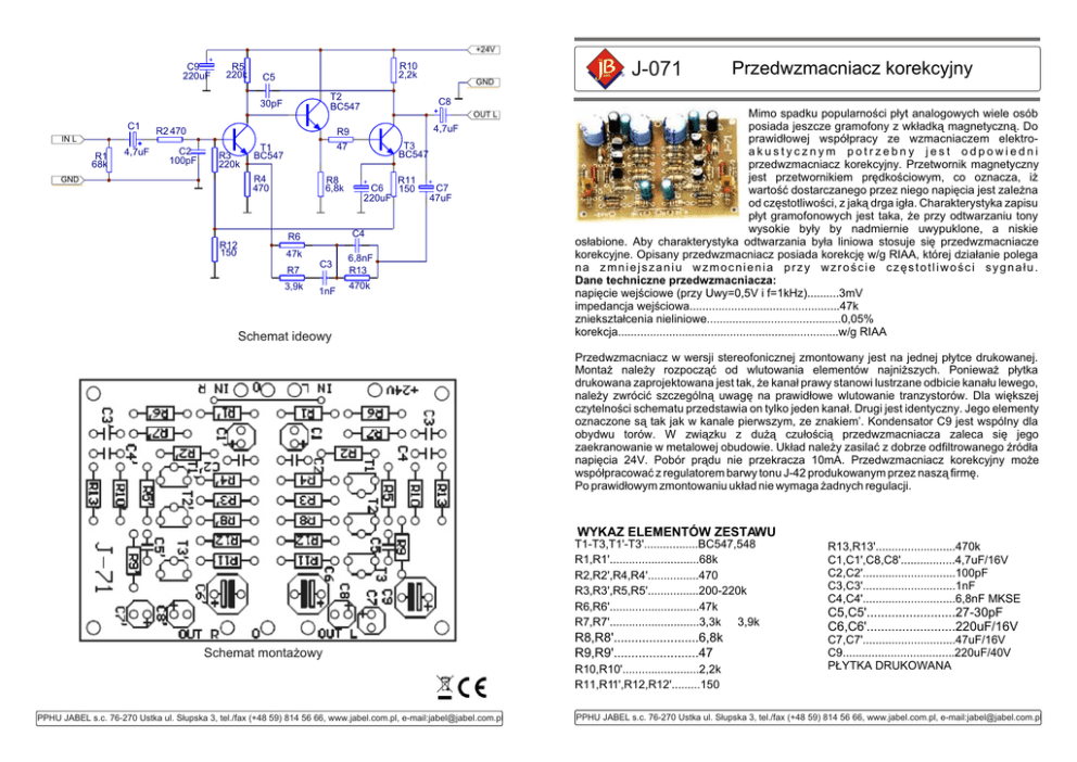 +24V C9 220uF R5 220k R10 2,2k C5 30pF C1 IN L R1 68k 4,7uF T2 BC547 C8 R9 4,7uF R2 470 C2 100pF R3 220k R12 150 OUT L T3 BC547 47 T1 BC547 R4 470 GND R8 6,8k 47k 3,9k R11 C6 150 220uF C7 47uF C4 R6 R7 JABEL GND C3 1nF 6,8nF R13 470k Schemat ideowy ® J-071 Przedwzmacniacz korekcyjny Mimo spadku popularnoœci p³yt analogowych wiele osób posiada jeszcze gramofony z wk³adk¹ magnetyczn¹. Do prawid³owej wspó³pracy ze wzmacniaczem elektroakustycznym potrzebny jest odpowiedni przedwzmacniacz korekcyjny. Przetwornik magnetyczny jest przetwornikiem prêdkoœciowym, co oznacza, i¿ wartoœæ dostarczanego przez niego napiêcia jest zale¿na od czêstotliwoœci, z jak¹ drga ig³a. Charakterystyka zapisu p³yt gramofonowych jest taka, ¿e przy odtwarzaniu tony wysokie by³y by nadmiernie uwypuklone, a niskie os³abione. Aby charakterystyka odtwarzania by³a liniowa stosuje siê przedwzmacniacze korekcyjne. Opisany przedwzmacniacz posiada korekcjê w/g RIAA, której dzia³anie polega na zmniejszaniu wzmocnienia przy wzroœcie czêstotliwoœci sygna³u. Dane techniczne przedwzmacniacza: napiêcie wejœciowe (przy Uwy=0,5V i f=1kHz)..........3mV impedancja wejœciowa...............................................47k zniekszta³cenia nieliniowe..........................................0,05% korekcja.....................................................................w/g RIAA Przedwzmacniacz w wersji stereofonicznej zmontowany jest na jednej p³ytce drukowanej. Monta¿ nale¿y rozpocz¹æ od wlutowania elementów najni¿szych. Poniewa¿ p³ytka drukowana zaprojektowana jest tak, ¿e kana³ prawy stanowi lustrzane odbicie kana³u lewego, nale¿y zwróciæ szczególn¹ uwagê na prawid³owe wlutowanie tranzystorów. Dla wiêkszej czytelnoœci schematu przedstawia on tylko jeden kana³. Drugi jest identyczny. Jego elementy oznaczone s¹ tak jak w kanale pierwszym, ze znakiem’. Kondensator C9 jest wspólny dla obydwu torów. W zwi¹zku z du¿¹ czu³oœci¹ przedwzmacniacza zaleca siê jego zaekranowanie w metalowej obudowie. Uk³ad nale¿y zasilaæ z dobrze odfiltrowanego Ÿród³a napiêcia 24V. Pobór pr¹du nie przekracza 10mA. Przedwzmacniacz korekcyjny mo¿e wspó³pracowaæ z regulatorem barwy tonu J-42 produkowanym przez nasz¹ firmê. Po prawid³owym zmontowaniu uk³ad nie wymaga ¿adnych regulacji. WYKAZ ELEMENTÓW ZESTAWU T1-T3,T1'-T3'.................BC547,548 R1,R1'............................68kW R2,R2',R4,R4'................470W R3,R3',R5,R5'................200-220kW R6,R6'............................47kW R7,R7'............................3,3kW-3,9kW Schemat monta¿owy PPHU JABEL s.c. 76-270 Ustka ul. S³upska 3, tel./fax (+48 59) 814 56 66, www.jabel.com.pl, e-mail:[email protected] R8,R8'........................6,8kW R9,R9'........................47W R10,R10'........................2,2kW R11,R11',R12,R12'.........150W R13,R13'.........................470kW C1,C1',C8,C8'.................4,7uF/16V C2,C2'.............................100pF C3,C3'.............................1nF C4,C4'.............................6,8nF MKSE C5,C5'.........................27-30pF C6,C6'.........................220uF/16V C7,C7'.............................47uF/16V C9...................................220uF/40V P£YTKA DRUKOWANA PPHU JABEL s.c. 76-270 Ustka ul. S³upska 3, tel./fax (+48 59) 814 56 66, www.jabel.com.pl, e-mail:[email protected]