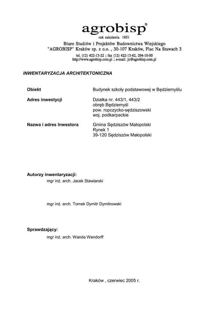 INWENTARYZACJA ARCHITEKTONICZNA Obiekt Budynek szkoły podstawowej w Będziemyślu Adres inwestycji Działka nr. 443/1, 443/2 obręb Będziemyśl pow. ropczycko-sędziszowski woj. podkarpackie Nazwa i adres Inwestora Gmina Sędziszów Małopolski Rynek 1 39-120 Sędziszów Małopolski Autorzy inwentaryzacji: mgr inŜ. arch. Jacek Stawiarski mgr inŜ. arch. Tomek Dymitr Dymitrowski Sprawdzający: mgr inŜ. arch. Wanda Wendorff Kraków , czerwiec 2005 r. SPIS TREŚCI : 1. Opis do inwentaryzacji architektonicznej 2. Rysunki architektoniczne 1. OPIS DO INWENTARYZACJI ARCHITEKTONICZNEJ 1.1 DANE OGÓLNE Podstawa opracowania: - Umowa o wykonanie prac projektowych - Wizja lokalna działki - Inwentaryzacja istniejącego obiektu - Obowiązujące normy i przepisy prawne Przedmiot opracowania Przedmiotem opracowania jest inwentaryzacja architektoniczna poddawanej remontowi starej części istniejącego budynku szkoły podstawowej w Będziemyślu Adres inwestycji Szkoła podstawowa w Będziemyślu, działka nr 443/1, 443/2 obręb Będziemyśl, pow. sędziszowsko-ropczycki, woj. podkarpackie Sytuacja i lokalizacja obiektu Zgodnie z załącznikiem mapowym (mapa ewidencyjna w skali 1:2000 ) szkoła zlokalizowana jest Będziemyślu na działkach nr 443/1 i 443/2 . Działki są ogrodzone, teren na działkach jest pochyły i z lekkim spadkiem w kierunku północnym. Dojazd do szkoły zapewnia droga powiatowa dz. nr 1055/1, bezpośredni wjazd na działki znajduje się od strony południowej. Opis zagospodarowania terenu Istniejący budynek to obiekt wolnostojący, dwukondygnacyjny, częściowo podpiwniczony, składający się z części starej, podlegającej remontowi i nowej, dobudowanej. Budynek przykryty jest dachem czterospadowym o kącie nachylenia 25°. Główne wejście do budynku znajduje się w części nowej od strony południowej, wejście techniczne od strony północnej. 1.2 DANE LICZBOWE Powierzchnia działek nr 443/1 i 443/2 na podstawie wypisu z rejestru gruntów : Działka nr 443/1 - 5700 m 2 Działka nr 443/2 - 500 m 2 Razem : - 6200 m 2 Stan istniejący / część remontowana / : Powierzchnia zabudowy Powierzchnia netto Kubatura Wysokoœæ zabudowy - 388,71 m2 - 673,88 m2 - 3479,52 m3 - 11,60 m 1.3 OPIS ARCHITEKTONICZNO-BUDOWLANY Charakterystyka ogólna Budynek szkoły jest budynkiem piętrowym, częściowo podpiwniczonym, wykonany jest w technologii tradycyjnej murowanej, ściany zewnętrzne i wewnętrzne budynku stanowią jego podłuŜny układ nośny, stropy drewniane, więźba dachowa drewniana płatwiowokleszczowa, przekrycie blachą ocynkowaną płaska. Przegrody zewnętrzne i wewnętrzne − ściany zewnętrzne parteru o grubości 60 cm i piętra o grubości 47 cm wykonane z cegły pełnej. − ściany wewnętrzne budynku wykonane z cegły. Dach i więźba dachowa Dach czterospadowy o kącie nachylenia 25°, konstrukcja więźby płatwiowo-kleszczowa, pokrycie dachowe to blacha ocynkowana płaska na deskowaniu pełnym. W miejscach przecieków z dachu i przy kominach stwierdzono zwiększoną korozję biologiczną elementów drugorzędnych więźby. − Schody wewnętrzne i zewnętrzne schody Ŝelbetowe . Stropy Strop nad parterem i piętrem drewniany belkowy, wykończony od góry deskami, od dołu tynkiem na trzcinie. Strop nad parterem wykazuje znaczne ugięcia, które zostały zmniejszone poprzez wykonane wzmocnienia tj. stalowy ruszt pod stropem w sali gimnastycznej oraz stalową belkę pod stropem holu. Strop nad piętrem nie wykazuje istotnych ugięć oraz uszkodzeń. W obydwu stropach występują uszkodzenia biologiczne odpowiadające wiekowi budynku, w stropie nad piętrem zwiększone w miejscach przecieków z dachu. Kominy − wykonane z cegły ceramicznej. Posadzki i podłogi − posadzki z desek, płytek ceramicznych , lastrico , wylewki betonowe i linoleum zgodnie z rysunkami architektonicznymi. Tynki i wykładziny wewnętrzne − wewnętrzne - cementowo-wapienne kat. III lub wykończenie płytkami ceramicznymi. Stolarka drzwiowa i okienna − stolarka drzwiowa - drewniana − okna : drewniane skrzynkowe /stare/ i PCV /nowe/, Parapety Przy oknach nowych z PCV parapety plastikowe, przy starych, drewnianych parapety lastrikowe. Parapety zewnętrzne z blachy ocynkowanej. Kraków maj 2005r mgr inŜ. arch. Jacek Stawiarski mgr inz. arch. Tomek Dymitr Dymitrowski