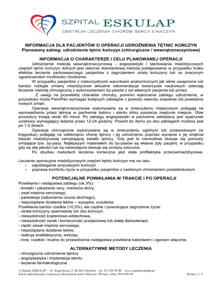 INFORMACJA DLA PACJENTÓW O OPERACJI UDROŻNIENIA TĘTNIC KOŃCZYN Planowany zabieg: udrożnienie tętnic kończyn (chirurgiczne / wewnątrznaczyniowe) INFORMACJA O CHARAKTERZE I CELU PLANOWANEJ OPERACJI Udrożnienie metodą wewnątrznaczyniową - angioplastyki i stentowania miażdżycowych zwężeń tętnic kończyn dolnych jest obecnie standardową metodą postępowania w przypadku braku efektów leczenia zachowawczego pacjentów z zagrożeniem utraty kończyny lub ze znacznym ograniczeniem możliwości chodzenia. W przypadku pacjentów z niekorzystnymi warunkami anatomicznymi jak silnie uwapnione lub bardzo rozległe zmiany miażdżycowe aktualne rekomendacje towarzystw naukowych zalecają leczenie metodą chirurgiczną z wykorzystaniem by-pasów z żył własnych pacjenta lub protez. . Z uwagi na przewlekły charakter choroby, pomimo wykonania zabiegu udrożnienia, w przyszłości może Pani/Pan wymagać kolejnych zabiegów z powodu nawrotu zwężenia lub powstania nowych zmian. Operacje wewnątrznaczyniowe wykonywane są w znieczuleniu miejscowym polegają na wprowadzeniu przez tętnicę w pachwinie balonu i stentu który poszerza zwężone miejsce. Obie procedury trwają około 60 minut. Po zabiegu angioplastyki w pachwinie zakładany jest opatrunek uciskowy wymagający leżenia przez 12-24 godziny. Powrót do domu po obu zabiegach możliwy jest po 1-2 dniach. Operacje chirurgiczne wykonywane są w znieczuleniu ogólnym lub przewodowym (w kręgosłup) polegają na odsłonięciu chorej tętnicy i jej udrożnieniu poprzez wycięcie z jej wnętrza blaszki miażdżycowej zamykającej światło tętnicy. Gdy jest to niemożliwe stosuje się pomosty omijające tzw. by-pasy. Najlepszym materiałem do by-pasów są własne żyły pacjent, w przypadku gdy są złej jakości lub są niedostępne stosuje się protezy sztuczne. Po obydwu metodach leczenia konieczna jest stała profilaktyka przeciwmiażdżycowa. Leczenie operacyjne miażdżycowych zwężeń tętnic kończyn ma na celu: ▪ zapobieganie amputacjom kończyn ▪ poprawę komfortu życia w przypadku pacjentów z nasilonym chromaniem przestankowym POTENCJALNE POWIKŁANIA W TRAKCIE I PO OPERACJI Powikłania i następstwa zabiegu (ok.3%): - krwiaki i zakażenie rany, martwica skóry, - zwał mięśnia sercowego, - parestezje (zaburzenia czucia skórnego), - niepożądane działania leków – wysypka, uczulenia. Powikłania bardzo rzadkie (<0,5%), ale ciężkie i powodujące zagrożenie życia: - utrata kończyny operowanej lub obu kończyn, - niewydolność krążeniowo-oddechowa, - niewydolność nerek i konieczność przejściowej lub stałej dializoterapii, - ciężki zawał mięśnia sercowego, - niepożądane działania leków, - reakcja anafilaktyczna, wstrząs, - inne, rzadkie i trudne do przewidzenia następstwa powikłane kalectwem i zgonem włącznie. ALTERNATYWNE METODY LECZENIA - chirurgiczne udrożnienie tętnicy - angioplastyka i implantacja stentu - leczenie farmakologiczne © Szpital ESKULAP – Ul. Koperkowa 2, 86-031 Osielsko tel. 52 326 58 00 www.szpitaleskulap.pl Karta informacyjna o operacji udrożnienia tętnic kończyn. Wersja z dnia 2014-08-04 Strona 1 z 2 INFORMACJA DLA PACJENTÓW O OPERACJI UDROŻNIENIA TĘTNIC KOŃCZYN Planowany zabieg: udrożnienie tętnic kończyn (chirurgiczne / wewnątrznaczyniowe) INFORMACJA O SPOSOBIE PRZYGOTOWANIA DO OPERACJI Do Szpitala należy zabrać ze sobą: o dowód osobisty, o przybory toaletowe, piżamę, obuwie antypoślizgowe o skierowanie do szpitala o zaświadczenie o szczepieniu przeciwko żółtaczce, o karty informacyjne z wcześniejszych pobytów w szpitalu, o opinię kardiologa o braku przeciwwskazań do zabiegu ▪ z wynikiem badania ECHO serca, ekg o opinię neurologa o braku przeciwwskazań do operacji o zaświadczenie od stomatologa o sanacji jamy ustnej o w przypadku chorób przewlekłych - opinia o braku przeciwwskazań do operacji, o spis zażywanych leków o insuliny i inne leki zażywane na stałe o wyniki następujących badań: - USG doppler tętnic kończyn dolnych - RTG płuc - krewkarta ewentualnie grupa krwi - morfologia krwi z płytkami - APTT, INR - antygen Hbs, przeciwciała anty-HCV - w przypadku zabiegów wewnątrznaczyniowych: kreatynina + TSH - innych badań (jeśli zostały zlecone przez chirurga naczyniowego lub anestezjologa) ● W przypadku zażywania leku zmieniającego krzepliwość krwi: jak, Warfin, Sintrom, Acenocumarol, Arixtra, Xarelto, podczak wizyty kwalifikacyjnej lub najpóźniej na 10 dni przed zabiegiem należy poinformować o tym chirurga wykonującego zabieg i anestezjologa. ● Standardowo operacje wykonywane są następnego dnia po przyjęciu do Szpitala ● W dniu operacji należy nie jeść ani nie żuć gumy przez 6 godzin przed operacją. Można pić wodę niegazowaną do 4 godzin przed operacją. ● Pacjent opuszcza szpital w towarzystwie opiekuna po 1- 7 dniach po operacji ● Przez 24 godziny po zabiegu nie wolno spożywać alkoholu, prowadzić pojazdów mechanicznych, ani podejmować ważnych życiowo decyzji ● Wizyta kontrolna odbywa się w terminie 5-10 dni po zabiegu – prosimy sprawdzić miejsce, datę i godzinę wizyty kontrolnej na otrzymanej po zabiegu Karcie Informacyjnej ● Po operacji wewnątrznaczyniowej wizyty kontrolne z badaniem USG doppler zalecane są po 1, 3, 6 i 12 miesiącach. ● Po operacji chirurgicznej wizyty kontrolne z badaniem USG doppler zalecane są po 1, 6 i 12 miesiącach. W przypadku wątpliwości, prosimy o kontakt z koordynatorem leczenia szpitalnego tel. 52 326-58-00 (czynne w godz. 8 - 20) © Szpital ESKULAP – Ul. Koperkowa 2, 86-031 Osielsko tel. 52 326 58 00 www.szpitaleskulap.pl Karta informacyjna o operacji udrożnienia tętnic kończyn. Wersja z dnia 2014-08-04 Strona 2 z 2