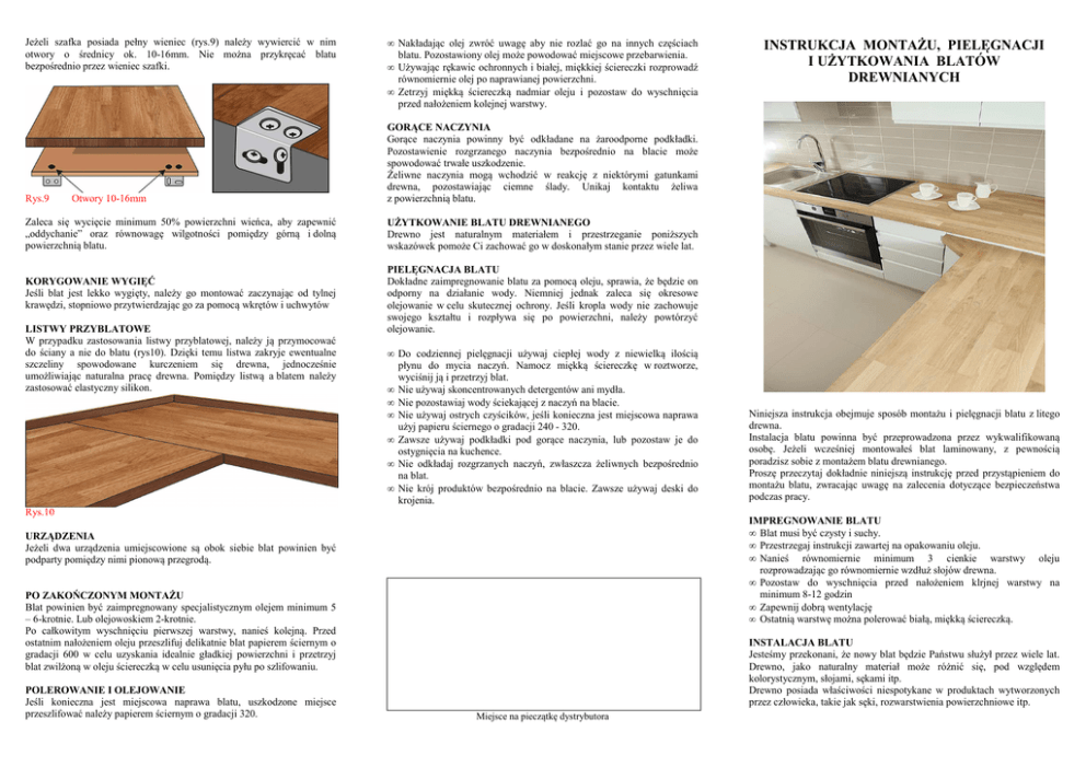 Jeżeli szafka posiada pełny wieniec (rys.9) należy wywiercić w nim otwory o średnicy ok. 10-16mm. Nie można przykręcać blatu bezpośrednio przez wieniec szafki. Rys.9 Otwory 10-16mm Zaleca się wycięcie minimum 50% powierzchni wieńca, aby zapewnić „oddychanie” oraz równowagę wilgotności pomiędzy górną i dolną powierzchnią blatu. KORYGOWANIE WYGIĘĆ Jeśli blat jest lekko wygięty, należy go montować zaczynając od tylnej krawędzi, stopniowo przytwierdzając go za pomocą wkrętów i uchwytów LISTWY PRZYBLATOWE W przypadku zastosowania listwy przyblatowej, należy ją przymocować do ściany a nie do blatu (rys10). Dzięki temu listwa zakryje ewentualne szczeliny spowodowane kurczeniem się drewna, jednocześnie umożliwiając naturalna pracę drewna. Pomiędzy listwą a blatem należy zastosować elastyczny silikon. • Nakładając olej zwróć uwagę aby nie rozlać go na innych częściach blatu. Pozostawiony olej może powodować miejscowe przebarwienia. • Używając rękawic ochronnych i białej, miękkiej ściereczki rozprowadź równomiernie olej po naprawianej powierzchni. • Zetrzyj miękką ściereczką nadmiar oleju i pozostaw do wyschnięcia przed nałożeniem kolejnej warstwy. GORĄCE NACZYNIA Gorące naczynia powinny być odkładane na żaroodporne podkładki. Pozostawienie rozgrzanego naczynia bezpośrednio na blacie może spowodować trwałe uszkodzenie. Żeliwne naczynia mogą wchodzić w reakcję z niektórymi gatunkami drewna, pozostawiając ciemne ślady. Unikaj kontaktu żeliwa z powierzchnią blatu. UŻYTKOWANIE BLATU DREWNIANEGO Drewno jest naturalnym materiałem i przestrzeganie poniższych wskazówek pomoże Ci zachować go w doskonałym stanie przez wiele lat. PIELĘGNACJA BLATU Dokładne zaimpregnowanie blatu za pomocą oleju, sprawia, że będzie on odporny na działanie wody. Niemniej jednak zaleca się okresowe olejowanie w celu skutecznej ochrony. Jeśli kropla wody nie zachowuje swojego kształtu i rozpływa się po powierzchni, należy powtórzyć olejowanie. • Do codziennej pielęgnacji używaj ciepłej wody z niewielką ilością płynu do mycia naczyń. Namocz miękką ściereczkę w roztworze, wyciśnij ją i przetrzyj blat. • Nie używaj skoncentrowanych detergentów ani mydła. • Nie pozostawiaj wody ściekającej z naczyń na blacie. • Nie używaj ostrych czyścików, jeśli konieczna jest miejscowa naprawa użyj papieru ściernego o gradacji 240 - 320. • Zawsze używaj podkładki pod gorące naczynia, lub pozostaw je do ostygnięcia na kuchence. • Nie odkładaj rozgrzanych naczyń, zwłaszcza żeliwnych bezpośrednio na blat. • Nie krój produktów bezpośrednio na blacie. Zawsze używaj deski do krojenia. Rys.10 Niniejsza instrukcja obejmuje sposób montażu i pielęgnacji blatu z litego drewna. Instalacja blatu powinna być przeprowadzona przez wykwalifikowaną osobę. Jeżeli wcześniej montowałeś blat laminowany, z pewnością poradzisz sobie z montażem blatu drewnianego. Proszę przeczytaj dokładnie niniejszą instrukcję przed przystąpieniem do montażu blatu, zwracając uwagę na zalecenia dotyczące bezpieczeństwa podczas pracy. IMPREGNOWANIE BLATU • Blat musi być czysty i suchy. • Przestrzegaj instrukcji zawartej na opakowaniu oleju. • Nanieś równomiernie minimum 3 cienkie warstwy oleju rozprowadzając go równomiernie wzdłuż słojów drewna. • Pozostaw do wyschnięcia przed nałożeniem klrjnej warstwy na minimum 8-12 godzin • Zapewnij dobrą wentylację • Ostatnią warstwę można polerować białą, miękką ściereczką. URZĄDZENIA Jeżeli dwa urządzenia umiejscowione są obok siebie blat powinien być podparty pomiędzy nimi pionową przegrodą. PO ZAKOŃCZONYM MONTAŻU Blat powinien być zaimpregnowany specjalistycznym olejem minimum 5 – 6-krotnie. Lub olejowoskiem 2-krotnie. Po całkowitym wyschnięciu pierwszej warstwy, nanieś kolejną. Przed ostatnim nałożeniem oleju przeszlifuj delikatnie blat papierem ściernym o gradacji 600 w celu uzyskania idealnie gładkiej powierzchni i przetrzyj blat zwilżoną w oleju ściereczką w celu usunięcia pyłu po szlifowaniu. POLEROWANIE I OLEJOWANIE Jeśli konieczna jest miejscowa naprawa blatu, uszkodzone miejsce przeszlifować należy papierem ściernym o gradacji 320. INSTRUKCJA MONTAŻU, PIELĘGNACJI I UŻYTKOWANIA BLATÓW DREWNIANYCH INSTALACJA BLATU Jesteśmy przekonani, że nowy blat będzie Państwu służył przez wiele lat. Drewno, jako naturalny materiał może różnić się, pod względem kolorystycznym, słojami, sękami itp. Drewno posiada właściwości niespotykane w produktach wytworzonych przez człowieka, takie jak sęki, rozwarstwienia powierzchniowe itp. Miejsce na pieczątkę dystrybutora Są one traktowane jako naturalne właściwości drewna i z reguły nie obniżają właściwości użytkowych blatu. Zmiany wilgotności powodują naturalne kurczenie i rozszerzanie się drewna. Z tego powodu blat drewniany nie może być dopasowany pomiędzy ścianami, bez dylatacji umożliwiających naturalną pracę drewna. Blaty z litego drewna są naturalnym produktem i podobnie jak nie ma dwóch identycznych odcisków palców, tak nie ma dwóch takich samych blatów. Należy zwrócić uwagę, że poniższe cechy są naturalne dla drewna: • różnice kolorystyczne • różnice w usłojeniu • możliwe występowanie sęków • drewno z czasem ciemnieje • drewno jest odporne na zachlapanie ale nie jest wodoodporne. • słoje drewna mogą się podnieść, jeśli zostaną zalane wodą przez dłuższy czas • wszelkie zachlapania powinny zostać natychmiast usunięte W momencie olejowania tworzy się warstwa ochronna, która jednak z czasem traci swoje właściwości. Dlatego zaleca się olejowanie blatu raz na kilka miesięcy. ZANIM ROZPOCZNIESZ PRACE • Sprawdź blat czy nie jest uszkodzony (krawędzie, powierzchnia, inne uszkodzenia) • Sprawdź czy posiadasz wszystkie niezbędne do montażu narzę