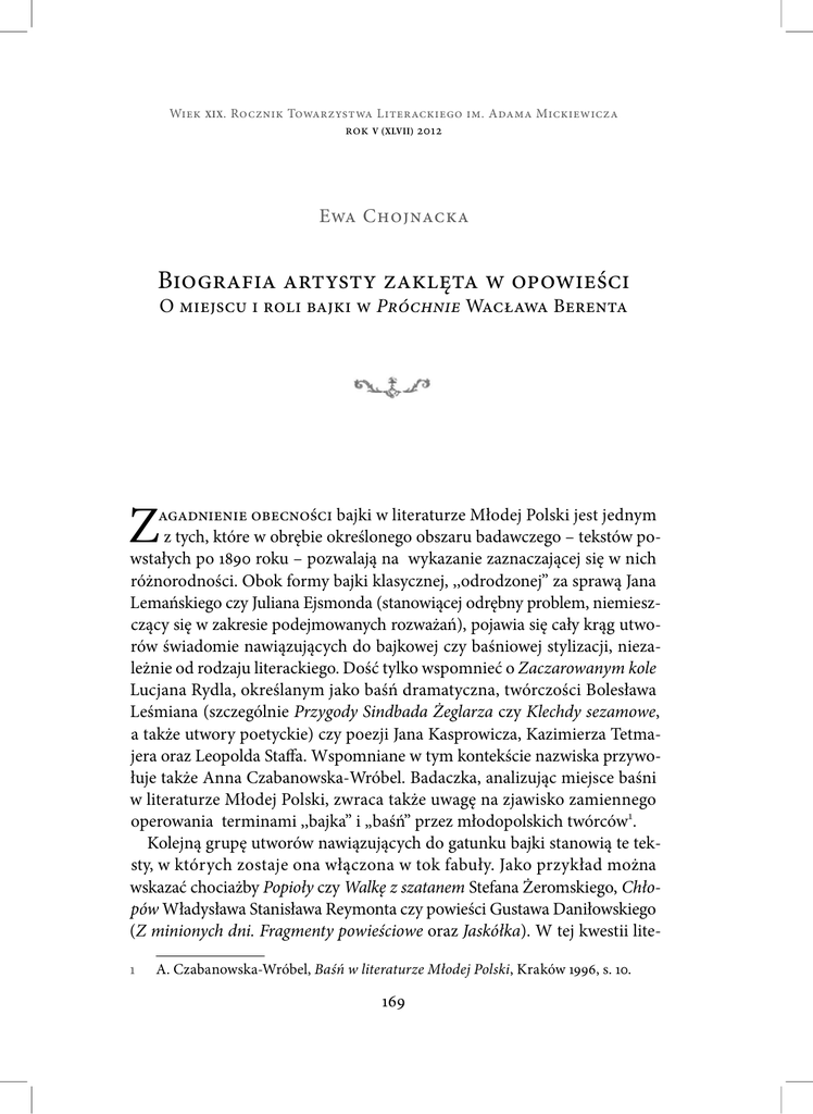 Wiek XIX . Rocznik Towarzystwa Literackiego im. Adama Mickiewicza rok V (XLVII) 2012 Ewa Chojnacka Biografia artysty zaklęta w opowieści O miejscu i roli bajki w Próchnie Wacława Berenta Z agadnienie obecności bajki w literaturze Młodej Polski jest jednym z tych, które w obrębie określonego obszaru badawczego – tekstów powstałych po 1890 roku – pozwalają na wykazanie zaznaczającej się w nich różnorodności. Obok formy bajki klasycznej, ,,odrodzonej” za sprawą Jana Lemańskiego czy Juliana Ejsmonda (stanowiącej odrębny problem, niemieszczący się w zakresie podejmowanych rozważań), pojawia się cały krąg utworów świadomie nawiązujących do bajkowej czy baśniowej stylizacji, niezależnie od rodzaju literackiego. Dość tylko wspomnieć o Zaczarowanym kole Lucjana Rydla, określanym jako baśń dramatyczna, twórczości Bolesława Leśmiana (szczególnie Przygody Sindbada Żeglarza czy Klechdy sezamowe, a także utwory poetyckie) czy poezji Jana Kasprowicza, Kazimierza Tetmajera oraz Leopolda Staffa. Wspomniane w tym kontekście nazwiska przywołuje także Anna Czabanowska-Wróbel. Badaczka, analizując miejsce baśni w literaturze Młodej Polski, zwraca także uwagę na zjawisko zamiennego operowania terminami ,,bajka” i „baśń” przez młodopolskich twórców1. Kolejną grupę utworów nawiązujących do gatunku bajki stanowią te teksty, w których zostaje ona włączona w tok fabuły. Jako przykład można wskazać chociażby Popioły czy Walkę z szatanem Stefana Żeromskiego, Chłopów Władysława Stanisława Reymonta czy powieści Gustawa Daniłowskiego (Z minionych dni. Fragmenty powieściowe oraz Jaskółka). W tej kwestii lite1 A. Czabanowska-Wróbel, Baśń w literaturze Młodej Polski, Kraków 1996, s. 10. 169 • Ewa Chojnacka • ratura Młodej Polski podkreśla swój dialog z epoką wcześniejszą. Taki sposób wykorzystania bajki w dziele ujawniał się przecież w twórczości pozytywistów – Lalce Bolesława Prusa, W zimowy wieczór Elizy Orzeszkowej, Dewajtis Marii Rodziewiczówny, Zającu Adolfa Dygasińskiego – dla których z pewnością nie bez znaczenia były najpierw ,,bajkowe” zainteresowania romantyków, przyczyniających się do popularyzacji takiej formy wypowiedzi poprzez balladę osnutą na jakiejś niesamowitej opowieści, dostrzeżenie ogromnej roli bajki jako nośnika dla wyrażenia pewnych ogólnych prawd, jak w Kordianie Juliusza Słowackiego (O Janku co psom szył buty) czy w Dziadach części III Adama Mickiewicza (O diable i zbożu). Żywe zwrócenie się ku bajce związane było też z działaniami Oskara Kolberga2. Bajka, ujawniająca się w takiej postaci, często służyła jako parabola odzwierciedlająca losy bohaterów. Czabanowska-Wróbel szczególnie wskazuje na Lalkę Prusa, w której opowieść o pannie śpiącej na dnie potoku i rycerzu zdradza ciążenie ku modernizmowi3. Z jednej strony bajka, będąca elementem kształtowania fabuły, z drugiej sytuacja, w jakiej bajka dochodzi do głosu w przestrzeni dzieła literackiego (przeważnie w zainicjowanej przez bohaterów sytuacji opowiadania), powoduje, że można mówić tu o pewnej ciągłości. Poczynione spostrzeżenia są niezbędne, aby podjąć właściwą refleksję nad miejscem i rolą bajki zawartej w Próchnie Wacława Berenta – powieści określanej jako „artystowska”. Ze względu na podejmowany temat, którym jest diagnoza kondycji sztuki i pozycji uprawiającego ją artysty, a także sposób jego realizacji, dzieło to niejednokrotnie uważano za dokument wiernie odzwierciedlający modernistyczną rzeczywistość, tak pod względem ideowym, jak i formalnym4. Tym bardziej ciekawe jest, że wśród wielorakich nowatorskich tendencji, zawartych w tej powieści, pojawia się opowieść O księżniczce Bratumile, witeziu Niezamyślu i świętym Jacławie rzecz prawdziwa stylizowana na średniowieczną historię o księżniczce i zakochanym w niej rycerzu. Właściwa analiza miejsca i sposobu funkcjonowania wspomnianej bajki w powieści Berenta musi jednak zostać poprzedzona rozważaniami natury genologicznej. Historia o perypetiach witezia i księżniczki nie jest bowiem bajką sensu stricto, raczej można ją potraktować jako ,,wypadkową” różnych gatunków, takich jak średniowieczna legenda, bajka, w mniejszym stopniu baśń. W tym względzie ujawnia się problem zbieżności kryteriów klasyfikacji 2 3 4 J. Krzyżanowski, Pogłosy bajki w literaturze polskiej, w: tegoż, W świecie bajki ludowej, Warszawa 1980, s. 217. A. Czabanowska-Wróbel, dz. cyt., s. 46. M. Głowiński, Powieść młodopolska. Studium z poetyki historycznej, Wrocław 1969, s. 174. 170 • Biografia artysty zaklęta w opowieści • wymienionych gatunków. Przypisywanie danej opowieści funkcji ,,nośnika” treści fabularnych sytuuje ją w obrębie cech właściwych zarówno legendzie, jak i baśni czy mitom5. Jednocześnie zaznacza się pewna labilność między terminami ,,bajka” i ,,baśń” w przypadku, gdy ,,bajka” staje się pojęciem szerszym, obejmującym również baśń6. Zarówno świat bajki, jak i baśni operuje przecież zmyśleniem, często też wyrasta z ustnej tradycji ludowej. Wyróżnikiem baśni jest z góry założona i traktowana jako normalny stan rzeczy cudowność7, która w bajce prawie nie występuje. Taki wyróżnik stanowi również nadanie bohaterom imion, czego nie spotyka się w baśni, a co jest znamienne dla bajki (także legendy). Bajka często staje się nośnikiem określonych treści, odzwierciedleniem ogólnej prawdy, nie zawsze wypowiedzianej wprost, ale ujawniającej się poprzez losy jej bohaterów. Janina Abramowska, analizując kwestie gatunku w kontekście bajki ezopowej w ujęciu diachronicznym, wskazuje na liczne leksykalne przesunięcia terminu „bajka”8. Jej miejsce w płaszczyźnie genologicznej wiąże z sytuacją opowiadania oraz z jej folklorystyczną proweniencją. Podobnie jak fabula, po