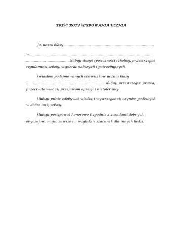 TREŚĆ ROTY ŚLUBOWANIA UCZNIA Ja, uczeń klasy……………………………………………………………………… w………………………………………………………………………………………………… …………………………………ślubuję służyć społeczności szkolnej, przestrzegać regulaminu szkoły, wspierać słabszych i potrzebujących. Świadom podejmowanych obowiązków ucznia klasy ……………………… …………………………………… ślubuję przestrzegać prawa, przeciwstawiać się przejawom agresji i nietolerancji. Ślubuję pilnie zdobywać wiedzę i wystrzegać się czynów godzących w dobre imię szkoły. Ślubuję postępować honorowo i zgodnie z zasadami dobrych obyczajów, mając zawsze na względzie szacunek dla innych ludzi.