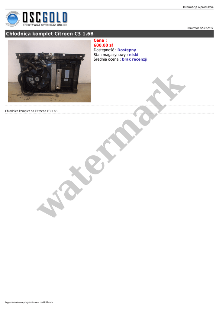 Informacje o produkcie Utworzono 02-03-2017 Chłodnica komplet Citroen C3 1.6B Cena : 600,00 zł w at Chłodnica komplet do Citroena C3 1.6B er m ar k Dostępność : Dostępny Stan magazynowy : niski Średnia ocena : brak recenzji Wygenerowano w programie www.oscGold.com