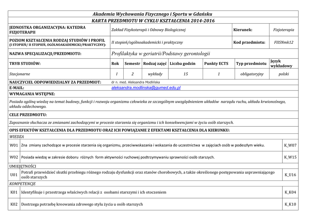 Akademia Wychowania Fizycznego i Sportu w Gdańsku KARTA PRZEDMIOTU W CYKLU KSZTAŁCENIA 2014-2016 JEDNOSTKA ORGANIZACYJNA: KATEDRA FIZJOTERAPII Zakład Fizykoterapii i Odnowy Biologicznej Kierunek: Fizjoterapia POZIOM KSZTAŁCENIA RODZAJ STUDIÓW I PROFIL II stopień/ogólnoakademicki i praktyczny Kod przedmiotu: FIISNmk12 NAZWA SPECJALIZACJI/PRZEDMIOTU: Profilaktyka w geriatrii/Podstawy gerontologii TRYB STUDIÓW: Rok Typ przedmiotu Język wykładowy (I STOPIEŃ/ II STOPIEŃ, OGÓLNOAKADEMICKI/PRAKTYCZNY): Stacjonarne NAUCZYCIEL ODPOWIEDZIALNY ZA PRZEDMIOT: E-MAIL: WYMAGANIA WSTĘPNE: I Semestr Rodzaj zajęć Liczba godzin 2 wykłady Punkty ECTS 15 1 obligatoryjny polski dr n. med. Aleksandra Modlińska [email protected] Posiada ogólną wiedzę na temat budowy, funkcji i rozwoju organizmu człowieka ze szczególnym uwzględnieniem układów narządu ruchu, układu krwionośnego, układu oddechowego. CELE PRZEDMIOTU: Zapoznanie słuchacza ze zmianami zachodzącymi w procesie starzenia się organizmu i ich konsekwencjami w życiu osób starszych. OPIS EFEKTÓW KSZTAŁCENIA DLA PRZEDMIOTU ORAZ ICH POWIĄZANIE Z EFEKTAMI KSZTAŁCENIA DLA KIERUNKU: WIEDZA W01 Zna zmiany zachodzące w procesie starzenia się organizmu, przeciwwskazania i wskazania do uczestnictwa w zajęciach osób w podeszłym wieku. K_W07 W02 Posiada wiedzę w zakresie doboru różnych form aktywności ruchowej podtrzymywaniu sprawności osób starszych. K_W15 UMIEJĘTNOŚCI Potrafi przewidzieć skutki przebiegu różnego rodzaju dysfunkcji oraz stanów chorobowych, a także określonego postępowania usprawniającego U01 osób starszych K_U16 KOMPETENCJE K01 Identyfikuje i przestrzega właściwych relacji z osobami starszymi i ich otoczeniem K_K04 K02 Dostrzega potrzebę kreowania zdrowego stylu życia u osób starszych K_K10 KRYTERIA I METODY OCENY OSIĄGNIĘTYCH EFEKTÓW KSZTAŁCENIA: W01, W02: Egzamin pisemny sprawdzający (ocena uzyskana na podstawie ilości punktów zdobytych w teście z omawianego materiału) U01 – dyskusja K01 , K10– dyskusja Aby uzyskać zaliczenie przedmiotu na ocenę dostateczną student musi osiągnąć wszystkie wymienione przedmiotowe efekty kształcenia. METODY I FORMY REALIZACJI PRZEDMIOTU: Forma: wykład Metoda: wykład z prezentacją multimedialną, wykład konwersatoryjny. TREŚCI KSZTAŁCENIA: Wykłady: Wykład 1: Demografia świata, Europy, Polski. Perspektywy demograficzne. Konsekwencje socjalne, ekonomiczne oraz zdrowotne starzenia społeczeństw. Starzenie poszczególnych narządów i układów: układu oddechowego, sercowo-naczyniowego, pokarmowego, moczowego, nerwowego, immunologicznego. Patologia wieku podeszłego. Wykład 2: Teorie starzenia. Genetyczne i poza genetyczne. Telomery. Obrona przeciw wolnym rodnikom. Progerie. Miażdżyca i jej konsekwencje. Czynniki ryzyka miażdżycy. Cholesterol w przebiegu procesu starzenia. Choroby układu sercowo naczyniowego będące konsekwencją miażdżycy. Choroba niedokrwienna serca, niewydolność krążenia, nadciśnienie tętnicze w wieku podeszłym. Choroby nowotworowe wieku podeszłego. Wykład 3: Cechy psychologiczne procesu starzenia, depresja, choroby otępienne: definicja otępienia, rozpoznawanie, choroba Alzheimera, otępienie naczyniowe, inne choroby otępienne. Leczenie chorób otępiennych farmakologiczne i nie farmakologiczne. Opieka instytucjonalna i pozainstytucjonalna w ch.A. Przyczyny niewydolności mózgowej. Zaburzenia ukrwienia centralnego układu nerwowego. Wykład 4: Wielkie zespoły geriatryczne. Nietrzymanie moczu, nietrzymanie kału, upadki – przyczyny konsekwencje. Farmakoterapia w wieku podeszłym. Odżywianie w wieku podeszłym. Ocena geriatryczna. Skale oceny geriatrycznej: MMSE, ADL, IADL, Tinettiego, Nortona, Barthela, oceny stopnia niedożywienia. Wykład 5: Rehabilitacja w wieku podeszłym. Organizacja opieki nad człowiekiem starszym i niepełnosprawnym. Kierowca w wieku podeszłym. Sprawdzian zaliczający w formie testu wyboru. Forma zaliczenia: Egzamin Literatura: Podstawowa: 1. Pędich W, Żakowska-Wachełko B; Podręcznik geriatrii dla lekarzy. PZWL W-wa 1988 2. MSD Podręcznik Geriatrii red. William B.Abrams; pol. red K.Galus, J.Kocemba. wyd. Urban & Partner. Wrocław 1999 3. J.C.Brocklehurst, S.C.Allen Zarys medycyny geriatrycznej podręcznik dla studentów. PZWL 1991 4. Schiefele. Staudt. Dach. Pielęgniarstwo geriatryczne wyd. pol. red. Krzysztof Galus wyd. Urban & Partner. Wrocław 1998 5. Żakowska-WachełkoB; Zarys medycyny geriatrycznej PZWL W-wa 2000 6. Farmakoterapia Geriatryczna red. Pędich W., Szreniawski Z. PZWL W-wa 1998 7. Zaburzenia psychiczne wieku podeszłego red. Krzymiński S. PZWL 1993 8. Fundamentals of Geriatric Medicine R.D.T.Cape, R.M.Coe and I.Rossman Raven Press. New York 1984 9. Handbook of Geriatric Emergency Care. L.B. Wilson, S.P.Simson, C.R.Baxter. University Park Press.Baltimore 1984 10. Nancy L. Mace, Peter V. Rabins. 36 godzin na dobę - poradnik dla opiekunów osób z chorobą Alzheimera oraz innymi chorobami otępiennymi i zaburzeniami pamięci w późnym okresie życia Medipage, Warszawa 2005, wyd. 1 11. Wajngarten M. Choroba wieńcowa u osób w podeszłym wieku MedicalPress,Gdańsk 2003, wyd. 1 12. Grodzicki T, Kocemba J, Skalska A. Geriatria z elementami gerontologii ogólnej ViaMedica, Gdańsk 2006, wyd. 1 13 Kędziora-Kornatowska K, Muszalik M. Kompendium pielęgnowania pacjentów w starszym wieku Czelej, Lublin 2007, wyd. 1 14. Pielęgniarstwo w geriatrii red. Monika Biercewicz, Robert Ślusarz, Maria T. SzewczykBorgis, Warszawa 2006, wyd. 1 15. Krzyżowski J Psychogeriatria Medyk, Warszawa 2004, wyd. 1 16. Chodorowski Z. Wybrane problemy medycyny geriatrycznej VM Group, Gdańsk 2005, wyd. 1 17. Geriatria. Red.Rosenthal T, Naughton B. Williams M. Wyd. Czelej 2009 Bilans punktów ECTS (1 pkt ECTS – 25-30 godz. pracy studenta): AKTYWNOŚĆ STUDENTA Udział w wykładach Przygotowanie się do egzaminu Samodzielne studiowanie tematyki wykładów Całk