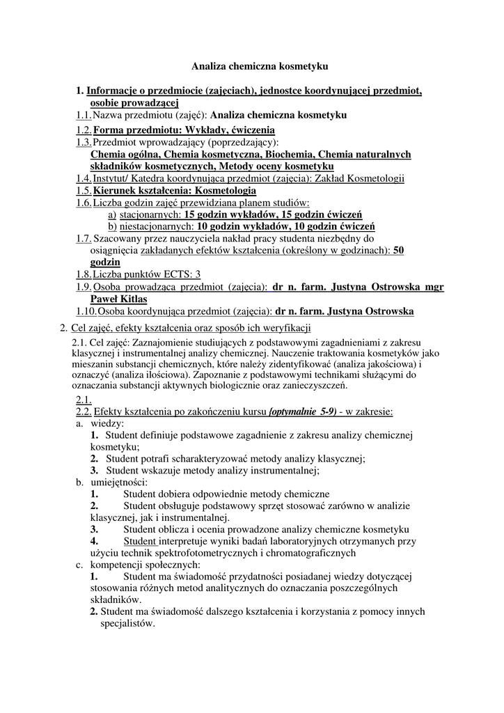 Analiza chemiczna kosmetyku 1. Informacje o przedmiocie