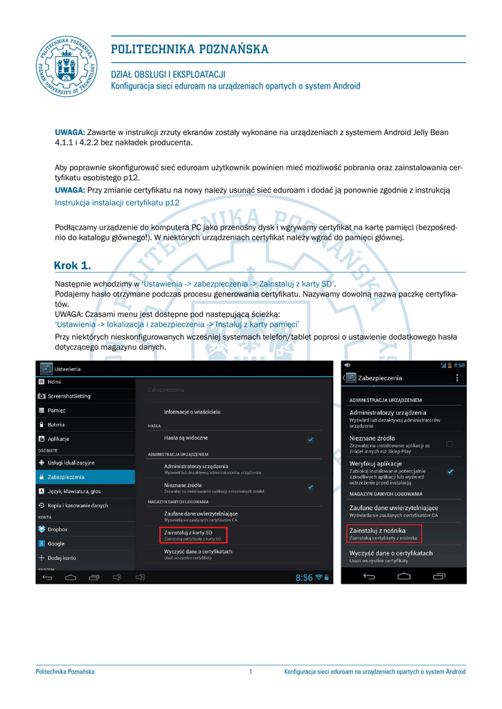 POLITECHNIKA POZNAŃSKA DZIAŁ OBSŁUGI I eKSPLOATACJI Konfiguracja sieci eduroam na urządzeniach opartych o system Android UWAGA: Zawarte w instrukcji zrzuty ekranów zostały wykonane na urządzeniach z systemem Android Jelly Bean 4.1.1 i 4.2.2 bez nakładek producenta. Aby poprawnie skonfigurować sieć eduroam użytkownik powinien mieć możliwość pobrania oraz zainstalowania certyfikatu osobistego p12. UWAGA: Przy zmianie certyfikatu na nowy należy usunąć sieć eduroam i dodać ją ponownie zgodnie z instrukcją Instrukcja instalacji certyfikatu p12 Podłączamy urządzenie do komputera PC jako przenośny dysk i wgrywamy certyfikat na kartę pamięci (bezpośrednio do katalogu głównego!). W niektórych urządzeniach certyfikat należy wgrać do pamięci głównej. Krok 1. Następnie wchodzimy w ‘Ustawienia -> zabezpieczenia -> Zainstaluj z karty SD’. Podajemy hasło otrzymane podczas procesu generowania certyfikatu. Nazywamy dowolną nazwą paczkę certyfikatów. UWAGA: Czasami menu jest dostępne pod następującą ścieżką: ‘Ustawienia -> lokalizacja i zabezpieczenia -> Instaluj z karty pamięci’ Przy niektórych nieskonfigurowanych wcześniej systemach telefon/tablet poprosi o ustawienie dodatkowego hasła dotyczącego magazynu danych. Politechnika Poznańska 1 Konfiguracja sieci eduroam na urządzeniach opartych o system Android Politechnika Poznańska 2 Konfiguracja sieci eduroam na urządzeniach opartych o system Android Krok 2. Podczas wypakowywania paczki certyfikatów należy podać hasło uzyskane w procesie generacji certyfikatu. Krok 3. Wchodzimy do menu sieci bezprzewodowych, włączamy Wi-Fi. Politechnika Poznańska 2 Konfiguracja sieci eduroam na urządzeniach opartych o system Android Politechnika Poznańska 3 Konfiguracja sieci eduroam na urządzeniach opartych o system Android Krok 4. Wybieramy z listy dostępnych sieci ‘eduroam’ i konfigurujemy go następująco (lub dodajemy nowy profil sieci, jeśli aktualnie nie jesteśmy w zasięgu): Identyfikator SSID sieci, wpisujemy: Zabezpieczenia Metoda EAP Certyfikat urzędu certyfikacji Certyfikat klienta Tożsamość Reszty pól nie wypełniamy. Politechnika Poznańska eduroam 802.1x Enterprise; (lub EAP TLS Wybieramy z listy ściągniętą paczkę certyfikatów Wybieramy z listy ściągniętą paczkę certyfikatów imie.nazwisko@ put.poznan.pl imie.nazwisko@ student.put.poznan.pl imie.nazwisko@ doctorate.put.poznan.pl 3 Konfiguracja sieci eduroam na urządzeniach opartych o system Android Politechnika Poznańska 4 Konfiguracja sieci eduroam na urządzeniach opartych o system Android Krok 5. Klikamy zapisz, następnie połącz. W niektórych modelach telefonów sieć podłączy się automatycznie. Podczas prawidłowo przeprowadzonej procedury instalacji certyfikatu jak i konfiguracji sieci bezprzewodowej eduroam tylko w kroku nr 4 instrukcji należy wprowadzać do systemu samą nazwę użytkownika (bez hasła) do konta poczty elektronicznej/ekonta (nazwa w formacie imię.nazwisko@(domena).put.poznan.pl). Jeśli przy podłączaniu się do sieci eduroam system zapyta o nazwę użytkownika i hasło oznacza to, że jego konfiguracja została przeprowadzona nieprawidłowo. UWAGA: Nazwa użytkownika i hasło do poczty elektronicznej/ekonta Politechniki Poznańskiej NIE SĄ NIGDY potrzebne przy podłączaniu się do jakiejkolwiek sieci bezprzewodowej. Wprowadzanie tych danych przy podłączaniu się do sieci bezprzewodowej grozi przechwyceniem ich przez osoby niepowołane, wykorzystujące tożsamość ich właściciela do działalności przestępczej (publikowanie treści karalnych, rozsyłanie spamu, itp..) Politechnika Poznańska 4 Konfiguracja sieci eduroam na urządzeniach opartych o system Android