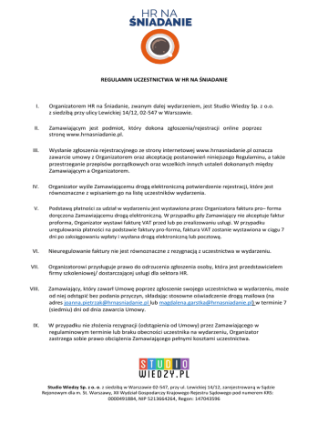 REGULAMIN UCZESTNICTWA W HR NA ŚNIADANIE I. Organizatorem HR na Śniadanie, zwanym dalej wydarzeniem, jest Studio Wiedzy Sp. z o.o. z siedzibą przy ulicy Lewickiej 14/12, 02-547 w Warszawie. II. Zamawiającym jest podmiot, który dokona zgłoszenia/rejestracji online poprzez stronę www.hrnasniadanie.pl. III. Wysłanie zgłoszenia rejestracyjnego ze strony internetowej www.hrnasniadanie.pl oznacza zawarcie umowy z Organizatorem oraz akceptację postanowień niniejszego Regulaminu, a także przestrzeganie przepisów porządkowych oraz wszelkich innych ustaleń dokonanych między Zamawiającym a Organizatorem. IV. Organizator wyśle Zamawiającemu drogą elektroniczną potwierdzenie rejestracji, które jest równoznaczne z wpisaniem go na listę uczestników wydarzenia. V. Podstawą płatności za udział w wydarzeniu jest wystawiona przez Organizatora faktura pro– forma doręczona Zamawiającemu drogą elektroniczną. W przypadku gdy Zamawiający nie akceptuje faktur proforma, Organizator wystawi fakturę VAT przed lub po zrealizowaniu usługi. W przypadku uregulowania płatności na podstawie faktury pro-forma, faktura VAT zostanie wystawiona w ciągu 7 dni po zaksięgowaniu wpłaty i wysłana drogą elektroniczną lub pocztową. VI. Nieuregulowanie faktury nie jest równoznaczne z rezygnacją z uczestnictwa w wydarzeniu. VII. Organizatorowi przysługuje prawo do odrzucenia zgłoszenia osoby, która jest przedstawicielem firmy szkoleniowej/ dostarczającej usługi dla sektora HR. VIII. Zamawiający, który zawarł Umowę poprzez zgłoszenie swojego uczestnictwa w wydarzeniu, może od niej odstąpić bez podania przyczyn, składając stosowne oświadczenie drogą mailowa (na adres [email protected] lub [email protected]) w terminie 7 (siedmiu) dni od dnia zawarcia Umowy. IX. W przypadku nie złożenia rezygnacji (odstąpienia od Umowy) przez Zamawiającego w regulaminowym terminie lub braku obecności uczestnika na wydarzeniu, Organizator zastrzega sobie prawo obciążenia Zamawiającego pełnymi kosztami uczestnictwa. Studio Wiedzy Sp. z o. o. z siedzibą w Warszawie 02-547, przy ul. Lewickiej 14/12, zarejestrowaną w Sądzie Rejonowym dla m. St. Warszawy, XII Wydział Gospodarczy Krajowego Rejestru Sądowego pod numerem KRS: 0000491884, NIP 5213664264, Regon: 147043596 REGULAMIN UCZESTNICTWA W HR NA ŚNIADANIE X. W przypadku skorzystania przez Zamawiającego z promocji cenowej lub bezpłatnego uczestnictwa i nie złożenia rezygnacji (odstąpienia od Umowy) przez Zamawiającego w regulaminowym terminie lub braku obecności uczestnika na wydarzeniu, Organizator zastrzega sobie prawo obciążenia Zamawiającego pełnymi kosztami uczestnictwa. XI. Zmiana Uczestnika wskazanego w zamówieniu na inną osobę wymaga powiadomienia Organizatora przez Zamawiającego dokonanego nie później niż na 1 dzień roboczy przed wydarzeniem, za pośrednictwem poczty elektronicznej. XII. Organizator zastrzega sobie prawo do dokonywania modyfikacji programu i zmiany prelegentów, a także w uzasadnionym przypadku do odwołania wydarzenia. XIII. Organizator nie ponosi odpowiedzialności za opóźnienia w realizacji, niewykonanie przez niego, bądź niewykorzystanie przez uczestników jakiegokolwiek punktu programu wydarzenia w razie zaistnienia siły wyższej. Przez siłę wyższą należy rozumieć zdarzenia o charakterze nadzwyczajnym, niemożliwe do przewidzenia i/lub zapobieżenia w chwili zawarcia Umowy, takie jak np. klęski żywiołowe, akty terrorystyczne, orzeczenia władz państwowych lub samorządowych, wojny, strajki generalne lub lokalne, awarie i katastrofy techniczne. W takich przypadkach uczestnikowi nie przysługuje prawo do odszkodowania lub do zwrotu jakichkolwiek opłat związanych z uczestnictwem w wydarzeniu, jak i kosztów usług dodatkowych zleconych organizatorowi przez uczestników wydarzenia. XIV. W przypadku wyczerpania miejsc lub odwołania wydarzenia Organizator zobowiązany jest do poinformowania o tym Zamawiającego oraz dokonania zwrotu wpłaconej kwoty z tytułu opłaty za wydarzenie na wskazany przez niego numer konta bankowego. XV. Zamawiający zgadza się na wykorzystanie przez Organizatora swojego wizerunku w przypadku publikacji relacji zdjęciowych lub filmowych z wydarzenia bez żadnych ograniczeń czasowych czy terytorialnych oraz do korzystania z ww. nagrań oraz fotografii dla celów archiwalnych, informacyjnych, jak również dla celów związanych z prowadzoną za pomocą dowolnych mediów promocją i reklamą przedsiębiorstwa Organizatora. Z powyższych tytułów Zamawiającemu nie przysługuje od Organizatora jakiekolwiek wynagrodzenie, odszkodowanie, zadośćuczynienie czy zwrot kosztów lub nakładów. Studio Wiedzy Sp. z o. o. z siedzibą w Warszawie 02-547, przy ul. Lewickiej 14/12, zarejestrowaną w Sądzie Rejonowym dla m. St. Warszawy, XII Wydział Gospodarczy Krajowego Rejestru Sądowego pod numerem KRS: 0000491884, NIP 5213664264, Regon: 147043596 REGULAMIN UCZESTNICTWA W HR NA ŚNIADANIE XVI. Organizator zastrzega sobie prawo do utrwalania przebiegu wydarzenia (dźwięku i/lub obrazu), w tym wypowiedzi uczestnika/uczestników, jak również do wykonywania w trakcie wydarzenia fotografii, w tym zawierających utrwalone wizerunki uczestnika/uczestników. XVII. Organizator nie ponosi odpowiedzialności za rzeczy uczestników, które mogą zostać zgubione, zniszczone lub skradzione podczas wydarzenia. XVIII. Zamawiający ponosi pełną odpowiedzialność materialną za dokonane przez siebie zniszczenia zarówno na terenie obiektów, w których prowadzone są jakiekolwiek działania związane z wydarzeniem. XIX. Wszelkie reklamacje uczestników wydarzenia wobec Organizatora powinny być zgłaszane w formie pisemnej listem poleconym na adres siedziby Organizatora. XX. Reklamacje uczestników wydarzenia mogą być zgłaszane nie później niż w terminie 7 dni od dnia zakończenia wydarzenia. XXI. Po upływie wyżej określonych terminów żadne rekla