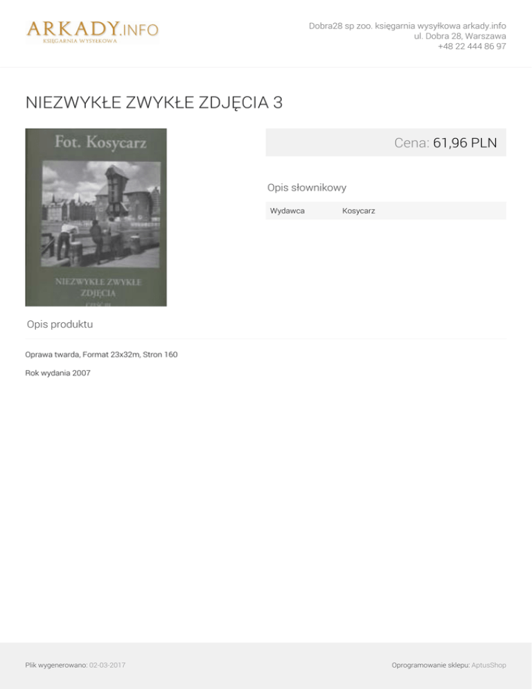 Dobra28 sp zoo. księgarnia wysyłkowa arkady.info ul. Dobra 28, Warszawa +48 22 444 86 97 NIEZWYKŁE ZWYKŁE ZDJĘCIA 3 Cena: 61,96 PLN Opis słownikowy Wydawca Kosycarz Opis produktu Oprawa twarda, Format 23x32m, Stron 160 Rok wydania 2007 Plik wygenerowano: 02-03-2017 Powered by TCPDF (www.tcpdf.org) Oprogramowanie sklepu: AptusShop
