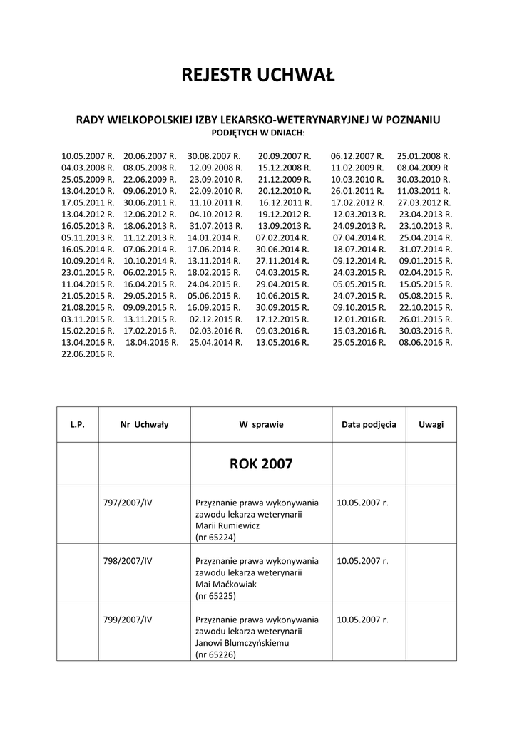 REJESTR UCHWAŁ RADY WIELKOPOLSKIEJ IZBY LEKARSKO-WETERYNARYJNEJ W POZNANIU PODJĘTYCH W DNIACH: 10.05.2007 R. 04.03.2008 R. 25.05.2009 R. 13.04.2010 R. 17.05.2011 R. 13.04.2012 R. 16.05.2013 R. 05.11.2013 R. 16.05.2014 R. 10.09.2014 R. 23.01.2015 R. 11.04.2015 R. 21.05.2015 R. 21.08.2015 R. 03.11.2015 R. 15.02.2016 R. 13.04.2016 R. 22.06.2016 R. L.P. 20.06.2007 R. 08.05.2008 R. 22.06.2009 R. 09.06.2010 R. 30.06.2011 R. 12.06.2012 R. 18.06.2013 R. 11.12.2013 R. 07.06.2014 R. 10.10.2014 R. 06.02.2015 R. 16.04.2015 R. 29.05.2015 R. 09.09.2015 R. 13.11.2015 R. 17.02.2016 R. 18.04.2016 R. Nr Uchwały 30.08.2007 R. 12.09.2008 R. 23.09.2010 R. 22.09.2010 R. 11.10.2011 R. 04.10.2012 R. 31.07.2013 R. 14.01.2014 R. 17.06.2014 R. 13.11.2014 R. 18.02.2015 R. 24.04.2015 R. 05.06.2015 R. 16.09.2015 R. 02.12.2015 R. 02.03.2016 R. 25.04.2014 R. 20.09.2007 R. 15.12.2008 R. 21.12.2009 R. 20.12.2010 R. 16.12.2011 R. 19.12.2012 R. 13.09.2013 R. 07.02.2014 R. 30.06.2014 R. 27.11.2014 R. 04.03.2015 R. 29.04.2015 R. 10.06.2015 R. 30.09.2015 R. 17.12.2015 R. 09.03.2016 R. 13.05.2016 R. W sprawie 06.12.2007 R. 11.02.2009 R. 10.03.2010 R. 26.01.2011 R. 17.02.2012 R. 12.03.2013 R. 24.09.2013 R. 07.04.2014 R. 18.07.2014 R. 09.12.2014 R. 24.03.2015 R. 05.05.2015 R. 24.07.2015 R. 09.10.2015 R. 12.01.2016 R. 15.03.2016 R. 25.05.2016 R. Data podjęcia ROK 2007 797/2007/IV Przyznanie prawa wykonywania zawodu lekarza weterynarii Marii Rumiewicz (nr 65224) 10.05.2007 r. 798/2007/IV Przyznanie prawa wykonywania zawodu lekarza weterynarii Mai Maćkowiak (nr 65225) 10.05.2007 r. 799/2007/IV Przyznanie prawa wykonywania zawodu lekarza weterynarii Janowi Blumczyńskiemu (nr 65226) 10.05.2007 r. 25.01.2008 R. 08.04.2009 R 30.03.2010 R. 11.03.2011 R. 27.03.2012 R. 23.04.2013 R. 23.10.2013 R. 25.04.2014 R. 31.07.2014 R. 09.01.2015 R. 02.04.2015 R. 15.05.2015 R. 05.08.2015 R. 22.10.2015 R. 26.01.2015 R. 30.03.2016 R. 08.06.2016 R. Uwagi 800/2007/IV Przyznanie prawa wykonywania zawodu lekarza weterynarii Monice Kapuściak (nr 65227) 10.05.2007 r. 801/2007/IV Przyznanie prawa wykonywania zawodu lekarza weterynarii Annie Kaczmarek (nr 65228) 10.05.2007 r. 802/2007/IV Przyznanie prawa wykonywania zawodu lekarza weterynarii Ewie Jażdżewskiej (nr 65229) 10.05.2007 r. 803/2007/IV Przyznanie prawa wykonywania zawodu lekarza weterynarii Agnieszce Lisieckiej (nr 65230) 10.05.2007 r. 804/2007/IV Przyznanie prawa wykonywania zawodu lekarza weterynarii Marcie Abram (nr 65231) 10.05.2007 r. 805/2007/IV Przyznanie prawa wykonywania zawodu lekarza weterynarii Karolowi Józefowi Horyzie (nr 65232) 10.05.2007 r. 806/2007/IV Przyznanie prawa wykonywania zawodu lekarza weterynarii Magdalenie Kuczyńskiej (nr 65233) 10.05.2007 r. 807/2007/IV Przyznanie prawa wykonywania zawodu lekarza weterynarii Pawłowi Ryszardowi Jakubasowi (nr 65234) 10.05.2007 r. 808/2007/IV Przyznanie prawa wykonywania zawodu lekarza weterynarii Katarzynie Bożenie Hresiukiewicz (nr 65235) 10.05.2007 r. 809/2007/IV Przyznanie prawa wykonywania zawodu lekarza weterynarii Elżbiecie Cebulskiej (nr 65236) 10.05.2007 r. 810/2007/IV Przyznanie prawa wykonywania zawodu lekarza weterynarii Szymonowi Andrzejowi Boguckiemu (nr 65237) 10.05.2007 r. 811/2007/IV Przyznanie prawa wykonywania zawodu lekarza weterynarii Agnieszce Małgorzacie Szremskiej (nr 65238) 10.05.2007 r. 812/2007/IV Przyznanie prawa wykonywania zawodu lekarza weterynarii Rafałowi Wojciechowi Kołczykowi (nr 65239) 10.05.2007 r. 813/2007/IV Przyznanie prawa wykonywania zawodu lekarza weterynarii Annie Teresie Redlich (nr 65240) 10.05.2007 r. 814/2007/IV Przyznanie prawa wykonywania zawodu lekarza weterynarii Karolinie Włodarczak (nr 65241) 10.05.2007 r. 815/2007/IV Przyznanie prawa wykonywania zawodu lekarza weterynarii Iwonie Magdalenie Maciejewskiej (nr 65242) 10.05.2007 r. 816/2007/IV Przyznanie prawa wykonywania zawodu lekarza weterynarii Iwonie Tomaszowi Niklewiczowi (nr 65243) 10.05.2007 r. 817/2007/IV Wpis lekarza weterynarii Kingi Koniecznej do rejestru członków Wielkopolskiej Izby LekarskoWeterynaryjnej w Poznaniu (nr 85363 – dotychczasowy członek Dolnośląskiej Izby L-W) 10.05.2007 r. 818/2007/IV Wpis lekarza weterynarii Ewy Pasiak do rejestru członków Wielkopolskiej Izby LekarskoWeterynaryjnej w Poznaniu (nr 15020 – dotychczasowy członek Łódzkiej Izby L-W) 10.05.2007 r. 819/2007/IV Wpis lekarza weterynarii 10.05.2007 r. Ireneusza Pasiaka do rejestru członków Wielkopolskiej Izby Lekarsko-Weterynaryjnej w Poznaniu (nr 06891 – dotychczasowy członek Łódzkiej Izby L-W) 820/2007/IV Wpis lekarza weterynarii Marcina Koniecznego do rejestru członków Wielkopolskiej Izby Lekarsko-Weterynaryjnej w Poznaniu (nr 85306 – dotychczasowy członek Dolnośląskiej Izby L-W) 10.05.2007 r. 821/2007/IV Skreślenie lekarza weterynarii Radomira Henklewskiego z rejestru członków Wielkopolskiej Izby Lekarsko-Weterynaryjnej w Poznaniu (nr 65024 – przeniesienie do Dolnośląskiej Izby L-W) 10.05.2007 r. 822/2007/IV Skreślenie lekarza weterynarii Anety Głowackiej z rejestru członków Wielkopolskiej Izby Lekarsko-Weterynaryjnej w Poznaniu (nr 65218 – przeniesienie do Dolnośląskiej Izby L-W) 10.05.2007 r. 823/2007/IV Skreślenie lekarza weterynarii Tomasza Fiszera z rejestru członków Wielkopolskiej Izby Lekarsko-Weterynaryjnej w Poznaniu (nr 06865 – przeniesienie do Kaszubsko-Pomorskiej Izby L-W) 10.05.2007 r. 824/2007/IV Skreślenie lekarza weterynarii Tomasza Babrala z rejestru członków Wielkopolskiej Izby Lekarsko-Weterynaryjnej w Poznaniu (nr 65094 – przeniesienie do Łódzkiej Izby L-W) 10.05.2007 r. 825/2007/IV Udzielenie jednorazowej zapomogi finansowej lek.wet. Tadeuszowi Żurawskiemu 10.05.2007 r. 826/2007/IV Przyznanie dotacji finansowej na publikację dr Włodzimierza Gibasiewicza pt. lekarze nie ludzcy” 10.05.2007 r. 827/2007/IV/Rej.ZLZ Wpis zmian do ewidencji zakładów leczniczych dla zwierząt Gabinet Weterynaryjny , Gostyń, Nr ew. 19 Kier. i właściciel lek.wet. Józef Sterc
