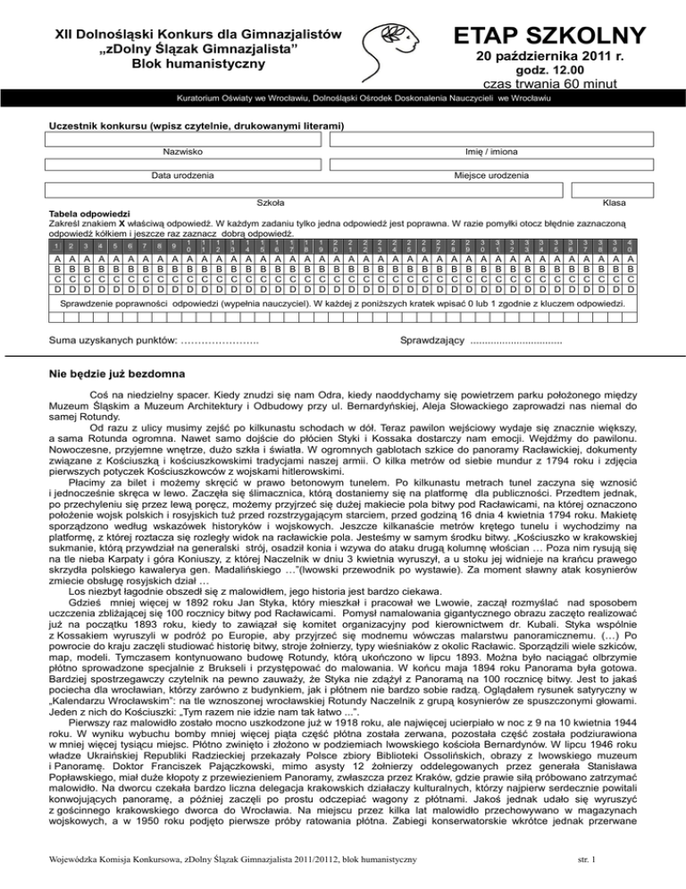 ETAP SZKOLNY XII Dolnośląski Konkurs dla Gimnazjalistów „zDolny Ślązak Gimnazjalista” Blok humanistyczny 20 października 2011 r. godz. 12.00 czas trwania 60 minut Kuratorium Oświaty we Wrocławiu, Dolnośląski Ośrodek Doskonalenia Nauczycieli we Wrocławiu Uczestnik konkursu (wpisz czytelnie, drukowanymi literami) Nazwisko Imię / imiona Data urodzenia Miejsce urodzenia Szkoła Klasa Tabela odpowiedzi Zakreśl znakiem X właściwą odpowiedź. W kaŜdym zadaniu tylko jedna odpowiedź jest poprawna. W razie pomyłki otocz błędnie zaznaczoną odpowiedź kółkiem i jeszcze raz zaznacz dobrą odpowiedź. 1 2 3 4 5 6 7 8 9 1 0 1 1 1 2 1 3 1 4 1 5 1 6 1 7 1 8 1 9 2 0 2 1 2 2 2 3 2 4 2 5 2 6 2 7 2 8 2 9 3 0 3 1 3 2 3 3 3 4 3 5 3 6 3 7 3 8 3 9 4 0 A B C D A B C D A B C D A B C D A B C D A B C D A B C D A B C D A B C D A B C D A B C D A B C D A B C D A B C D A B C D A B C D A B C D A B C D A B C D A B C D A B C D A B C D A B C D A B C D A B C D A B C D A B C D A B C D A B C D A B C D A B C D A B C D A B C D A B C D A B C D A B C D A B C D A B C D A B C D A B C D Sprawdzenie poprawności odpowiedzi (wypełnia nauczyciel). W kaŜdej z poniŜszych kratek wpisać 0 lub 1 zgodnie z kluczem odpowiedzi. Suma uzyskanych punktów: ………………….. Sprawdzający ................................ Nie będzie juŜ bezdomna Coś na niedzielny spacer. Kiedy znudzi się nam Odra, kiedy naoddychamy się powietrzem parku połoŜonego między Muzeum Śląskim a Muzeum Architektury i Odbudowy przy ul. Bernardyńskiej, Aleja Słowackiego zaprowadzi nas niemal do samej Rotundy. Od razu z ulicy musimy zejść po kilkunastu schodach w dół. Teraz pawilon wejściowy wydaje się znacznie większy, a sama Rotunda ogromna. Nawet samo dojście do płócien Styki i Kossaka dostarczy nam emocji. Wejdźmy do pawilonu. Nowoczesne, przyjemne wnętrze, duŜo szkła i światła. W ogromnych gablotach szkice do panoramy Racławickiej, dokumenty związane z Kościuszką i kościuszkowskimi tradycjami naszej armii. O kilka metrów od siebie mundur z 1794 roku i zdjęcia pierwszych potyczek Kościuszkowców z wojskami hitlerowskimi. Płacimy za bilet i moŜemy skręcić w prawo betonowym tunelem. Po kilkunastu metrach tunel zaczyna się wznosić i jednocześnie skręca w lewo. Zaczęła się ślimacznica, którą dostaniemy się na platformę dla publiczności. Przedtem jednak, po przechyleniu się przez lewą poręcz, moŜemy przyjrzeć się duŜej makiecie pola bitwy pod Racławicami, na której oznaczono połoŜenie wojsk polskich i rosyjskich tuŜ przed rozstrzygającym starciem, przed godziną 16 dnia 4 kwietnia 1794 roku. Makietę sporządzono według wskazówek historyków i wojskowych. Jeszcze kilkanaście metrów krętego tunelu i wychodzimy na platformę, z której roztacza się rozległy widok na racławickie pola. Jesteśmy w samym środku bitwy. „Kościuszko w krakowskiej sukmanie, którą przywdział na generalski strój, osadził konia i wzywa do ataku drugą kolumnę włościan … Poza nim rysują się na tle nieba Karpaty i góra Koniuszy, z której Naczelnik w dniu 3 kwietnia wyruszył, a u stoku jej widnieje na krańcu prawego skrzydła polskiego kawalerya gen. Madalińskiego …”(lwowski przewodnik po wystawie). Za moment sławny atak kosynierów zmiecie obsługę rosyjskich dział … Los niezbyt łagodnie obszedł się z malowidłem, jego historia jest bardzo ciekawa. Gdzieś mniej więcej w 1892 roku Jan Styka, który mieszkał i pracował we Lwowie, zaczął rozmyślać nad sposobem uczczenia zbliŜającej się 100 rocznicy bitwy pod Racławicami. Pomysł namalowania gigantycznego obrazu zaczęto realizować juŜ na początku 1893 roku, kiedy to zawiązał się komitet organizacyjny pod kierownictwem dr. Kubali. Styka wspólnie z Kossakiem wyruszyli w podróŜ po Europie, aby przyjrzeć się modnemu wówczas malarstwu panoramicznemu. (…) Po powrocie do kraju zaczęli studiować historię bitwy, stroje Ŝołnierzy, typy wieśniaków z okolic Racławic. Sporządzili wiele szkiców, map, modeli. Tymczasem kontynuowano budowę Rotundy, którą ukończono w lipcu 1893. MoŜna było naciągać olbrzymie płótno sprowadzone specjalnie z Brukseli i przystępować do malowania. W końcu maja 1894 roku Panorama była gotowa. Bardziej spostrzegawczy czytelnik na pewno zauwaŜy, Ŝe Styka nie zdąŜył z Panoramą na 100 rocznicę bitwy. Jest to jakaś pociecha dla wrocławian, którzy zarówno z budynkiem, jak i płótnem nie bardzo sobie radzą. Oglądałem rysunek satyryczny w „Kalendarzu Wrocławskim”: na tle wznoszonej wrocławskiej Rotundy Naczelnik z grupą kosynierów ze spuszczonymi głowami. Jeden z nich do Kościuszki: „Tym razem nie idzie nam tak łatwo ...”. Pierwszy raz malowidło zostało mocno uszkodzone juŜ w 1918 roku, ale najwięcej ucierpiało w noc z 9 na 10 kwietnia 1944 roku. W wyniku wybuchu bomby mniej więcej piąta część płótna została zerwana, pozostała część została podziurawiona w mniej więcej tysiącu miejsc. Płótno zwinięto i złoŜono w podziemiach lwowskiego kościoła Bernardynów. W lipcu 1946 roku władze Ukraińskiej Republiki Radzieckiej przekazały Polsce zbiory Biblioteki Ossolińskich, obrazy z lwowskiego muzeum i Panoramę. Doktor Franciszek Pajączkowski, mimo asysty 12 Ŝołnierzy oddelegowanych przez generała Stanisława Popławskiego, miał duŜe kłopoty z przewiezieniem Panoramy, zwłaszcza przez Kraków, gdzie prawie siłą próbowano zatrzymać malowidło. Na dworcu czekała bardzo liczna delegacja krakowskich działaczy kulturalnych, którzy najpierw serdecznie powitali konwojujących panoramę, a później zaczęli po prostu odczepiać wagony z płótnami. Jakoś jednak udało się wyruszyć z gościnnego krakowskiego dworca do Wrocławia. Na miejscu przez kilka lat malowidło przechowywano w magazynach wojskowych, a w 1950 roku podjęto pierwsze próby ratowania płótna. Zabiegi konserwatorskie wkrótce jednak prz