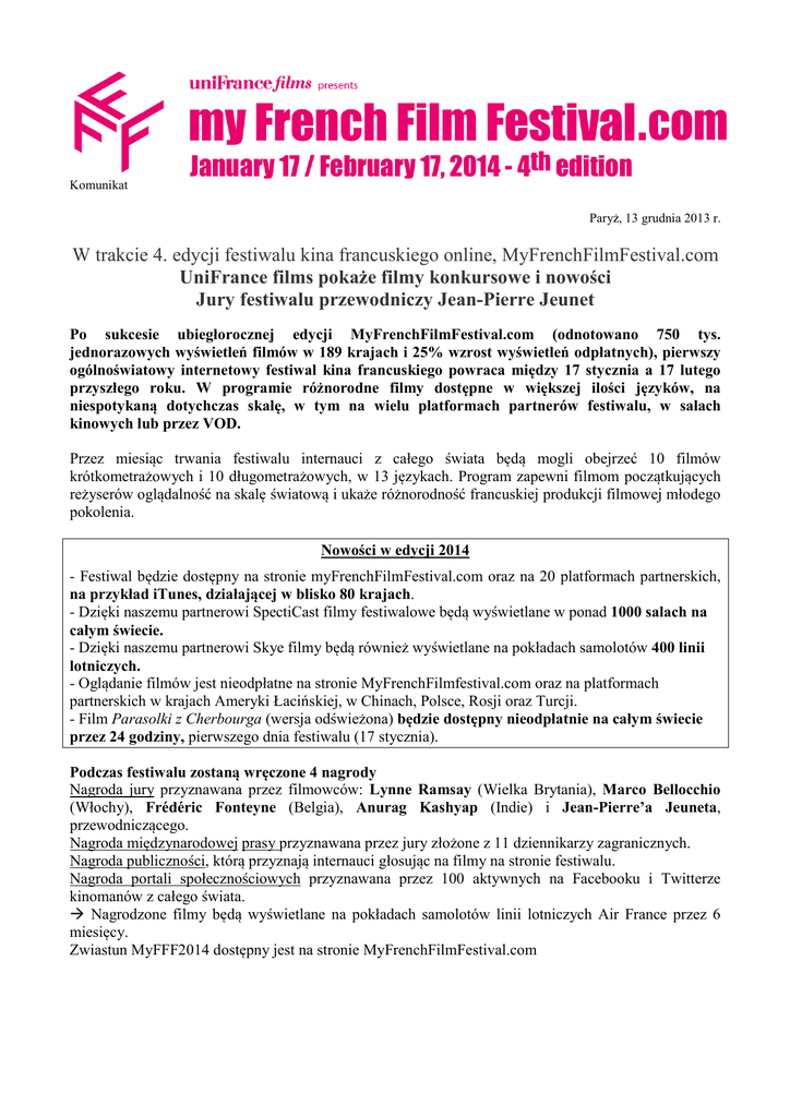 Komunikat Paryż, 13 grudnia 2013 r. W trakcie 4. edycji festiwalu kina francuskiego online, MyFrenchFilmFestival.com UniFrance films pokaże filmy konkursowe i nowości Jury festiwalu przewodniczy Jean-Pierre Jeunet Po sukcesie ubiegłorocznej edycji MyFrenchFilmFestival.com (odnotowano 750 tys. jednorazowych wyświetleń filmów w 189 krajach i 25% wzrost wyświetleń odpłatnych), pierwszy ogólnoświatowy internetowy festiwal kina francuskiego powraca między 17 stycznia a 17 lutego przyszłego roku. W programie różnorodne filmy dostępne w większej ilości języków, na niespotykaną dotychczas skalę, w tym na wielu platformach partnerów festiwalu, w salach kinowych lub przez VOD. Przez miesiąc trwania festiwalu internauci z całego świata będą mogli obejrzeć 10 filmów krótkometrażowych i 10 długometrażowych, w 13 językach. Program zapewni filmom początkujących reżyserów oglądalność na skalę światową i ukaże różnorodność francuskiej produkcji filmowej młodego pokolenia. Nowości w edycji 2014 - Festiwal będzie dostępny na stronie myFrenchFilmFestival.com oraz na 20 platformach partnerskich, na przykład iTunes, działającej w blisko 80 krajach. - Dzięki naszemu partnerowi SpectiCast filmy festiwalowe będą wyświetlane w ponad 1000 salach na całym świecie. - Dzięki naszemu partnerowi Skye filmy będą również wyświetlane na pokładach samolotów 400 linii lotniczych. - Oglądanie filmów jest nieodpłatne na stronie MyFrenchFilmfestival.com oraz na platformach partnerskich w krajach Ameryki Łacińskiej, w Chinach, Polsce, Rosji oraz Turcji. - Film Parasolki z Cherbourga (wersja odświeżona) będzie dostępny nieodpłatnie na całym świecie przez 24 godziny, pierwszego dnia festiwalu (17 stycznia). Podczas festiwalu zostaną wręczone 4 nagrody Nagroda jury przyznawana przez filmowców: Lynne Ramsay (Wielka Brytania), Marco Bellocchio (Włochy), Frédéric Fonteyne (Belgia), Anurag Kashyap (Indie) i Jean-Pierre’a Jeuneta, przewodniczącego. Nagroda międzynarodowej prasy przyznawana przez jury złożone z 11 dziennikarzy zagranicznych. Nagroda publiczności, którą przyznają internauci głosując na filmy na stronie festiwalu. Nagroda portali społecznościowych przyznawana przez 100 aktywnych na Facebooku i Twitterze kinomanów z całego świata. Nagrodzone filmy będą wyświetlane na pokładach samolotów linii lotniczych Air France przez 6 miesięcy. Zwiastun MyFFF2014 dostępny jest na stronie MyFrenchFilmFestival.com Filmy biorące udział w MYFFF 2014 I – DŁUGOMETRAŻOWE - W galopie w reżyserii Louisa Do de Lencquesainga - Augustine w reżyserii Alice Winocour - Jak lew w reżyserii Samuela Collardeya - Wściekła tęsknota w reżyserii Sandrine Bonnaire - Najświętsza Panienka Koptowie i ja w reżyserii Namira Abdela Messeeha - Spotkałem ją 14 lipca w reżyserii Antonina Peretjaki - Dzień wron w reżyserii Jean-Christophe’a Dessainta - Wesele w Mendozie w reżyserii Edouarda Deluca - Dom na kółkach w reżyserii François Pirota - Pauline na tropie w reżyserii Marca Fitoussiego II – KRÓTKOMETRAŻOWE - Zanim stracimy wszystko w reżyserii Xaviera Legranda - Krzyk homara w reżyserii Nicolasa Guiota - Glina w reżyserii Michaëla Guerraza - Ucieczka w reżyserii Jean-Bernarda Marlina - Jaszczurki w reżyserii Vincenta Mariette’a - Kiki i Montparnasse w reżyserii Amélie Harrault - Samotność w reżyserii Liovy Jedlickiego - Siódme niebo w reżyserii Guillaume’a Foiresta - A la française w reżyserii Morrigane Boyer, Juliena Hazebroucqa, Ren-Hsien Hsu, Emmanuelle Leleu, Williama Lortona - Pierwszy krok w reżyserii Jonathana Comnène’a III – POZA KONKURSEM - Parasolki z Cherbourga w reżyserii Jacques’a Demyego Film długometrażowy produkcji quebeckiej: - Zanim zmieni się moje serce w reżyserii Sébastiena Rose’a Film krótkometrażowy produkcji quebeckiej: - Przywódca stada w reżyserii Chloé Robichaud Podczas festiwalu, dzięki współpracy z Téléfilm Canada, wyświetlane będą dwa filmy quebeckie nie biorące udziału w konkursie (krótko i długometrażowy). Z kolei w konkursie, dzięki współpracy z Wallonie Bruxelles Images, biorą udział dwie francuskojęzyczne produkcje belgijskie, Dom na kółkach i Krzyk homara. Kontakt dla prasy Attachée de Presse - International : Caroline Aymar, Tel. : +33 1.47.53.27.37 Email : [email protected] Sébastien Cauchon, specjalista ds. komunikacji, prasy francuskiej i public relations Tel.: + 33 1 47 53 27 26 lub + 33 6 20 75 13 77, [email protected] 13 rue Henner 75009 Paryż www.unifrance.org MyFrenchFilmFestival organizowany jest z inicjatywy UniFrance films, instytucji zajmującej się promocją kina francuskiego za granicą, pod patronatem francuskiego Ministerstwa Kultury, przy wsparciu Narodowego Centrum Kinematografii (CNC), francuskiego Ministerstwa Spraw Zagranicznych, Instytutu Francuskiego, Stowarzyszenia Autorów i Kompozytorów Dramatycznych (SACD) oraz Téléfilm Canada i Wallonie Bruxelles Images.