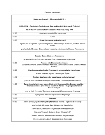 Program konferencji I dzień konferencji - 23 września 2013 r. 10:30-12:30 - Zamknięte Posiedzenie Skarbników Unii Metropolii Polskich 10:30-12:30 - Zamknięte Posiedzenie Krajowej Rady RIO 12:00 rejestracja uczestników konferencji 12:00 lunch 13:00 Otwarcie programu konferencji Agnieszka Kurzyńska, Dyrektor Segmentu Administracja Publiczna, Wolters Kluwer Polska prof. dr hab. Mirosław Stec, redaktor naczelny miesięcznika Finanse Komunalne I sesja: Samodzielność finansowa prowadzenie: prof. dr hab. Mirosław Stec, Uniwersytet Jagielloński 13:20 Finanse wielkich miast od nowa Danuta Kamińska, Skarbnik Miasta Katowice, Teresa Blacharska, Skarbnik Miasta Gdańsk 13:50 Granice samodzielności finansowej samorządu terytorialnego dr hab. Joanna Jagoda, Uniwersytet Śląski 14:10 Poziom dochodów jst a realizacja zadań własnych prof. dr hab. Elżbieta Kornberger-Sokołowska, Uniwersytet Warszawski 14:30 Ograniczenia faktyczne samodzielności finansowej jst. Zmiana struktury finansowania na przestrzeni ostatnich 10 lat – degresja autonomii finansowej jst prof. dr hab. Krzysztof Surówka, Uniwersytet Ekonomiczny w Krakowie 14:50 wystąpienie Banku Gospodarstwa Krajowego 15:10 dyskusja 15:30 panel dyskusyjny: Samorząd terytorialny a rozwój - wyzwania i bariery prof. dr hab. Mirosław Stec, Uniwersytet Jagielloński Marek Sowa, Marszałek Województwa Małopolskiego Krzysztof Iwaniuk, Związek Gmin Wiejskich RP Paweł Orłowski, Ministerstwo Rozwoju Regionalnego Paweł Lisowski, , Bank Gospodarstwa Krajowego 16:30 przerwa na kawę II sesja: Kształt systemu podatkowego prowadzenie: prof. zw. dr hab. Teresa Dębowska-Romanowska 17:00 System korekcyjno-wyrównawczy - wnioski de lege ferenda dr Monika Bogucka - Felczak, Uniwersytet Łódzki 17:20 Samodzielność finansowa jst a orzecznictwo sądów administracyjnych w sprawach podatkowych Hieronim Sęk, sędzia Wojewódzkiego Sądu Administracyjnego w Warszawie, Naczelnik Wydziału III Biura Orzecznictwa Naczelnego Sądu Administracyjnego 17:40 PIT komunalny prof. dr hab. Paweł Swianiewicz, Uniwersytet Warszawski 18:00 Adekwatność źródeł finansowania JST prof. dr hab. Beata Filipiak, Wyższa Szkoła Bankowa w Poznaniu 18:20 dyskusja 18:40 panel dyskusyjny: Kształt systemu podatkowego prof. zw. dr hab. Teresa Dębowska-Romanowska Eugeniusz Gołembiewski, Burmistrz Kowala, Wiceprezes UMP prof. dr hab. Paweł Swianiewicz, Uniwersytet Warszawski 19:40 zakończenie I dnia konferencji 20:30 uroczysta kolacja, atrakcje wieczoru: koncert II dzień konferencji - 24 września 2013 r. 08:30 - 09:45 - Zamknięte Posiedzenie Krajowej Rady RIO III sesja: Udział subwencji i dotacji w finansowaniu jst prowadzenie: Ryszard Krawczyk, Prezes Krajowej Rady RIO 10:00 Różnorodność w jedności jednostek samorządu terytorialnego Ludwik Węgrzyn, Związek Powiatów Polskich 10:20 10:40 Dochody transferowe dla samorządu terytorialnego w polityce finansowej państwa. Aspekty teoretyczne a wyzwania bieżące prof. dr hab. Beata Guziejewska, Uniwersytet Łódzki „Konieczne środki” a finansowanie realizacji zadań zleconych Andrzej Porawski, Związek Miast Polskich 11:00 Podział dotacji i subwencji prof. dr hab. Małgorzata Ofiarska, prof. dr hab. Zbigniew Ofiarski, Uniwersytet w Szczecinie 11:30 Swoboda kształtowania polityki wydatkowej. Reguły wydatkowe, indywidualny wskaźnik zadłużenia i jego konsekwencje dla funkcjonowania jst prof. dr hab. Marek Dylewski, Uniwersytet w Poznaniu 11:50 Dyskusja 12:10 panel dyskusyjny: Indywidualny wskaźnik zadłużenia – przewidywane problemy wdrażania w samorządach i możliwe zmiany regulacji prawnych Andrzej Porawski, Dyrektor Związku Miast Polskich Lesław Fijał, Skarbnik Miasta Krakowa Marta Tartanus-Oryszczak, Naczelnik Biura Zarządzania Płynnością Finansową, Urząd Miejski w Gliwicach (przedstawiciel ŚZGiP) Ryszard Paweł Krawczyk, Przewodniczący KRRIO Piotr Matwiej, Ekspert w Zespole ds. Programów Publicznych i Środowisk Gospodarczych Związku Banków Polskich 13:10 przerwa na kawę III sesja: Partnerstwo publiczno-prywatne – wpływ projektów ppp na dług i deficyt jst prowadzenie: Danuta Kamińska, Skarbnik UM Katowice, Unia Metropolii Polskich 13:30 Budżet jst a projekty ppp Danuta Kamińska, Skarbnik Miasta Katowice, Unia Metropolii Polskich 13:50 14:10 PPP a polityka inwestycyjna samorządów dr Dagmara Hajdys, Wydział Ekonomiczny Uniwersytet Łódzki panel dyskusyjny: Wpływ transakcji ppp na dług i deficyt jst Danuta Kamińska, Skarbnik Miasta Katowice Wojciech Lachiewicz, RIO Kraków Piotr Marczak, Departament Długu Publicznego Ministerstwa Finansów (w trakcie potwierdzenia) 15:10 podsumowanie i zakończenie konferencji 15:20 lunch Szczegółowe informacje znajdą Państwo na stronie: http://konferencja.lex.pl/finansepubliczne/ W razie jakichkolwiek pytań do dyspozycji pozostaje Pani Agnieszka Rożko, Kierownik działu szkoleń i konferencji, Wolters Kluwer Polska S. A., tel. (022) 535 83 23, e-mail: [email protected]