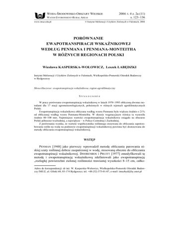 WODA-ŚRODOWISKO-OBSZARY WIEJSKIE WATER-ENVIRONMENT-RURAL AREAS www.imuz.edu.pl 2004: t. 4 z. 2a (11) s. 123–136 © Instytut Melioracji i Użytków Zielonych w Falentach, 2004 PORÓWNANIE EWAPOTRANSPIRACJI WSKAŹNIKOWEJ WEDŁUG PENMANA I PENMANA-MONTEITHA W RÓŻNYCH REGIONACH POLSKI Wiesława KASPERSKA-WOŁOWICZ, Leszek ŁABĘDZKI Instytut Melioracji i Użytków Zielonych w Falentach, Wielkopolsko-Pomorski Ośrodek Badawczy w Bydgoszczy Słowa kluczowe: ewapotranspiracja wskaźnikowa, region agroklimatyczny Streszczenie W pracy porównano ewapotranspirację wskaźnikową w latach 1970–1995 obliczoną dwoma metodami dla 17 stacji agrometeorologicznych, położonych w różnych rejonach agroklimatycznych Polski. Ewapotranspiracja wskaźnikowa obliczana według wzoru Penmana była większa średnio o 21% od obliczanej według wzoru Penmana-Monteitha. W okresie wegetacyjnym różnica ta wynosiła średnio 80–100 mm. Najmniejsze wartości ewapotranspiracja wskaźnikowa osiągała na obszarze Polski północno-wschodniej, a największe – w Polsce Centralnej i Zachodniej. Z porównania wynika, że wartość współczynnika roślinnego stosowana do obliczania zapotrzebowania roślin na wodę na podstawie ewapotranspiracji wskaźnikowej powinna być dostosowana do metody obliczania ewapotranspiracji wskaźnikowej. WSTĘP PENMAN [1948] jako pierwszy wprowadził metodę obliczania parowania niskiej szaty roślinnej dobrze zaopatrzonej w wodę, stosowaną obecnie do obliczania ewapotranspiracji wskaźnikowej. DOORENBOS i PRUITT [1977] zmodyfikowali tę metodę i ewapotranspirację wskaźnikową zdefiniowali jako ewapotranspirację „rozległej powierzchni zielonej roślinności trawiastej wysokości 8–15 cm, całkoAdres do korespondencji: dr inż. W. Kasperska-Wołowicz, Wielkopolsko-Pomorski Ośrodek Badawczy IMUZ, ul. Glinki 60, 85-174 Bydgoszcz; tel. +48 (52) 375-01-07, e-mail: [email protected] 124 Woda-Środowisko-Obszary Wiejskie t. 4 z. 2a (11) wicie zacieniającej grunt, aktywnie rosnącej w warunkach nieograniczonego zaopatrzenia w wodę”. Określili współczynniki roślinne dla różnych roślin w różnym stadium rozwoju. Metoda, zaakceptowana przez FAO i określana jako metoda Penmana-FAO, znajduje praktyczne zastosowanie do obliczania zapotrzebowania na wodę roślin na dużych obszarach. Obecnie zalecaną i najpowszechniej stosowaną metodą obliczania ewapotranspiracji jest metoda Penmana-Monteitha. Jest ona zalecana przez FAO i ICID [ALLEN i in., 1994b; 1998; FEDDES, LENSELINK, 1994; SMITH, 1992] i od 1990 r. powszechnie stosowana na świecie. W metodzie tej jest uwzględniany opór rośliny i opór aerodynamiczny. Możliwość pomiaru oporu rośliny i oporu powietrza w aktualnych warunkach meteorologicznych pozwoliłaby na jednoetapowe obliczanie ewapotranspiracji. W przypadku braku takiej możliwości do obliczania ewapotranspiracji roślin ET (mm) dostatecznie zaopatrzonych w wodę zaleca się stosowanie metody dwuetapowej z wykorzystaniem współczynnika roślinnego, charakterystycznego dla określonej rośliny: ET = ETo kc (1) gdzie: ETo – ewapotranspiracja wskaźnikowa, mm; kc – współczynnik roślinny. Wzór Penmana-Monteitha stosuje się wtedy do obliczania ewapotranspiracji wskaźnikowej ETo zdefiniowanej następująco: „Ewapotranspiracja wskaźnikowa jest to ewapotranspiracja hipotetycznej rośliny, jaką jest trawa o stałej, jednakowej wysokości równej 12 cm, stałej oporności stomatycznej równej 70 s·m–1, stałym albedo wynoszącym 0,23, w pełni zakrywająca glebę, w warunkach aktywnego rozwoju i nieograniczonego dostępu wody” [ALLEN i in., 1994a; 1998; FEDDES, LENSELINK, 1994; ŁABĘDZKI, SZAJDA, SZUNIEWICZ, 1996; ŁABĘDZKI, 1997]. Według ALLENA i in. [1994a,b; 1998] wzór Penmana-Monteitha umożliwia dokładniejszą niż wzór Penmana ocenę zdolności ewaporacyjnej atmosfery. Wyniki tych autorów, jak również krajowe wyniki ŁABĘDZKIEGO [1978], wskazują, że wartości ewapotranspiracji wskaźnikowej obliczane wzorem Penmana-FAO lub w jego modyfikacji francuskiej stosowanej w Polsce [ROGUSKI, SARNACKA, DRUPKA, 1988; SARNACKA, BRZESKA, ŚWIERCZYŃSKA, 1978; 1983] są zawyżone. Celem pracy jest porównanie i określenie różnic wartości ewapotranspiracji wskaźnikowej obliczanej według wzoru Penmana i Penmana-Monteitha w różnych rejonach agroklimatycznych Polski. W. Kasperska-Wołowicz, L. Łabędzki: Porównanie ewapotranspiracji wskaźnikowej ... 125 MATERIAŁ I METODY Materiał badawczy stanowiły wartości ewapotranspiracji wskaźnikowej obliczanej według wzoru Penmana i Penmana-Monteitha. Wzór Penmana, stosowany w Polsce w modyfikacji francuskiej, ma następującą postać [ROGUSKI, SARNACKA, DRUPKA, 1988; SARNACKA, BRZESKA, ŚWIERCZYŃSKA, 1977, 1983]: ETo ( P ) n Rn Ea (2) gdzie: ETo(P) ewapotranspiracja wskaźnikowa według Penmana, mm·d–1; nachylenie krzywej ciśnienia nasyconej pary wodnej, kPa·K–1; stała psychrometryczna, kPa·K–1; Rn promieniowanie netto, MJ·m–2·d–1; ciepło utajone parowania, MJ·kg–1; Ea czynnik aerodynamiczny ewaporacji, mm·d–1; n liczba sekund w dobie, równa 86 400. Czynnik aerodynamiczny ewapotranspiracji Ea (mm·d–1) jest obliczany według wzoru: Ea = 0,26 (es e) (1 + 0,4v) (3) gdzie: e ciśnienie pary wodnej, hPa; es ciśnienie nasyconej pary wodnej, hPa; v prędkość wiatru mierzona na wysokości 10 m, m·s–1. Wzór Penmana-Monteitha do obliczania ewapotranspiracji ma postać [ALLEN i in., 1994a; 1998; FEDDES, LENSELINK, 1994]: ET ( PM ) 1 ( Rn G ) nc p (e s e) ra r 1 c ra gdzie: ET(PM) ewapotranspiracja według Penmana-Monteitha, mm·d–1; G strumień ciepła przez powierzchnię gleby, MJ·m–2·d–1; gęstość powietrza, kg·m–3; (4) 126 Woda-Środowisko-Obszary Wiejskie t. 4 z. 2a (11) cp ra rc ciepło właściwe powietrza, MJ·kg–1·K–1; aerodynamiczna oporność dyfuzji pary i ciepła, s·m–1; stomatyczna oporność przepływu pary, s·m–1. Po