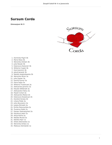 Zespół Szkół Nr 4 w Jaworznie Sursum Corda Gimnazjum Nr 9 1. 2. 3. 4. 5. 6. 7. 8. 9. 10. 11. 12. 13. 14. 15. 16. 17. 18. 19. 20. 21. 22. 23. 24. 25. 26. 27. 28. 29. 30. 31. 32. 33. 34. Dominika Pigoń 3b Maria Śliwa 3b Weronika Anklam 3b Julia Nowak 3b Katarzyna Kwiecień 3b Wiktoria Ciupek 3b Karol Jaromin 3b Jakub Janarek 3b Natalia świętosławska 3b Weronika Wnuk 3a Julia Zypser 3a Kamila Kumor 3a Daria Sojka 3a Wiktoria Trzewiczek 3a Aleksandra Jaromin 3a Klaudia Wittbrodt 3a Aleksandra Faltus 3a Paweł Cichoń 3a Aleksandra Makoś 2b Katarzyna Kowalczyk 2b Kondrat Dziuba 2b Liliana Polak 2a Julia Abucewicz 2a Judyta Michalik 2a Emilia Pokorzyńska 2a Zuzanna Gołas 2a Kacper Zastrzeżyński 2a Klaudiusz Jeleń 2a Alicja Kalina 2a Natalia Musiał 2a Natalia Pajor 1a Oliwia Zborowska 1a Weronika Sińska 1a Mateusz Ziemianek 1a 1 Zespół Szkół Nr 4 w Jaworznie AKCJE WOLONTARIATU 1. Całoroczna zbiórka nakrętek Pet dla Bartusia 2. (wrzesień) Zbiórka przyborów szkolnych dla dzieci z domu Dziecka 3. 09.15 Sadzenie żonkili na skwerze przy ZS 4 „Pola Nadziei” 2 Zespół Szkół Nr 4 w Jaworznie 4. 10.15 Chrzest nowych wolontariuszy 5. 10.15 Porządkowanie miejsc pamięci narodowej na Dąbrowie Narodowej i Łubowcu. Promocja idei patriotyzmu 6. 11.15 Warsztaty dla dzieci przedszkolnych PM 1 z zakresu pierwszej pomocy przedmedycznej 3 Zespół Szkół Nr 4 w Jaworznie 7. (listopad) Zbiórka karmy, zabawek, koców itp. dla TOZ Jaworzno 8. (listopad – grudzień) „Słodka Chwila” Zbiórka słodyczy, zabawek dla dzieci z Domu Dziecka na mikołajki 9. (listopad) Rysowanie kartek dla sponsorów Domu Dziecka, Hospicjum i rodzin osieroconych 4 Zespół Szkół Nr 4 w Jaworznie 10. 11.15 Spotkanie z gościem specjalnym J. Homlak socjoterapeutką nt. „Komunikacja społeczna w kontekście wolontariatu – warsztaty” 11. 12.15 Spotkanie wyjazdowe wolontariuszy z młodzieżą SP 6. Promocja idei wolontariatu. Warsztaty, pokazy i nauka pierwszej pomocy 5 Zespół Szkół Nr 4 w Jaworznie 12. 12.15 Kiermasz parafialny przy Kościele M.B. Anielskiej na Dąbrowie Narodowej 13. 12.15 Wyjazd wolontariuszy do Domu Dziecka. Wystawienie jasełek, wspólne kolędowanie 14. (grudzień – czerwiec) Nauka udzielania pierwszej pomocy przedmedycznej w ramach programu „Mały Wolontariusz” i projektów „Etyka nie tylko dla smyka” oraz „Korba” 6 Zespół Szkół Nr 4 w Jaworznie 15. . (styczeń – czerwiec) „Góra Grosza” Zbiórka pieniędzy dla Bartosza Sarana na urządzenie innowalk 16. (styczeń) Zbiórka maskotek dla dzieci ze szpitala na Światowy Dzień chorego 17. 8.01.16 Warsztaty pierwszej pomocy prowadzone przez ratowników medycznych Straży Miejskiej 7 Zespół Szkół Nr 4 w Jaworznie 18. (marzec) Rysowanie kartek dla sponsorów Domu Dziecka, Hospicjum i rodzin osieroconych 19. 8.04.16 Spotkanie z gościem specjalnym K. Gorczowska logopeda nt. „Komunikacja z osobami chorymi neurologicznie w hospicjum – ujęcie logopedyczne 8 Zespół Szkół Nr 4 w Jaworznie 20. (styczeń – czerwiec) Zbiórka pieniędzy i darów na licytację dla Emila Koryczan, chorego dziecka z Krakowa na operację w USA 21. (kwiecień – maj) Zbiórka darów dla pogorzelców z Osiedla Stałego 22. 7.04.16 Udział w treningu Bushido sztuki walki, z wielokrotnym mistrzem Polski S. Kowalczykiem. Nauka samoobrony 9 Zespół Szkół Nr 4 w Jaworznie 23. 26.04.16 Nauka udzielania pierwszej pomocy na świetlicy szkolnej w ramach programu „Bezpieczeństwo w ruchu drogowym” (udział w konkursie świetlica profilaktyczna) 24. 22. 04.16 Warsztaty z pierwszej pomocy prowadzone przez ratowników medycznych Straży Miejskiej nt. Umiejętne zastosowanie schematu postępowania w przypadkach kolizji pojazdów oraz wypadków drogowych 10 Zespół Szkół Nr 4 w Jaworznie 25. 14.05.16 Koncert charytatywny dla Emila Koryczan „Serce dla serca” 11