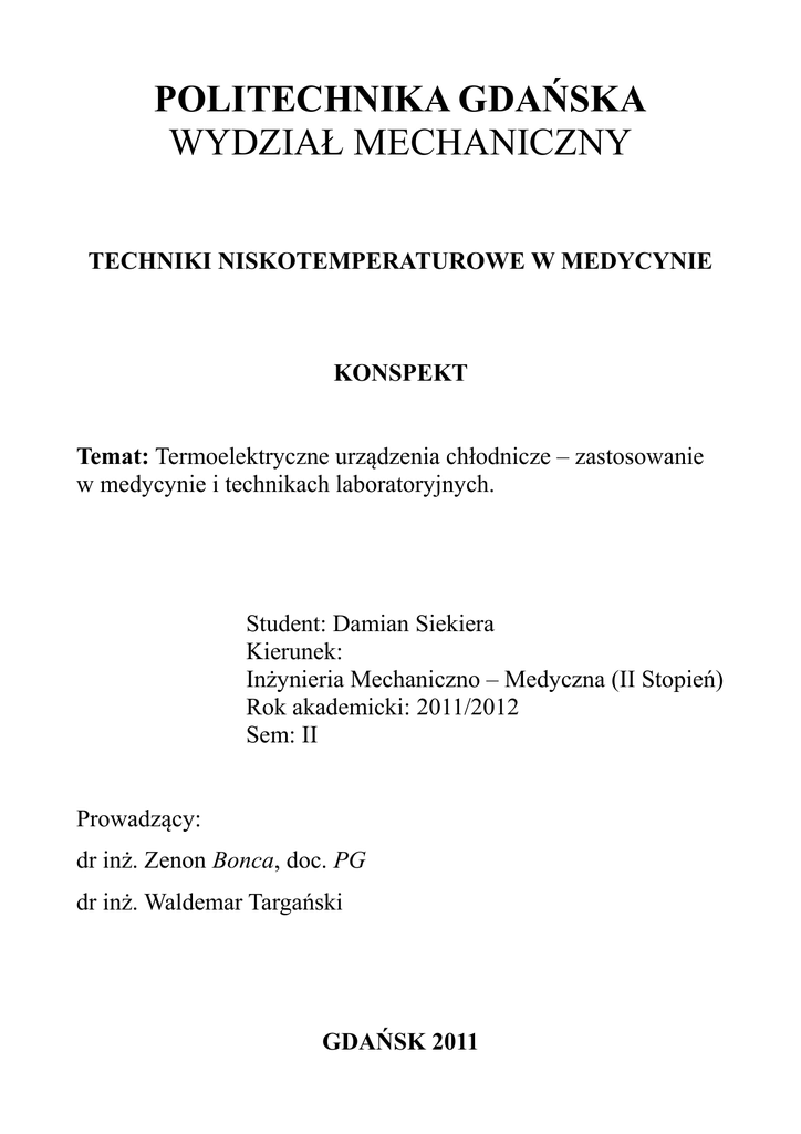POLITECHNIKA GDAŃSKA WYDZIAŁ MECHANICZNY TECHNIKI NISKOTEMPERATUROWE W MEDYCYNIE KONSPEKT Temat: Termoelektryczne urządzenia chłodnicze – zastosowanie w medycynie i technikach laboratoryjnych. Student: Damian Siekiera Kierunek: Inżynieria Mechaniczno – Medyczna (II Stopień) Rok akademicki: 2011/2012 Sem: II Prowadzący: dr inż. Zenon Bonca, doc. PG dr inż. Waldemar Targański GDAŃSK 2011 1. Wprowadzenie. Termoelektryczne urządzenia chłodnicze, jak sama nazwa wskazuje, wykorzystują zjawisko termoelektryczności do chłodzenia. Ich zasada działania opiera się na zjawisku Peltiera. Efekt Peltiera polega na tym, że przy przepływie prądu stałego (I) przez termoelement, na spoinach termoelementu (Rys. 1) wydziela się lub zostaje pochłonięta pewna ilość ciepła (Q). Przy użyciu materiałów o różnej przewodności elektronowej i dziurowej (typu „p” oraz typu „n”) na jednej spoinie następuje obniżenie temperatury, natomiast na drugiej jej podwyższenie do określonej wartości. Jeśli kierunek przepływu prądu będzie się zmieniać to zjawisko to się odwróci. Umieszczając więc zimniejszą spoinę w środowisku chłodzonym, a cieplejszą w środowisku chłodzącym, np. w powietrzu, stwarza się możliwość odprowadzenia ciepła z komory oraz oddania ciepła do otaczającego powietrza. Rys. 1. Schemat ideowy termoelementu. Ogniwo Peltiera, ze względu na nieskomplikowaną produkcję oraz trwałość parametrów znajduje szerokie zastosowanie jako pompa cieplna. Stosowane jest do budowy urządzeń i elementów chłodniczych, wykorzystywanych zarówno w warunkach "domowych", jak i w zaawansowanej technologicznie aparaturze naukowej. 2. Urządzenia wykorzystywane w medycynie. Termoelektryczne urządzenia chłodnicze wykorzystuje się w wielu dziedzinach medycyny. Jedną z nich jest krioterapia i kriochirurgia. Krioterapia jest niefarmakologiczną techniką w terapii wielu ciężkich i przewlekłych chorób. Polega ona na krótkotrwałym kontakcie skóry pacjenta z medium gazowym o temperaturze w zakresie od -180 °C do -110 °C. Kriochirurgia jest częścią krioterapii i jest metodą leczenia chirurgicznego polegającą na miejscowym, kontrolowanym niszczeniu chorej tkanki przez jej zamrażanie w niskiej temperaturze. Można ją określić mianem metody bezkrwawej, niska temperatura bowiem niejako blokuje drobne naczynia tętnicze i żylne, umożliwiając oddzielenie tkanki wymrożonej, głównie zmienionej chorobowo, od tkanki zdrowej praktycznie bez krwawień. Poza tym zastosowaniem w medycynie powszechnie wykorzystuje się również termostaty przenośne oraz stacjonarne, służące do transportu i przechowywania leków. 2. 1. Urządzenie do zamrażania tkanek. Urządzenia te służą do miejscowego zamrożenia żywej tkanki w temperaturze do -20°C. Zamrożenie następuje przez kontakt tkanki z chłodzoną końcówką roboczą krioaplikatora. Natężenie prądu zasilającego wynosi 1,5 A, przy napięciu 230 V. W wyniku działania niską temperaturą na tkanki uzyskuje się m.in. zahamowanie procesu zapalnego, spadek napięcia mięśniowego, poprawę czynności chorych stawów, czy też poprawę drenażu krwionośnego i limfatycznego. Rys. 2. Urządzenie do zamrażania tkanek Kriopol K-11. Opis urządzenia Kriopol K-11: Urządzenie umieszczone jest na ramie jezdnej, która umożliwia jego łatwe przemieszczanie Urządzenie wyposażone jest w zbiornik na ciekł azot o pojemności 11 litrów (istnieje możliwość dokupienia dodatkowych zbiorników). Posiada elastyczną linię przesyłową ciekłego azotu, która umożliwia w wygodny i bezpieczny sposób wykonywanie zabiegów. Urządzenie wyposażone jest w trzy dowolnie wybrane aplikatory kontaktowe danej specjalności oraz aplikator typu spray. Dane techniczne: Czynnik chłodniczy: ciekły azot (LN2) Objętość zbiornika: 11 litrów (9 kg.) Temperatura powierzchni końcówki krioaplikatora: - 196°C Ciśnienie robocze: 50 kPa Czas uzyskania ciśnienia 50 kPa w zbiorniku: 5 min. Zasilanie: 230 V +/- 10 % Częstotliwość: 50 Hz Pobór prądu: 1,5 A Klasa ochronności: II Bezpiecznik: 3,15 WTA Typ ochrony: B Maksymalny czas pracy urządzenia: Około 60 min (z jednego zbiornika) Masa urządzenia: 16 kg (bez azotu) Wymiary (szerokość/wysokość/długość): 320 / 700 / 330 mm. 2. 2. Krioekstraktor termoelektryczny. Jest to urządzenie przeznaczone do usuwania z oka zmętniałych fragmentów soczewki. Końcówka 1 chłodzona termoelementem 3 przymarza do soczewki. Jej temperatura w trybie roboczym wynosi od – 25°C do – 30°C. Czas dojścia do tych warunków jest bardzo krótki, gdyż wynosi jedynie 2 minuty. Natężenie prądu zasilającego termoelement to 10 A przy napięciu 1,7 V. Rys. 3. Krioekstraktor termoelektryczny. 2. 3. Termoelektryczny hełm chłodzący. Jest to urządzenie, które wykorzystuje się do obniżenia temperatury tkanki mózgowej i zahamowania jej obumierania, na skutek niedotlenienia wywołanego ciężkimi urazami głowy. Przy temperaturze mózgu na poziomie 26°C zużycie tlenu przez komórki obniża się aż dwukrotnie. Hełm ten posiada elastyczną membranę ściśle przylegającą do głowy chorego. Przestrzeń zawartą między membraną i skórą głowy chłodzą właśnie moduły Peltiera. Temperatura może być regulowana w zakresie od – 20°C do + 50°C. Rys. 4. Termoelektryczny hełm chłodzący. Hełm chłodzący (Rys. 4) to urządzenie przypominające kask motocyklowy, którego wewnętrzna część wyścielona jest 120 sztukami jednakowych pod względem termicznym i elektrycznym termoelementów pobierających prąd o napięciu 0,1 V. Odbiór ciepła stron gorących zapewniony jest przez wodę przepompowywaną przez kanały umieszczone w hełmie. Ogrzana w kanałach woda pompowana jest do urządzenia chłodzącego, następnie powtórnie używana jest do odbioru ciepła po stronie gorącej hełmu termoelektrycznego. Jednostką sterującą urządzenia jest 8 bitowy 