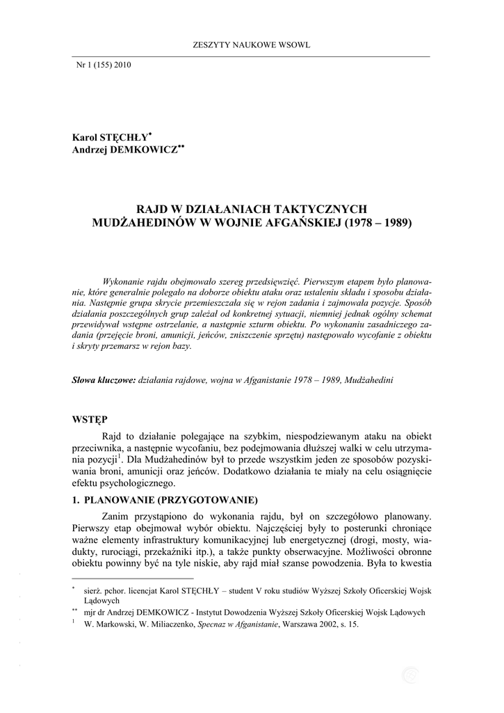 ZESZYTY NAUKOWE WSOWL Nr 1 (155) 2010 ISSN 1731-8157 Karol STĘCHŁY Andrzej DEMKOWICZ RAJD W DZIAŁANIACH TAKTYCZNYCH MUDŻAHEDINÓW W WOJNIE AFGAŃSKIEJ (1978 – 1989) Wykonanie rajdu obejmowało szereg przedsięwzięć. Pierwszym etapem było planowanie, które generalnie polegało na doborze obiektu ataku oraz ustaleniu składu i sposobu działania. Następnie grupa skrycie przemieszczała się w rejon zadania i zajmowała pozycje. Sposób działania poszczególnych grup zależał od konkretnej sytuacji, niemniej jednak ogólny schemat przewidywał wstępne ostrzelanie, a następnie szturm obiektu. Po wykonaniu zasadniczego zadania (przejęcie broni, amunicji, jeńców, zniszczenie sprzętu) następowało wycofanie z obiektu i skryty przemarsz w rejon bazy. Słowa kluczowe: działania rajdowe, wojna w Afganistanie 1978 – 1989, Mudżahedini WSTĘP Rajd to działanie polegające na szybkim, niespodziewanym ataku na obiekt przeciwnika, a następnie wycofaniu, bez podejmowania dłuższej walki w celu utrzymania pozycji1. Dla Mudżahedinów był to przede wszystkim jeden ze sposobów pozyskiwania broni, amunicji oraz jeńców. Dodatkowo działania te miały na celu osiągnięcie efektu psychologicznego. 1. PLANOWANIE (PRZYGOTOWANIE) - Zanim przystąpiono do wykonania rajdu, był on szczegółowo planowany. Pierwszy etap obejmował wybór obiektu. Najczęściej były to posterunki chroniące ważne elementy infrastruktury komunikacyjnej lub energetycznej (drogi, mosty, wiadukty, rurociągi, przekaźniki itp.), a także punkty obserwacyjne. Możliwości obronne obiektu powinny być na tyle niskie, aby rajd miał szanse powodzenia. Była to kwestia - - - - 1 sierż. pchor. licencjat Karol STĘCHŁY – student V roku studiów Wyższej Szkoły Oficerskiej Wojsk Lądowych mjr dr Andrzej DEMKOWICZ - Instytut Dowodzenia Wyższej Szkoły Oficerskiej Wojsk Lądowych W. Markowski, W. Miliaczenko, Specnaz w Afganistanie, Warszawa 2002, s. 15. RAJD W DZIAŁANIACH TAKTYCZNYCH MUDŻAHEDINÓW W WOJNIE AFGAŃSKIEJ… wielkości, uzbrojenia, wyposażenia, rozbudowy inżynieryjnej, wyszkolenia żołnierzy2 itp. Wyboru dokonywał najczęściej dowódca lokalnego oddziału Mudżahedinów. Kolejnym etapem przygotowania było prowadzenie obserwacji w celu uzyskania informacji na temat: liczebności żołnierzy; uzbrojenia i wyposażenia; rozmieszczenia środków bojowych; rozbudowy inżynieryjnej; rozlokowania pola minowego; schematu pełnienia wart i zmiany posterunków; charakterystycznego zachowania się żołnierzy (np. spanie na warcie)3. Etap prowadzenia obserwacji trwał od kilku dni do kilku tygodni. Często obserwowano kilka posterunków jednocześnie i wtedy podejmowano decyzję, który będzie celem rajdu. Przy tych działaniach przydatna okazywała się ludność lokalna, a szczególnie pasterze. Wypasając swoje zwierzęta blisko posterunków, mieli doskonałą okazję do prowadzenia obserwacji, nie wzbudzając podejrzeń. 2. PRZEMIESZCZENIE W REJON RAJDU Mudżahedini przemieszczali się w rejon wykonania zadania najczęściej nocą, co zmniejszało prawdopodobieństwo wykrycia ich przez wojska sowieckie. Nie było to jednak regułą. Rzadkością były rajdy przeprowadzane praktycznie z marszu. W większości przypadków grupa przed wykonaniem zadania zajmowała rejon ześrodkowania, gdzie przygotowywała się do dalszych działań. Mogła być to wioska położona nieopodal celu rajdu lub inne miejsce dające schronienie (np. jaskinia, głęboki wąwóz). Rejon ześrodkowania służył również jako miejsce spotkania, jeżeli zadanie było wykonywane przez kilka grup4. W czasie przemieszczenia rozstawiano grupy ubezpieczające (składające się z reguły z dwóch zwiadowców). One jako pierwsze zajmowały swoje pozycje. Prowadząc obserwację obiektu bezpośrednio przed rajdem, ustalali, czy załoga posterunku nie przygotowuje się do obrony5. Mudżahedini prawie we wszystkich przypadkach przemieszczali się pieszo lub z wykorzystaniem mułów. Na zwierzętach transportowano amunicję oraz cięższe uzbrojenie (moździerze, ciężkie karabiny maszynowe). W rejonie ześrodkowania grupa pozostawała w zależności od potrzeb od kilku godzin do kilku tygodni. Był to czas na ustalenie ostatnich szczegółów dotyczących wykonania zadania. - 2 - 3 - - - 4 5 Żołnierze Armii Demokratycznej Republiki Afganistanu charakteryzowali się niskim morale i niechętnie walczyli z Mudżahedinami. Dlatego obiektem ataku najczęściej były ich posterunki. L. Grau, M. Gress, The Soviet Afghan War, University Press of Kansas 2002, s. 67. L. Grau, A. Ahmad Jalai, The other side of the mountain, Foreign Military Studies Office, Kansas 2003, s. 82. Mógł wystąpić przeciek informacji. W szeregach Mudżahedinów działali radzieccy agenci. 33 Karol STĘCHŁY, Andrzej DEMKOWICZ 3. PODZIAŁ NA GRUPY I ROZMIESZCZENIE Podstawowy podział na grupy był następujący6: Grupa szturmowa – liczyła w zależności od potrzeb kilku lub kilkudziesięciu ludzi. Jej zadaniem było wykonanie szturmu na obiekt, przejęcie amunicji, broni, jeńców, a następnie wycofanie się pod osłoną grupy wsparcia. Podstawowe uzbrojenie: AK – 47, karabiny maszynowe PK oraz granatniki RPG. Grupa wsparcia – praktycznie zawsze była liczniejsza od grupy szturmowej, niejednokrotnie istniało kilka grup wsparcia. Podstawowe zadanie to wspieranie ogniem oraz osłona bojowników wykonujących szturm. Poza tym grupa ta prowadziła ostrzał, z pewnej odległości od obiektu celem zniszczenia jego uzbrojenia, umocnień itp. Uzbrojenie: poza AK – 47, średnie i ciężkie karabiny maszynowe (PK, NSW, DSzK), granatniki RPG, moździerz 82 mm, a nawet pojedyncze pociski do BM – 1, BM – 12. Grupa ubezpieczająca – jej zadaniem było niedopuszczenie do podejścia przeciwnika na tyły Mudżahedinów. Z reguły składała się z dwuosobowych zespołów. Uzbrojenie: AK – 47 oraz średnie karabiny maszynowe PK. Grupa torująca – występo