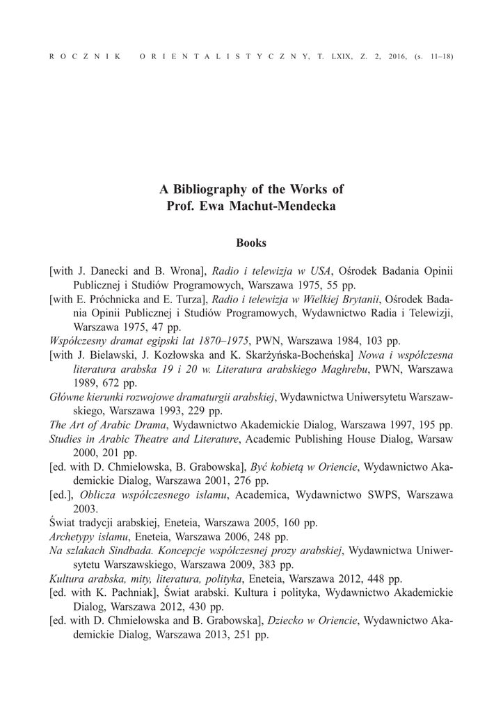 R O C Z N I K O R I E N T A L I S T Y C Z N Y, T. LXIX, Z. 2, 2016, (s. 11–18) A Bibliography of the Works of Prof. Ewa Machut-Mendecka Books [with J. Danecki and B. Wrona], Radio i telewizja w USA, Ośrodek Badania Opinii Publicznej i Studiów Programowych, Warszawa 1975, 55 pp. [with E. Próchnicka and E. Turza], Radio i telewizja w Wielkiej Brytanii, Ośrodek Badania Opinii Publicznej i Studiów Programowych, Wydawnictwo Radia i Telewizji, Warszawa 1975, 47 pp. Współczesny dramat egipski lat 1870–1975, PWN, Warszawa 1984, 103 pp. [with J. Bielawski, J. Kozłowska and K. Skarżyńska-Bocheńska] Nowa i współczesna literatura arabska 19 i 20 w. Literatura arabskiego Maghrebu, PWN, Warszawa 1989, 672 pp. Główne kierunki rozwojowe dramaturgii arabskiej, Wydawnictwa Uniwersytetu Warszawskiego, Warszawa 1993, 229 pp. The Art of Arabic Drama, Wydawnictwo Akademickie Dialog, Warszawa 1997, 195 pp. Studies in Arabic Theatre and Literature, Academic Publishing House Dialog, Warsaw 2000, 201 pp. [ed. with D. Chmielowska, B. Grabowska], Być kobietą w Oriencie, Wydawnictwo Akademickie Dialog, Warszawa 2001, 276 pp. [ed.], Oblicza współczesnego islamu, Academica, Wydawnictwo SWPS, Warszawa 2003. Świat tradycji arabskiej, Eneteia, Warszawa 2005, 160 pp. Archetypy islamu, Eneteia, Warszawa 2006, 248 pp. Na szlakach Sindbada. Koncepcje współczesnej prozy arabskiej, Wydawnictwa Uniwersytetu Warszawskiego, Warszawa 2009, 383 pp. Kultura arabska, mity, literatura, polityka, Eneteia, Warszawa 2012, 448 pp. [ed. with K. Pachniak], Świat arabski. Kultura i polityka, Wydawnictwo Akademickie Dialog, Warszawa 2012, 430 pp. [ed. with D. Chmielowska and B. Grabowska], Dziecko w Oriencie, Wydawnictwo Akademickie Dialog, Warszawa 2013, 251 pp. 12 A BIBLIOGRAPHY OF THE WORKS OF PROF. EWA MACHUT-MENDECKA Articles Jeden wiek teatru arabskiego, “Kontynenty” 1975, No. 4. Arabskie tradycje kulturalne w programach Tunezyjskiego Radia i Telewizji, “Przegląd Informacji o Afryce” 1975, No. 1, pp. 49–53. Prasa arabska na przykładzie Egiptu i Libanu, “Przegląd Informacji o Afryce” 1975, No. 4, pp. 47–54. Charakterystyka wybranych rodzin egipskich, “Przegląd Informacji o Afryce” 1977, No. 2, pp. 112–129. Ćwierć wieku w teatrze egipskim, “Dialog” 1977, No. 11, pp. 121–128. Tradycje i współczesność w egipskim teatrze radiowym i telewizyjnym, “Przekazy i Opinie” 1978, No. 1 (January–March). Bohater współczesnej dramaturgii egipskiej, “Przegląd Informacji o Afryce” 1979, No. 3, pp. 94–107. Społeczno-polityczne uwarunkowania przemian kulturalnych w Egipcie w latach 1952–1975, “Przegląd Orientalistyczny” 1979, No. 1, pp. 25–36. European and Arab Elements in Egyptian Drama, “Africana Bulletin” 1980, Vol. 29, pp. 109–121. Social Changes in Egyptian Realistic Drama, “Africana Bulletin” 1981, Vol. 30, pp. 147–158. Rola kultury arabskiej w świecie, “Przegląd Orientalistyczny” 1981, No. 2, p. 161. Ćwierć wieku prozy libijskiej, “As-Sadaka” 1982, No. 5, pp. 44–46, 56. Rozmowa o dramaturgii tunezyjskiej (Izz ad-Din al-Madani), “Dialog” 1982, No. 6. Gamal Abdel Naser, “As-Sadaka” 1983, No. 25, pp. 26–28. Główne tendencje rozwojowe w dramaturgii arabskiej, in: Ex Oriente Theatrum, Instytut Orientalistyczny UW, Warszawa 1983, pp. 22–35. Literatura dwóch stuleci, “As-Sadaka” 1983, No. 23–24, pp. 18–24. Niespokojny teatr tunezyjski, “Dialog” 1984, No. 4, pp. 127–134. Neoclassicism and the Return to Sources in the Egyptian Drama, “Rocznik Orientalistyczny” 1984, Vol. 43, pp. 85–89. II Ogólnopolska Konferencja Arabistyczna, “ Afryka Azja Ameryka Łacińska” 1985, Vol. 64, pp. 155–159. The Second All-Poland Arabist Conference, “Africana Bulletin” 1986, Vol. 33, pp. 160–163. The Main Trends in Arab Drama, “Africana Bulletin” 1986, Vol. 33, pp. 119–129. ﺍﻟﺪﺭﺍﻣﺎ ﺍﻟﻌﺮﺑﻴﺔ ﺑﻴﻦ ﺍﻟﻤﺘﻔﺮﺝ ﻭﺍﻟﺮﻭﺍﻳﺔ, “ ”ﺍﻻﺳﺘﺸﺮﺍﻕ1989, No. 3, pp. 166–168. Główne motywy i wątki literatury libijskiej, “Afryka Azja Ameryka Łacińska” 1989, Vol. 67, pp. 7–22. Dzień Egiptu w Warszawie, “Afryka Azja Ameryka Łacińska” 1989, Vol. 67, pp. 127–128. Zastosowanie pojęć europejskich w badaniach nad dramaturgią arabską, in: My i Oni. Obcość czy wspólnota. materiały z konferencji naukowej Wydziału Neofilologii Uniwersytetu Warszawskiego, 20–24 listopada 1989 r., Wydział Neofilologii UW, Warszawa 1990, pp. 274–282. A BIBLIOGRAPHY OF THE WORKS OF PROF. EWA MACHUT-MENDECKA 13 Współczesna literatura libijska – realizm i autentyzm, “As-Sadaka” 1990, No. 8, pp. 39–43. Development Identity of Arabic Drama, “Africana Bulletin” 1991, Vol. 39, pp. 63–75. Zikr Allah. Wspominanie Boga w mistycyzmie muzułmańskim, “Albo Albo” 1991, No. 1, pp. 65–67. Lament w cieniu Karbali. Tazijja – rytuał przekraczania śmierci, “Albo Albo” 1992, No. 2, pp. 77–83. Harem - miejsce święte i zakazane, “Albo Albo” 1992, No. 3, pp. 56–63. The absurdity of politics and the absurdity of existence. The case of the Syrian drama, “Studia Arabistyczne i Islamistyczne” 1993, Vol. 1, pp. 41–54. Zanim nastanie kolor purpury, “Albo Albo”, 1993, No. 1, pp. 154–155. The Absurd of Existence or the Absurd of Politics in Syrian Drama, “Вестник Московского университета. Серия 13, Востоковедение” 1994, No. 3, pp. 35–45. Arabic traditional theatre, “Africana Bulletin” 1994, Vol. 42, pp. 75–79. Z warsztatu arabisty. Jak mówić o literaturze arabskiej, in: Plenas Arabum domos. Materiały IV Ogólnopolskiej Konferencji Arabistycznej, Warszawa 25–26 marca 1993, ed. by M.M. Dziekan, Zakład Arabistyki i Islamistyki IO UW, Warszawa 1994, pp. 169–179. Duchowość islamu, “Albo Albo” 1994, No. 1–2, pp. 86–91. Magic and realism of the desert (The prose o
