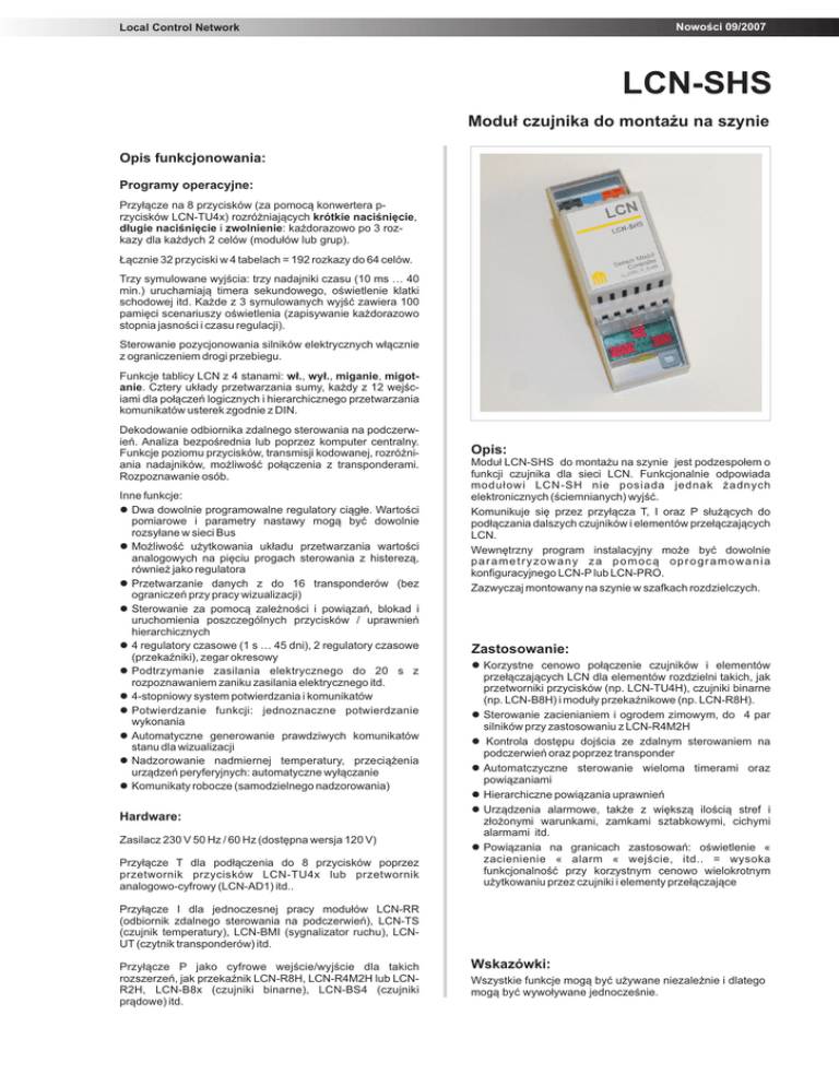 Nowoœci 09/2007 Local Control Local Control NetworkNetwork LCN-SHS Modu³ czujnika do monta¿u na szynie Opis funkcjonowania: Programy operacyjne: Przy³¹cze na 8 przycisków (za pomoc¹ konwertera przycisków LCN-TU4x) rozró¿niaj¹cych krótkie naciœniêcie, d³ugie naciœniêcie i zwolnienie: ka¿dorazowo po 3 rozkazy dla ka¿dych 2 celów (modu³ów lub grup). £¹cznie 32 przyciski w 4 tabelach = 192 rozkazy do 64 celów. Trzy symulowane wyjœcia: trzy nadajniki czasu (10 ms … 40 min.) uruchamiaj¹ timera sekundowego, oœwietlenie klatki schodowej itd. Ka¿de z 3 symulowanych wyjœæ zawiera 100 pamiêci scenariuszy oœwietlenia (zapisywanie ka¿dorazowo stopnia jasnoœci i czasu regulacji). Sterowanie pozycjonowania silników elektrycznych w³¹cznie z ograniczeniem drogi przebiegu. Funkcje tablicy LCN z 4 stanami: w³., wy³., miganie, migotanie. Cztery uk³ady przetwarzania sumy, ka¿dy z 12 wejœciami dla po³¹czeñ logicznych i hierarchicznego przetwarzania komunikatów usterek zgodnie z DIN. Dekodowanie odbiornika zdalnego sterowania na podczerwieñ. Analiza bezpoœrednia lub poprzez komputer centralny. Funkcje poziomu przycisków, transmisji kodowanej, rozró¿niania nadajników, mo¿liwoœæ po³¹czenia z transponderami. Rozpoznawanie osób. Inne funkcje: l Dwa dowolnie programowalne regulatory ci¹g³e. Wartoœci pomiarowe i parametry nastawy mog¹ byæ dowolnie rozsy³ane w sieci Bus l Mo¿liwoœæ u¿ytkowania uk³adu przetwarzania wartoœci analogowych na piêciu progach sterowania z histerez¹, równie¿ jako regulatora l Przetwarzanie danych z do 16 transponderów (bez ograniczeñ przy pracy wizualizacji) l Sterowanie za pomoc¹ zale¿noœci i powi¹zañ, blokad i uruchomienia poszczególnych przycisków / uprawnieñ hierarchicznych l 4 regulatory czasowe (1 s … 45 dni), 2 regulatory czasowe (przekaŸniki), zegar okresowy l Podtrzymanie zasilania elektrycznego do 20 s z rozpoznawaniem zaniku zasilania elektrycznego itd. l 4-stopniowy system potwierdzania i komunikatów l Potwierdzanie funkcji: jednoznaczne potwierdzanie wykonania l Automatyczne generowanie prawdziwych komunikatów stanu dla wizualizacji l Nadzorowanie nadmiernej temperatury, przeci¹¿enia urz¹dzeñ peryferyjnych: automatyczne wy³¹czanie l Komunikaty robocze (samodzielnego nadzorowania) Hardware: Zasilacz 230 V 50 Hz / 60 Hz (dostêpna wersja 120 V) Przy³¹cze T dla pod³¹czenia do 8 przycisków poprzez przetwornik przycisków LCN-TU4x lub przetwornik analogowo-cyfrowy (LCN-AD1) itd.. Opis: Modu³ LCN-SHS do monta¿u na szynie jest podzespo³em o funkcji czujnika dla sieci LCN. Funkcjonalnie odpowiada modu³owi LCN-SH nie posiada jednak ¿adnych elektronicznych (œciemnianych) wyjœæ. Komunikuje siê przez przy³¹cza T, I oraz P s³u¿¹cych do pod³¹czania dalszych czujników i elementów prze³¹czaj¹cych LCN. Wewnêtrzny program instalacyjny mo¿e byæ dowolnie parametryzowany za pomoc¹ oprogramowania konfiguracyjnego LCN-P lub LCN-PRO. Zazwyczaj montowany na szynie w szafkach rozdzielczych. Zastosowanie: l Korzystne cenowo po³¹czenie czujników i elementów prze³¹czaj¹cych LCN dla elementów rozdzielni takich, jak przetworniki przycisków (np. LCN-TU4H), czujniki binarne (np. LCN-B8H) i modu³y przekaŸnikowe (np. LCN-R8H). l Sterowanie zacienianiem i ogrodem zimowym, do 4 par silników przy zastosowaniu z LCN-R4M2H l Kontrola dostêpu dojœcia ze zdalnym sterowaniem na podczerwieñ oraz poprzez transponder l Automatczyczne sterowanie wieloma timerami oraz powi¹zaniami l Hierarchiczne powi¹zania uprawnieñ l Urz¹dzenia alarmowe, tak¿e z wiêksz¹ iloœci¹ stref i z³o¿onymi warunkami, zamkami sztabkowymi, cichymi alarmami itd. l Powi¹zania na granicach zastosowañ: oœwietlenie « zacienienie « alarm « wejœcie, itd.. = wysoka funkcjonalnoœæ przy korzystnym cenowo wielokrotnym u¿ytkowaniu przez czujniki i elementy prze³¹czaj¹ce Przy³¹cze I dla jednoczesnej pracy modu³ów LCN-RR (odbiornik zdalnego sterowania na podczerwieñ), LCN-TS (czujnik temperatury), LCN-BMI (sygnalizator ruchu), LCNUT (czytnik transponderów) itd. Przy³¹cze P jako cyfrowe wejœcie/wyjœcie dla takich rozszerzeñ, jak przekaŸnik LCN-R8H, LCN-R4M2H lub LCNR2H, LCN-B8x (czujniki binarne), LCN-BS4 (czujniki pr¹dowe) itd. Wskazówki: Wszystkie funkcje mog¹ byæ u¿ywane niezale¿nie i dlatego mog¹ byæ wywo³ywane jednoczeœnie. Local Control Network Katalog produktów LCN-SHS Modu³ czujnika do monta¿u na szynie Wymiary: Dane techniczne: Wymiary (szer. x d³. x wys.): 38 mm x 113 mm x 66 mm Przy³¹cze: Napiêcie zasilaj¹ce: Pobór mocy: Zaciski: Typ przewodu: bezœrubowe, max. 12A drut lub linka max. 2,5 mm2 lub z nasadkami koñcowymi max.1,5 mm2 Wyjœcia elektroniczne: nie istniej¹, lecz symuluje 3 wewnêtrzne, dziêki czemu mo¿liwe s¹ programatory czasowe, itd. 61 mm 66 mm 113 mm 38 mm (2 TE) 37 mm Wysokoœæ: Iloœæ pól: 66 mm 61 mm nad szyn¹ Peryferia: Port T: Port I: Port P: Dane ogólne: Temteratura pracy: Wilgotnoœæ powietrza: 2TE Warunki otoczenia: Monta¿: na szynie 35 mm (DIN 50022) lub mocowanie na œrubach 230V~ ±15%, 50/60Hz 0,4W w spoczynku Stopieñ ochrony: istnieje istnieje istnieje od -10oC do +40oC max. 80% wzglêdnej wilgotnoœci, nie ulega obroszeniu Do stosowania w sta³ej instalacji , zgodnie z VDE632, VDE637 IP 20 Schemat po³¹czeñ L N D PE L N D PE DDNN L L LCN LCN-SHS Sensor-Modul Controller UN=230V, PV=0.4W Port P. Port T Port I