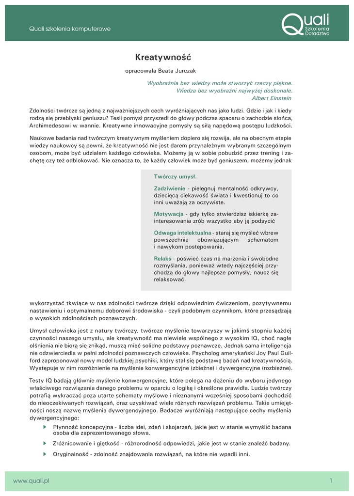 Quali szkolenia komputerowe Kreatywność opracowała Beata Jurczak Wyobraźnia bez wiedzy może stworzyć rzeczy piękne. Wiedza bez wyobraźni najwyżej doskonałe. Albert Einstein Zdolności twórcze są jedną z najważniejszych cech wyróżniających nas jako ludzi. Gdzie i jak i kiedy rodzą się przebłyski geniuszu? Tesli pomysł przyszedł do głowy podczas spaceru o zachodzie słońca, Archimedesowi w wannie. Kreatywne innowacyjne pomysły są siłą napędową postępu ludzkości. Naukowe badania nad twórczym kreatywnym myśleniem dopiero się rozwija, ale na obecnym etapie wiedzy naukowcy są pewni, że kreatywność nie jest darem przynależnym wybranym szczególnym osobom, może być udziałem każdego człowieka. Możemy ją w sobie pobudzić przez trening i zachętę czy też odblokować. Nie oznacza to, że każdy człowiek może być geniuszem, możemy jednak Twórczy umysł. Zadziwienie - pielęgnuj mentalność odkrywcy, dziecięcą ciekawość świata i kwestionuj to co inni uważają za oczywiste. Motywacja - gdy tylko stwierdzisz iskierkę zainteresowania zrób wszystko aby ją podsycić Odwaga intelektualna - staraj się myśleć wbrew powszechnie obowiązującym schematom i nawykom postępowania. Relaks - poświeć czas na marzenia i swobodne rozmyślania, ponieważ wtedy najczęściej przychodzą do głowy najlepsze pomysły, naucz się relaksować. wykorzystać tkwiące w nas zdolności twórcze dzięki odpowiednim ćwiczeniom, pozytywnemu nastawieniu i optymalnemu doborowi środowiska - czyli podobnym czynnikom, które przesądzają o wysokich zdolnościach poznawczych. Umysł człowieka jest z natury twórczy, twórcze myślenie towarzyszy w jakimś stopniu każdej czynności naszego umysłu, ale kreatywność ma niewiele wspólnego z wysokim IQ, choć nagłe olśnienia nie biorą się znikąd, muszą mieć solidne podstawy poznawcze. Jednak sama inteligencja nie odzwierciedla w pełni zdolności poznawczych człowieka. Psycholog amerykański Joy Paul Guilford zaproponował nowy model ludzkiej psychiki, który stał się podstawą badań nad kreatywnością. Występuje w nim rozróżnienie na myślenie konwergencyjne (zbieżne) i dywergencyjne (rozbieżne). Testy IQ badają głównie myślenie konwergencyjne, które polega na dążeniu do wyboru jedynego właściwego rozwiązania danego problemu w oparciu o logikę i określone prawidła. Ludzie twórczy potrafią wykraczać poza utarte schematy myślowe i nieznanymi wcześniej sposobami dochodzić do nieoczekiwanych rozwiązań, oraz uzyskiwać wiele różnych rozwiązań problemu. Takie umiejętności noszą nazwę myślenia dywergencyjnego. Badacze wyróżniają następujące cechy myślenia dywergencyjnego: Płynność koncepcyjna - liczba idei, zdań i skojarzeń, jakie jest w stanie wymyślić badana osoba dla zaprezentowanego słowa. Zróżnicowanie i giętkość - różnorodność odpowiedzi, jakie jest w stanie znaleźć badany. Oryginalność - zdolność znajdowania rozwiązań, na które nie wpadli inni. www.quali.pl 1 Quali szkolenia komputerowe Dopracowanie pomysłów - umiejętność sformułowania idei, rozbudowania jej i przetworzenia w konkretne rozwiązanie Wyczuwanie problemu - zdolność pojmowania sedna sprawy oraz trudności, jakich nastręcza jego rozwiązanie Przedefiniowanie problemów - umiejętność spojrzenia na znany w zupełnie nowym świetle Jak rozwijać Twórcze myślenie. Należy być ciekawym świata i śmiało obalać myślowe schematy. Usunąć rozmaite bariery, przeszkody i bloki, które hamują twórczą aktywność. Rozwinąć wiedzę o twórczości i ćwiczyć sprawności poznawcze, niezbędne w myśleniu twórczym. Usuwanie przeszkód. Ludzie (w szczególności dzieci) dysponują naturalnym potencjałem twórczym, który w wyniku niewłaściwych postaw ulega zahamowaniu. Aby się te naturalne zdolności rozwijały, należy nagradzać twórcze zachowania. Można to robić w następujący sposób: Odnosić się z szacunkiem do niezwykłych pytań. Powstrzymać komentarze negatywne oraz inne tego typu reakcje jak irytacja, lekceważenie, chęć udzielenia natychmiastowej, krótkiej odpowiedzi. Negatywna reakcja redukuje ciekawość poznawczą i zniechęca dzieci do poszukiwania odpowiedzi. Należy okazywać szacunek wobec niezwykłych pomysłów, pozwolić na fantazjowanie, wyrażanie własnego zdania bez krytyki, wyśmiewania. Aprobata może być wyrażona w słowach, gestach lub wspólnych działaniach w wykorzystaniu pomysłu. Warto okazać przez jakiś czas, że pomysły są wartościowe, nie ignorować ich, spędzić trochę czasu bez oceny. Oceny prowokują reakcje obronne, prowadzą do zachowań stereotypowych i konwencjonalnych. Gdy mamy do czynienia z sytuacją braku oceny można podjąć ryzyko wypróbowania nowych lub nietypowych form zachowania, be z tego jakakolwiek twórczość nie jest w stanie zaistnieć. Warto silnie związać oceny z jej przyczynami i konsekwencjami, czyli unikać uogólnionych ocen, typu: „to jest dobre”, „to jest złe”. Znacznie lepiej jest używać sformułowań w rodzaju: To mi się podoba, bo...” To można ulepszyć w ten sposób, żeby...”, czyli warto wskazać dlaczego pomysł jest dobry lub nie, jak można go poprawić i do jakich skutków może doprowadzić. To uczy myślenia przyczynowo – skutkowego, oraz oceniania konsekwencji. Czasami bardzo trudno jest od razu ocenić dany pomysł, powiązanie ocen z przyczynami i skutkami ułatwia zrozumienie, co w pomyśle zasługuje na uwagę a co można poprawić. Człowiek uczy się w ten sposób, że warto wymyślać coś nowego. Trening twórczego myślenia. Warto przejść trening twórczego myślenia, który wyposaży człowieka w umiejętności tworzenia nowych pomysłów, niekonwencjonalnego spostrzegania rzeczywistości i skutecznego eliminowania przeszkód w myśleniu twórczym. Chodzi o rozwijanie kreatywności jako cechy niż o stymulowanie aktywności twórc