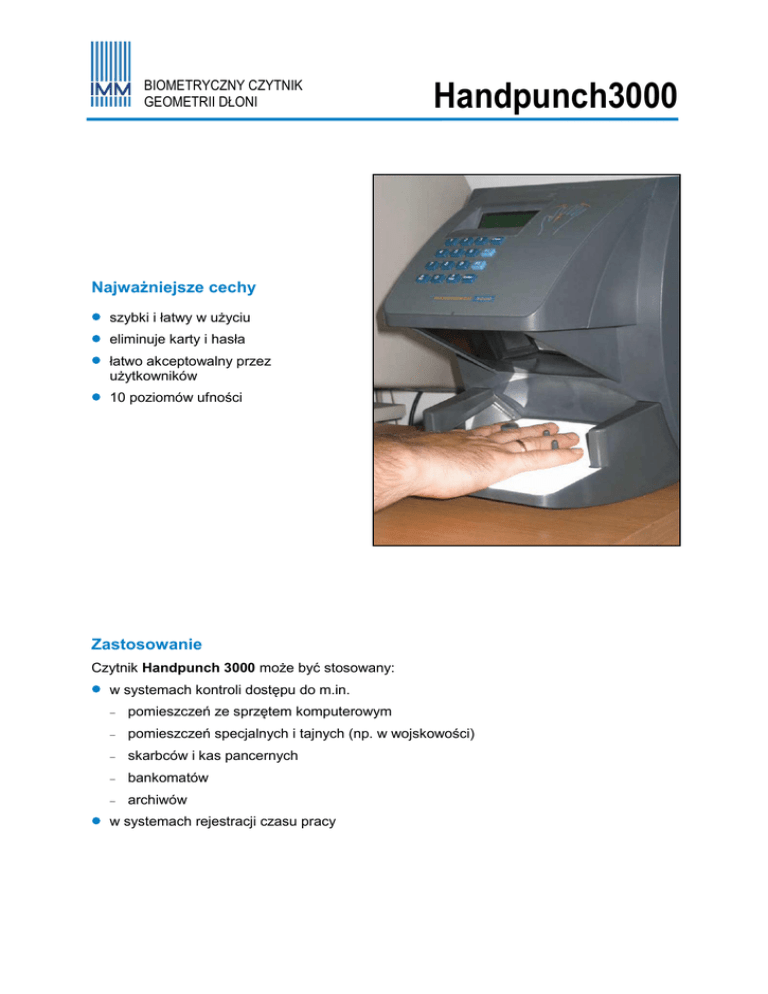 BIOMETRYCZNY CZYTNIK GEOMETRII DŁONI Handpunch3000 Najważniejsze cechy szybki i łatwy w użyciu eliminuje karty i hasła łatwo akceptowalny przez użytkowników 10 poziomów ufności Zastosowanie Czytnik Handpunch 3000 może być stosowany: w systemach kontroli dostępu do m.in. pomieszczeń ze sprzętem komputerowym pomieszczeń specjalnych i tajnych (np. w wojskowości) skarbców i kas pancernych bankomatów archiwów w systemach rejestracji czasu pracy Opis działania Czytnik Handpunch 3000 dokonuje rejestracji wejścia lub wyjścia po wprowadzeniu kodu identyfikacyjnego i przyłożeniu dłoni w wyznaczone miejsce. Weryfikacja użytkownika następuje po porównaniu parametrów przyłożonej dłoni z zapisanym wcześniej wzorcem. Akcesoria Czytnik może być wyposażony dodatkowo w: zapasową baterię szybki modem wewnętrzny rozszerzenie pamięci konwerter RS-232 na RS-422 Dane techniczne Czas weryfikacji Liczba rejestrowanych użytkowników Liczba pamiętanych rejestracji Liczba poziomów ufności Długość PIN-kodu Komunikacja Zasilanie Wymiary (mm) Waga < 1,0 s standardowo 512 możliwość rozszerzenia do 9728 5187 10 do 10 cyfr RS-485 4-przewodowy (RS-422) RS-232 12-24 V DC lub AC 223 (szer.) x 296 (wys.) x 217 (gł.) 2,7 kg Temperatura pracy (ºC) 5-40 Oprogramowanie XChronos – Instytut Maszyn Matematycznych Czytnik Handpunch 3000 dystrybuowany jest przez firmę Ingersoll Rand. INSTYTUT MASZYN MATEMATYCZNYCH 02-078 Warszawa, ul. Krzywickiego 34, tel. (22) 621 75 17, fax. (22) 629 92 70 e-mail: [email protected], www.imm.org.pl