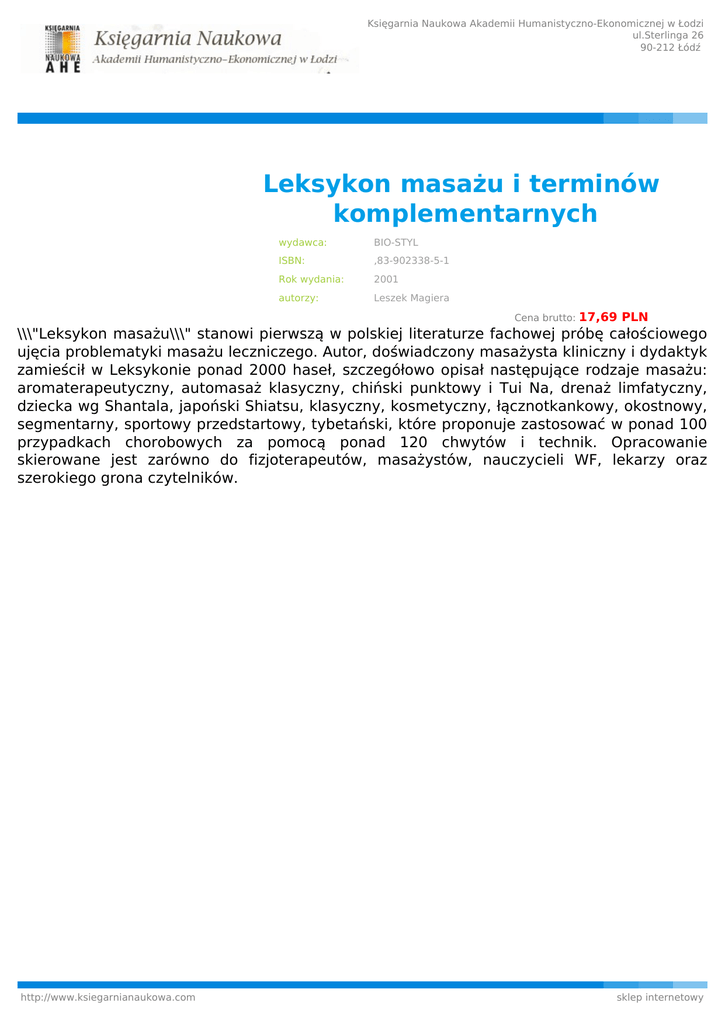 Księgarnia Naukowa Akademii Humanistyczno-Ekonomicznej w Łodzi ul.Sterlinga 26 90-212 Łódź Leksykon masażu i terminów komplementarnych wydawca: BIO-STYL ISBN: ,83-902338-5-1 Rok wydania: 2001 autorzy: Leszek Magiera Cena brutto: 17,69 PLN \\\"Leksykon masażu\\\" stanowi pierwszą w polskiej literaturze fachowej próbę całościowego ujęcia problematyki masażu leczniczego. Autor, doświadczony masażysta kliniczny i dydaktyk zamieścił w Leksykonie ponad 2000 haseł, szczegółowo opisał następujące rodzaje masażu: aromaterapeutyczny, automasaż klasyczny, chiński punktowy i Tui Na, drenaż limfatyczny, dziecka wg Shantala, japoński Shiatsu, klasyczny, kosmetyczny, łącznotkankowy, okostnowy, segmentarny, sportowy przedstartowy, tybetański, które proponuje zastosować w ponad 100 przypadkach chorobowych za pomocą ponad 120 chwytów i technik. Opracowanie skierowane jest zarówno do fizjoterapeutów, masażystów, nauczycieli WF, lekarzy oraz szerokiego grona czytelników. http://www.ksiegarnianaukowa.com sklep internetowy