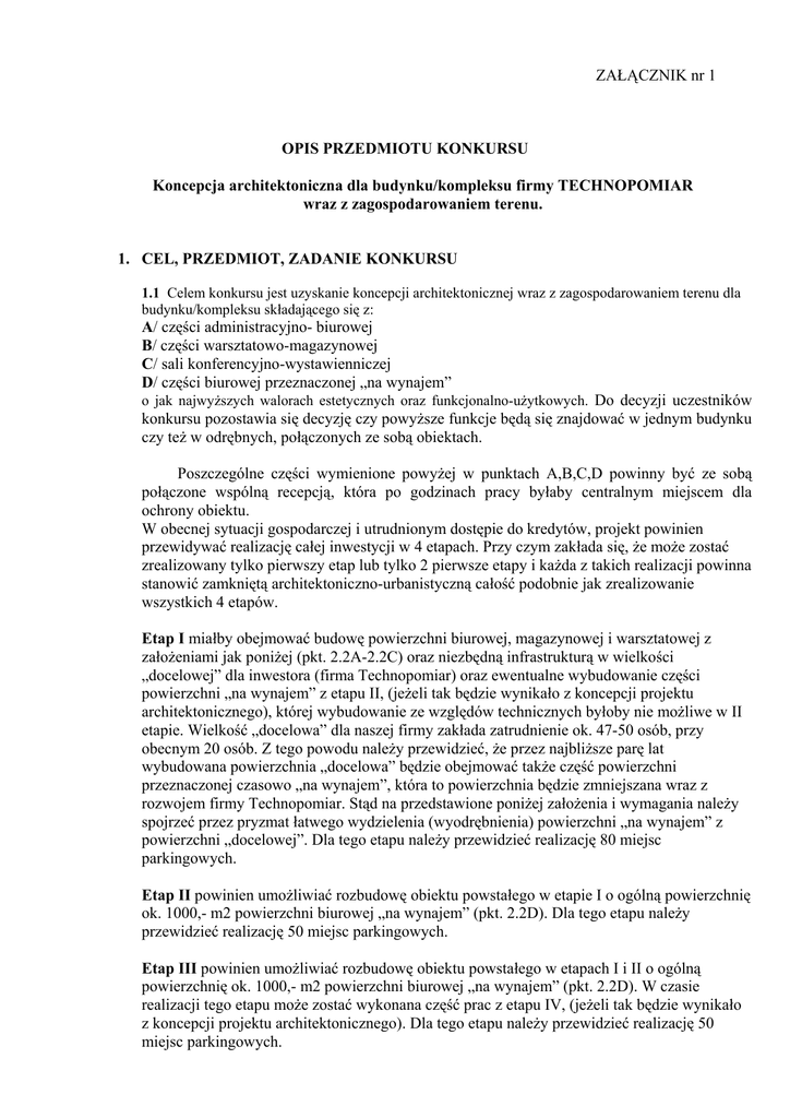 ZAŁĄCZNIK nr 1 OPIS PRZEDMIOTU KONKURSU Koncepcja architektoniczna dla budynku/kompleksu firmy TECHNOPOMIAR wraz z zagospodarowaniem terenu. 1. CEL, PRZEDMIOT, ZADANIE KONKURSU 1.1 Celem konkursu jest uzyskanie koncepcji architektonicznej wraz z zagospodarowaniem terenu dla budynku/kompleksu składającego się z: A/ części administracyjno- biurowej B/ części warsztatowo-magazynowej C/ sali konferencyjno-wystawienniczej D/ części biurowej przeznaczonej „na wynajem” o jak najwyższych walorach estetycznych oraz funkcjonalno-użytkowych. Do decyzji uczestników konkursu pozostawia się decyzję czy powyższe funkcje będą się znajdować w jednym budynku czy też w odrębnych, połączonych ze sobą obiektach. Poszczególne części wymienione powyżej w punktach A,B,C,D powinny być ze sobą połączone wspólną recepcją, która po godzinach pracy byłaby centralnym miejscem dla ochrony obiektu. W obecnej sytuacji gospodarczej i utrudnionym dostępie do kredytów, projekt powinien przewidywać realizację całej inwestycji w 4 etapach. Przy czym zakłada się, że może zostać zrealizowany tylko pierwszy etap lub tylko 2 pierwsze etapy i każda z takich realizacji powinna stanowić zamkniętą architektoniczno-urbanistyczną całość podobnie jak zrealizowanie wszystkich 4 etapów. Etap I miałby obejmować budowę powierzchni biurowej, magazynowej i warsztatowej z założeniami jak poniżej (pkt. 2.2A-2.2C) oraz niezbędną infrastrukturą w wielkości „docelowej” dla inwestora (firma Technopomiar) oraz ewentualne wybudowanie części powierzchni „na wynajem” z etapu II, (jeżeli tak będzie wynikało z koncepcji projektu architektonicznego), której wybudowanie ze względów technicznych byłoby nie możliwe w II etapie. Wielkość „docelowa” dla naszej firmy zakłada zatrudnienie ok. 47-50 osób, przy obecnym 20 osób. Z tego powodu należy przewidzieć, że przez najbliższe parę lat wybudowana powierzchnia „docelowa” będzie obejmować także część powierzchni przeznaczonej czasowo „na wynajem”, która to powierzchnia będzie zmniejszana wraz z rozwojem firmy Technopomiar. Stąd na przedstawione poniżej założenia i wymagania należy spojrzeć przez pryzmat łatwego wydzielenia (wyodrębnienia) powierzchni „na wynajem” z powierzchni „docelowej”. Dla tego etapu należy przewidzieć realizację 80 miejsc parkingowych. Etap II powinien umożliwiać rozbudowę obiektu powstałego w etapie I o ogólną powierzchnię ok. 1000,- m2 powierzchni biurowej „na wynajem” (pkt. 2.2D). Dla tego etapu należy przewidzieć realizację 50 miejsc parkingowych. Etap III powinien umożliwiać rozbudowę obiektu powstałego w etapach I i II o ogólną powierzchnię ok. 1000,- m2 powierzchni biurowej „na wynajem” (pkt. 2.2D). W czasie realizacji tego etapu może zostać wykonana część prac z etapu IV, (jeżeli tak będzie wynikało z koncepcji projektu architektonicznego). Dla tego etapu należy przewidzieć realizację 50 miejsc parkingowych. Etap IV powinien umożliwiać rozbudowę obiektu powstałego w etapach I, II i III o ogólną powierzchnię ok. 1000,- m2 powierzchni biurowej „na wynajem” (pkt. 2.2D). Dla tego etapu należy przewidzieć realizację 50 miejsc parkingowych. Powyższe plany inwestora powinny być również uwzględnione przy opracowywaniu koncepcji zagospodarowania działki. . 1.2 Zgodnie z Decyzją NR 220/2007 ( załącznik nr ) warunki zabudowy obejmują budowę hali magazynowo-montażowej wraz z budynkiem mieszczącym część serwisową i biurowo-socjalną, z parkingami, obsługą komunikacyjną i elementami infrastruktury technicznej (…). 1.3 Obecny stan terenu – teren niezabudowany, w przeszłości znajdowały się na nim parterowe budynki ( prawdopodobnie warsztaty), które zostały niedawno rozebrane. Prawdopodobnie na terenie działki znajdują się podziemne szamba i studzienki. Na działce 6/6 i 6/8 znajduje się kilkanaście dużych drzew ( głównie topole) oraz liczne dzikie krzewy (samosiejki). W części północnej działka sąsiaduje z warsztatami wyposażonymi w hałaśliwą wentylację – dlatego część biurowa powinna być zaprojektowana w południowej/centralnej części działki 6/8. Ze względu na warunki gruntowo-wodne nie planuje się podpiwniczenia budynków (patrz dokumentacja geotechniczna). 2. WYTYCZNE PROGRAMOWE 2.1 Informacja o firmie Technopomiar sp.z o.o. Firma Technopomiar sp. z o.o. zajmuje się projektowaniem, dostawami i serwisowaniem kompleksowych systemów analitycznych aparatury kontrolno pomiarowej, przeznaczonych do pomiarów parametrów fizyko-chemicznych cieczy i gazów. Jednocześnie firma Technopomiar sp. z o.o. jest mecenasem sztuki – organizuje plenery malarskie, wystawy, wernisaże i aukcje obrazów. Dlatego też bardzo istotne jest połączenie funkcji biurowej z funkcją wystawienniczą (wykorzystanie do tego celu holu, sali konferencyjnej, klatki schodowej, korytarzy, pomieszczeń biurowych). Istotne jest, aby budynek będący, na co dzień biurem, z dużą ilością obrazów na ścianach, mógł się zamienić na weekend w „miejsce magiczne” gdzie organizuje się wernisaż sztuki. Dlatego inwestorowi zależy na ciekawej, nowoczesnej bryle architektonicznej budynku, na funkcjonalności pozwalającej na pracę w komfortowych warunkach oraz na ekspozycję obrazów i organizację imprez dla zaproszonych gości. 2.2 Wytyczne funkcjonalno-programowe A/ część administracyjno-biurowa Inwestor oczekuje wysokiego standardu technicznego odpowiadającego budynkom biurowym klasy A (klimatyzowane pomieszczenia, sieci logiczne, karty dostępu itp.). Wielkość budynku powinna zapewniać komfortowe warunki pracy dla 50 osób. Ponieważ w chwili obecnej firma Technopomiar zatrudnia ok. 20 osób to w początkowym okresie część pomieszczeń będzie wynajmowana. Koncepcja powinna przewidzieć wydzielenie modułu ( lub jednej kondygnacji) z oddzielnym węzłem sanitarn