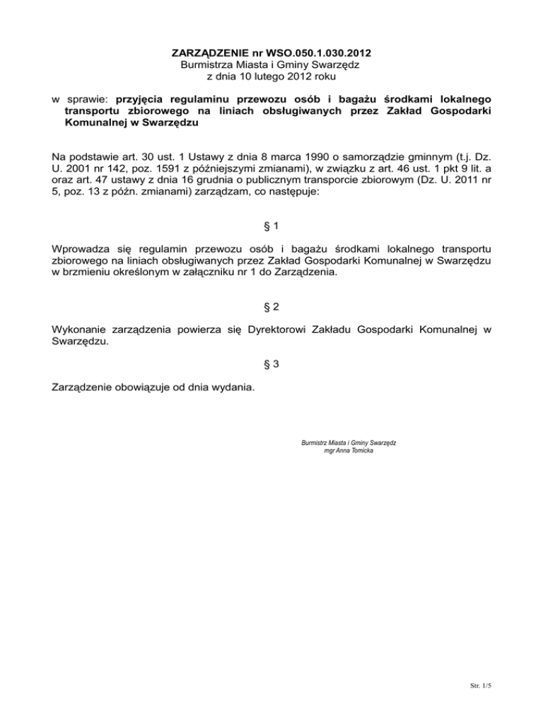 ZARZĄDZENIE nr WSO.050.1.030.2012 Burmistrza Miasta i Gminy Swarzędz z dnia 10 lutego 2012 roku w sprawie: przyjęcia regulaminu przewozu osób i bagażu środkami lokalnego transportu zbiorowego na liniach obsługiwanych przez Zakład Gospodarki Komunalnej w Swarzędzu Na podstawie art. 30 ust. 1 Ustawy z dnia 8 marca 1990 o samorządzie gminnym (t.j. Dz. U. 2001 nr 142, poz. 1591 z późniejszymi zmianami), w związku z art. 46 ust. 1 pkt 9 lit. a oraz art. 47 ustawy z dnia 16 grudnia o publicznym transporcie zbiorowym (Dz. U. 2011 nr 5, poz. 13 z późn. zmianami) zarządzam, co następuje: §1 Wprowadza się regulamin przewozu osób i bagażu środkami lokalnego transportu zbiorowego na liniach obsługiwanych przez Zakład Gospodarki Komunalnej w Swarzędzu w brzmieniu określonym w załączniku nr 1 do Zarządzenia. §2 Wykonanie zarządzenia powierza się Dyrektorowi Zakładu Gospodarki Komunalnej w Swarzędzu. §3 Zarządzenie obowiązuje od dnia wydania. Burmistrz Miasta i Gminy Swarzędz mgr Anna Tomicka Str. 1/5 Załącznik nr 1 do Zarządzenia nr WSO.050.1.030.2012 Burmistrza Miasta i Gminy Swarzędz REGULAMIN przewozu osób i bagażu środkami lokalnego transportu zbiorowego na liniach obsługiwanych przez Zakład Gospodarki Komunalnej w Swarzędzu Rozdział I POSTANOWIENIA OGÓLNE §1 1. Regulamin określa zasady i warunki przewozu osób oraz bagażu ręcznego środkami lokalnego transportu zbiorowego wykonywanego przez Zakład Gospodarki Komunalnej w Swarzędzu 2. Niniejszy regulamin nie narusza postanowień Uchwały nr LIV/398/2006 Rady Miejskiej w Swarzędzu z dnia 29 marca 2006 r. wraz z późniejszymi zmianami. §2 Przez określenia użyte w niniejszym regulaminie należy rozumieć: 1) Operator lub Zakład – samorządowy zakład budżetowy Gminy Swarzędz pod nazwą Zakład Gospodarki Komunalnej w Swarzędzu, 2) podróżny – osoba fizyczna korzystająca ze świadczonej przez Operatora usługi przewozu, 3) kierujący pojazdem – kierowca autobusu komunikacji miejskiej obsługiwanej przez Operatora, 4) środek lokalnego transportu zbiorowego, pojazd – specjalnie oznakowany autobus miejski, 5) obsługa przewozu – kierujący pojazdem, pracownik nadzoru ruchu Operatora, 6) uchwała - Uchwała nr LIV/398/2006 Rady Miejskiej w Swarzędzu z dnia 29 marca 2006 r. wraz z późniejszymi zmianami Rozdział II OGÓLNE ZASADY WYKONYWANIA USŁUG PUBLICZNEGO TRANSPORTU ZBIOROWEGO §3 1. Operator, w imieniu i na rzecz Gminy Swarzędz, świadczy odpłatne usługi przewozu osób i bagażu ręcznego, o charakterze użyteczności publicznej na podstawie aktu wewnętrznego zgodnie z art. 4 ust. 2 pkt 4 Ustawy z dnia 16.12.2010 roku o publicznym transporcie zbiorowym (Dz. U. 2011 nr 5 poz. 13 z późn. zmianami), przy użyciu odpowiednich pojazdów. 2. Operator zobowiązany jest do zapewnienia podróżnym warunków bezpieczeństwa i higieny wymaganych przy wykonywaniu przewozu stosownie do rodzaju pojazdu oraz – w miarę posiadanych środków – umożliwienia korzystania z pojazdów przez osoby niepełnosprawne. 3. W przypadku potrzeby kierujący pojazdem podejmuje działania ułatwiające korzystanie ze środków transportu osobom niepełnosprawnym, w tym również poruszających się na wózkach inwalidzkich. 4. Operator informuje podróżnych o taryfie opłat za usługi przewozowe środkami lokalnego transportu zbiorowego, kategoriach osób uprawnionych do opłaty ulgowej i przewozów bezpłatnych, wysokości opłaty dodatkowej za przejazd bez ważnego biletu oraz możliwości wniesienia wniosków, reklamacji i skarg poprzez umieszczenie w pojeździe stosownych ogłoszeń. Str. 2/5 5. W razie stwierdzenia braku ważnego biletu i/lub odpowiedniego dokumentu potwierdzającego uprawnienie do przejazdów ulgowych bądź bezpłatnych zastosowanie mają odpowiednie przepisy Uchwały. 6. Pasażer winien zgłosić kierującemu pojazdem fakt awarii biletomatu, a kierujący pojazdem winien niezwłocznie zgłosić taką awarię dyspozytorowi w celu odnotowania daty, godziny i nr pojazdu, w którym awaria taka wystąpiła. 7. Operator jest zwolniony od obowiązku przewozu w przypadku zaistnienia okoliczności uniemożliwiających przewóz, których Operator nie mógł uniknąć, ani im zapobiec. 8. W przypadku awarii pojazdu lub innych zdarzeń uniemożliwiających Operatorowi wykonanie przewozu pojazdem, w którym podróżny skasował bilet, podróżnemu temu, zgodnie z Uchwałą, przysługuje prawo kontynuowania jazdy innym pojazdem na tej linii, lub innej, przebiegającej tą samą trasą. Rozdział II WARUNKI PRZEWOZU OSÓB §4 1. W czasie przewozu podróżny powinien przestrzegać obowiązujących przepisów prawa, ogólnie obowiązujących norm zachowania w miejscach publicznych, postanowień zawartych w niniejszym rozdziale, a także zasad bezpieczeństwa w ruchu drogowym, a w szczególności: 1) po wejściu do pojazdu bezzwłocznie skasować bilet jednorazowy lub posiadać przy sobie bilet okresowy, 2) w przypadku korzystania z przejazdu ulgowego bądź bezpłatnego powinien posiadać przy sobie dokument uprawniający do korzystania z ulgowego bądź bezpłatnego przejazdu, 3) nie odstępować innym podróżnym skasowanych biletów jednorazowych lub okresowych biletów imiennych, 4) okazywać osobom uprawnionym do kontroli, bilety oraz dokumenty uprawniające do ulgowego lub bezpłatnego przejazdu, 5) wsiadać i wysiadać na przystankach po całkowitym zatrzymaniu pojazdu i otwarciu drzwi, 6) wsiadać do pojazdu na przystankach końcowych wyłącznie po zakończeniu czynności manewrowych związanych ze zmianą kierunku jazdy; podczas czynności manewrowych podróżny nie może przebywać w pojeździe, 7) trzymać się uchwytów lub poręczy podczas jazdy, 2. Podróżnym zabrania się w szczególności: 1) otwierania drzwi pojazdu w czasie jazdy, 2) nieuzasadnionego sygnalizowania zatrzymania pojazdu, 3) wsiadania do pojazdu i wysiadania z niego po usłyszeniu sygnału dźwiękow