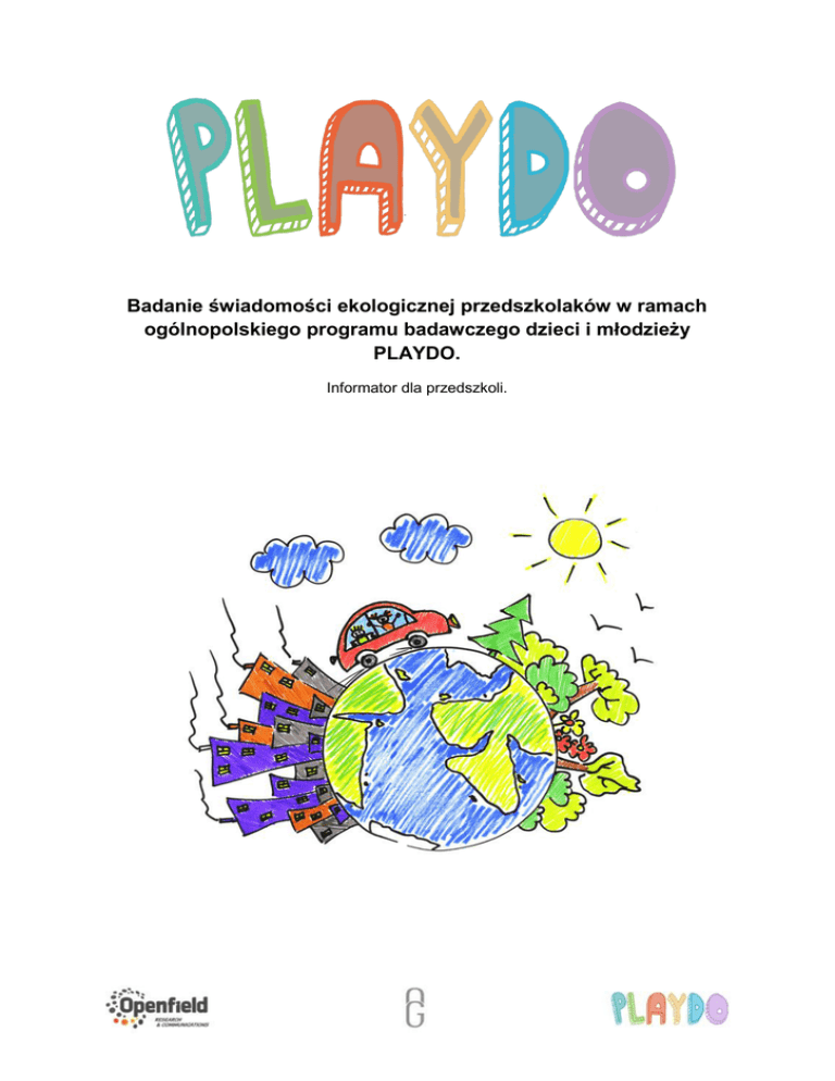 Badanie świadomości ekologicznej przedszkolaków w ramach ogólnopolskiego programu badawczego dzieci i młodzieży PLAYDO. Informator dla przedszkoli. DLACZEGO STWORZYLIŚMY PLAYDO? PLAYDO powstało po to, by poznawać opinie dzieci i młodzieży, a jednocześnie wspierać ich rozwój. Instytuty badawcze systematycznie śledzą poglądy dorosłych Polaków, pomijając zdanie przedszkolaków i uczniów, a to przecież oni niebawem wkroczą w dorosłe życie, podejmując zawodowe, światopoglądowe i konsumenckie decyzje. PLAYDO oddaje głos najmłodszym, pozwalając im wypowiedzieć się na temat istotnych zjawisk społecznych oraz kierowanych do nich produktów. Raport z każdego badania pomaga zrozumieć świat dziecka współpracującym z nami instytucjom i firmom, stając się inspiracją do stworzenia sprzyjających warunków rozwoju młodemu pokoleniu. Dzieci, dzieląc się opiniami, świetnie się bawią i jednocześnie uczą, a to wszystko dzięki autorskiej metodzie badań, przyjmującej postać kreatywnych zajęć. PLAYDO to program nie tylko o dzieciach, lecz przede wszystkim dla dzieci. Każdy projekt badawczy jest źródłem finansowania pomocy dydaktycznych oraz zabawek dla wychowanków przedszkoli i szkół zaangażowanych w PLAYDO, dzięki czemu program wspiera edukację dzieci i młodzieży w Polsce. Organizatorem PLAYDO jest firma Openfield sp. z o.o. oraz pracownia psychologiczna GNZ – obie z siedzibą w Opolu. GŁÓWNE ZASADY PLAYDO. Badania prowadzimy w znanej dziecku atmosferze – w przedszkolu lub szkole, do której uczęszcza – co zapewnia młodemu respondentowi poczucie komfortu i bezpieczeństwa. Scenariusz każdego badania przygotowywany jest w oparciu o koncepcje rozwoju dziecięcego, nad czym czuwają nasi specjaliści z nauk psychologicznych i pedagogicznych. Badania z udziałem dzieci wymagają bowiem zupełnie innego podejścia, niż w przypadku dorosłych uczestników. Dobieramy takie sposoby rozmowy z dzieckiem i jego obserwacji, by udział w badaniu był dla niego ciekawym doświadczeniem i kreatywną formą spędzenia czasu, nad czym stale pracuje obecny podczas badania nasz psycholog. Zawsze pytamy rodziców o zgodę na udział dziecka w badaniu, a następnie prosimy o pozwolenie samo dziecko. Na każdym etapie prowadzenia badania ma prawo odmówić odpowiedzi na pytanie lub wykonania postawionego przed nim zadania, a także zażądać zakończenia badania. Przestrzegamy wymagań międzynarodowych kodeksów badawczych i nie realizujemy projektów, które budzą jakiekolwiek zastrzeżenia natury etycznej. DLACZEGO ŚWIADOMOŚĆ EKOLOGICZNA? Obecnie obserwuje się wzmożony nacisk na ochronę środowiska naturalnego, popularne są idee zrównoważonego rozwoju i przyjęcia proekologicznej postawy, warto więc sprawdzić, czy podobne hasła znane są przedszkolakom. Badanie ukaże nie tylko poziom wiedzy na temat ekologii, lecz przede wszystkim poziom deklarowanych działań dzieci i sposób rozumienia przez nie zasad życia w zgodzie z przyrodą. Przedszkolaki opowiedzą: w jaki sposób troszczą się o przyrodę; jak postępują z odpadami; jak korzystają z energii elektrycznej; jak korzystają z bieżącej wody; co pomaga, a co szkodzi środowisku naturalnemu. Dzieci, dzieląc się opiniami, doświadczą wspaniałej przygody – będą się bawić, uczyć i odkrywać nieznane aspekty otaczającej je rzeczywistości. Dostaną odznaki „Małych Ekologów”, a najbardziej proekologiczne przedszkola wyjątkowe nagrody dla swoich podopiecznych w postaci kreatywnych zabawek i materiałów edukacyjnych oraz certyfikat „Dbam o środowisko”. Badanie pozwoli: określić poziom wiedzy przedszkolaków na temat ochrony środowiska naturalnego poznać działania, jakie najmłodsi sami podejmują w celu ochrony przyrody wzbogacić program kształcenia ekologicznego najmłodszych umocnić postawę proekologiczną przedszkolaków nadążyć za zmianą postaw i wartości młodego pokolenia wesprzeć rozwój najmłodszych dzięki nowym zabawkom i materiałom edukacyjnym zainspirować wychowawców i rodziców do kształtowania świadomości ekologicznej dzieci JAK ZREALIZUJEMY BADANIE? Badaniem zostaną objęte wybrane przedszkola w całej Polsce, a przeprowadzą je nasi psychologowie we współpracy z wychowawcami uczestniczących w badaniu dzieci. Przedszkola nie ponoszą żadnych kosztów związanych organizacją i realizacją badania oraz zapewnieniem niezbędnych do tego materiałów. Sposób prowadzenia badania został opracowany z uwzględnieniem możliwości poznawczych przedszkolaków – przyjmuje ono formę zabawy i kreatywnych zajęć, obejmując gry, łamigłówki i rozwijające wyobraźnię dziecka materiały. Dzieci z pewnością nie będą się nudzić, co potwierdziły wstępne badania z udziałem przedszkolaków w Opolu. Wyniki badania zostaną opracowane w formie raportu, który przekażemy wszystkim współpracującym z nami placówkom. Nie będzie on zawierał danych na temat poszczególnych przedszkoli, tylko zbiorcze dane o zasięgu wojewódzkim i ogólnopolskim. Wszystkie przedszkola biorące udział w badaniu zostaną zaproszone do konkursu ekologicznego. Zadaniem konkursowym będzie opracowanie krótkiego projektu edukacji ekologicznej przedszkolaków, zawierającego propozycje zajęć/akcji/inicjatyw ekologicznych na każdy miesiąc w roku. Zaproponowane pomysły powinny wynikać z rezultatów badania, by podnosić świadomość w tych ekologicznych obszarach, które są dzieciom najbardziej odległe. Szczegóły konkursu zostaną ogłoszone po zakończeniu części badawczej i opublikowaniu raportu z badania. Autorzy najlepszych prac otrzymają atrakcyjne nagrody dla swoich podopiecznych, a wszystkim przedszkolom biorącym udział w konkursie przyznamy certyfikat „Dbam o środowisko”. Wszystkie prace zostaną zawarte w przewodniku edukacji ekologicznej, który będzie przesyłany do placówek edukacyjnych w Polsce jako źród