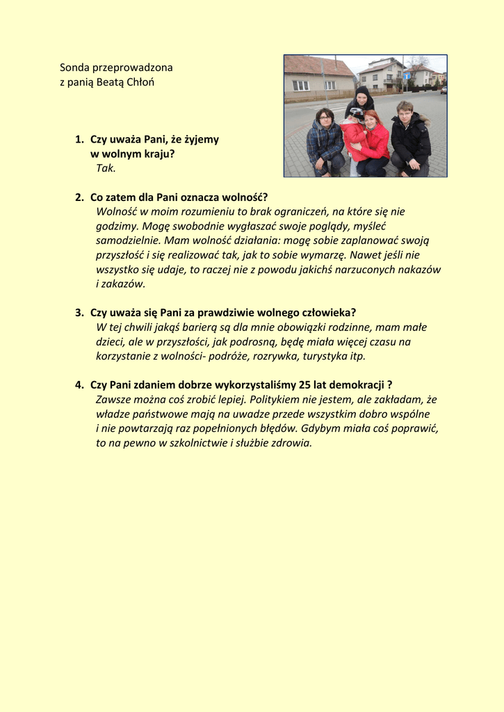 Sonda przeprowadzona z panią Beatą Chłoń 1. Czy uważa Pani, że żyjemy w wolnym kraju? Tak. 2. Co zatem dla Pani oznacza wolność? Wolność w moim rozumieniu to brak ograniczeń, na które się nie godzimy. Mogę swobodnie wygłaszać swoje poglądy, myśleć samodzielnie. Mam wolność działania: mogę sobie zaplanować swoją przyszłość i się realizować tak, jak to sobie wymarzę. Nawet jeśli nie wszystko się udaje, to raczej nie z powodu jakichś narzuconych nakazów i zakazów. 3. Czy uważa się Pani za prawdziwie wolnego człowieka? W tej chwili jakąś barierą są dla mnie obowiązki rodzinne, mam małe dzieci, ale w przyszłości, jak podrosną, będę miała więcej czasu na korzystanie z wolności- podróże, rozrywka, turystyka itp. 4. Czy Pani zdaniem dobrze wykorzystaliśmy 25 lat demokracji ? Zawsze można coś zrobić lepiej. Politykiem nie jestem, ale zakładam, że władze państwowe mają na uwadze przede wszystkim dobro wspólne i nie powtarzają raz popełnionych błędów. Gdybym miała coś poprawić, to na pewno w szkolnictwie i służbie zdrowia.