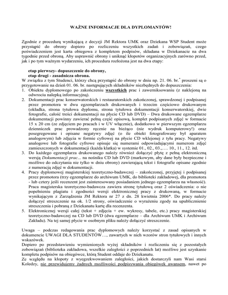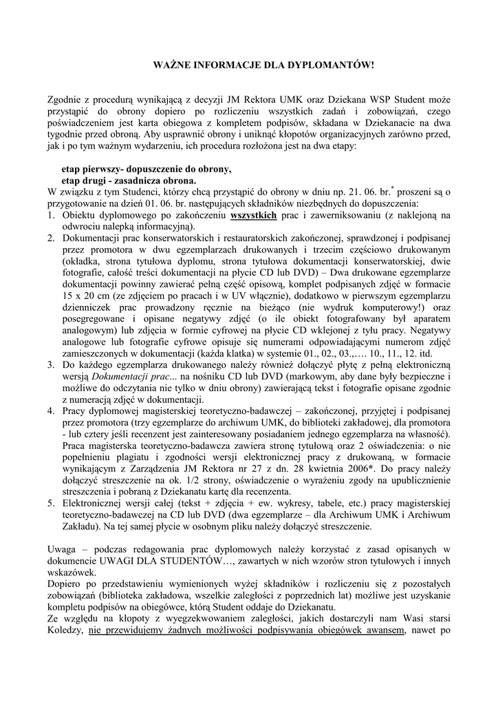 WAśNE INFORMACJE DLA DYPLOMANTÓW! Zgodnie z procedurą wynikającą z decyzji JM Rektora UMK oraz Dziekana WSP Student moŜe przystąpić do obrony dopiero po rozliczeniu wszystkich zadań i zobowiązań, czego poświadczeniem jest karta obiegowa z kompletem podpisów, składana w Dziekanacie na dwa tygodnie przed obroną. Aby usprawnić obrony i uniknąć kłopotów organizacyjnych zarówno przed, jak i po tym waŜnym wydarzeniu, ich procedura rozłoŜona jest na dwa etapy: etap pierwszy- dopuszczenie do obrony, etap drugi - zasadnicza obrona. W związku z tym Studenci, którzy chcą przystąpić do obrony w dniu np. 21. 06. br.* proszeni są o przygotowanie na dzień 01. 06. br. następujących składników niezbędnych do dopuszczenia: 1. Obiektu dyplomowego po zakończeniu wszystkich prac i zawerniksowaniu (z naklejoną na odwrociu nalepką informacyjną). 2. Dokumentacji prac konserwatorskich i restauratorskich zakończonej, sprawdzonej i podpisanej przez promotora w dwu egzemplarzach drukowanych i trzecim częściowo drukowanym (okładka, strona tytułowa dyplomu, strona tytułowa dokumentacji konserwatorskiej, dwie fotografie, całość treści dokumentacji na płycie CD lub DVD) – Dwa drukowane egzemplarze dokumentacji powinny zawierać pełną część opisową, komplet podpisanych zdjęć w formacie 15 x 20 cm (ze zdjęciem po pracach i w UV włącznie), dodatkowo w pierwszym egzemplarzu dzienniczek prac prowadzony ręcznie na bieŜąco (nie wydruk komputerowy!) oraz posegregowane i opisane negatywy zdjęć (o ile obiekt fotografowany był aparatem analogowym) lub zdjęcia w formie cyfrowej na płycie CD wklejonej z tyłu pracy. Negatywy analogowe lub fotografie cyfrowe opisuje się numerami odpowiadającymi numerom zdjęć zamieszczonych w dokumentacji (kaŜda klatka) w systemie 01., 02., 03.,…. 10., 11., 12. itd. 3. Do kaŜdego egzemplarza drukowanego naleŜy równieŜ dołączyć płytę z pełną elektroniczną wersją Dokumentacji prac... na nośniku CD lub DVD (markowym, aby dane były bezpieczne i moŜliwe do odczytania nie tylko w dniu obrony) zawierającą tekst i fotografie opisane zgodnie z numeracją zdjęć w dokumentacji. 4. Pracy dyplomowej magisterskiej teoretyczno-badawczej – zakończonej, przyjętej i podpisanej przez promotora (trzy egzemplarze do archiwum UMK, do biblioteki zakładowej, dla promotora - lub cztery jeśli recenzent jest zainteresowany posiadaniem jednego egzemplarza na własność). Praca magisterska teoretyczno-badawcza zawiera stronę tytułową oraz 2 oświadczenia: o nie popełnieniu plagiatu i zgodności wersji elektronicznej pracy z drukowaną, w formacie wynikającym z Zarządzenia JM Rektora nr 27 z dn. 28 kwietnia 2006*. Do pracy naleŜy dołączyć streszczenie na ok. 1/2 strony, oświadczenie o wyraŜeniu zgody na upublicznienie streszczenia i pobraną z Dziekanatu kartę dla recenzenta. 5. Elektronicznej wersji całej (tekst + zdjęcia + ew. wykresy, tabele, etc.) pracy magisterskiej teoretyczno-badawczej na CD lub DVD (dwa egzemplarze – dla Archiwum UMK i Archiwum Zakładu). Na tej samej płycie w osobnym pliku naleŜy dołączyć streszczenie. Uwaga – podczas redagowania prac dyplomowych naleŜy korzystać z zasad opisanych w dokumencie UWAGI DLA STUDENTÓW…, zawartych w nich wzorów stron tytułowych i innych wskazówek. Dopiero po przedstawieniu wymienionych wyŜej składników i rozliczeniu się z pozostałych zobowiązań (biblioteka zakładowa, wszelkie zaległości z poprzednich lat) moŜliwe jest uzyskanie kompletu podpisów na obiegówce, którą Student oddaje do Dziekanatu. Ze względu na kłopoty z wyegzekwowaniem zaległości, jakich dostarczyli nam Wasi starsi Koledzy, nie przewidujemy Ŝadnych moŜliwości podpisywania obiegówek awansem, nawet po złoŜeniu uroczystej przysięgi, Ŝe wszelkie zaległości zostaną uzupełnione tuŜ po dopuszczeniu do obron. Brak wszystkich wymaganych składników w dniu dopuszczenia do obrony będzie równoznaczny z przesunięciem na termin następny. Między dniem dopuszczenia a dniem obron recenzenci i promotorzy w trzytygodniowym terminie (zgodnym z przepisami) przygotowują recenzje prac, a Studenci przygotowują się do egzaminu magisterskiego. Kończą prezentacje, przygotowują tablice przedstawiające prace przy obiektach. Uwaga! Materiały do tablic – fotograficzne i opisowe - naleŜy dostarczać do Pana Waldemara Grzesika, który pomaga w ich wykonaniu, w uzgodnionym z nim terminie. W dniu obrony lub po obronie na odrębnej płycie naleŜy oddać obydwie gotowe prezentacje dyplomowe do ewentualnego zaprezentowania na wystawie. Uwaga – prezentacje ukazują wysiłek i pracę Studenta, dlatego powinny zostać przygotowane starannie, bez błędów, odpowiednio wcześnie sprawdzone przez Prowadzących. Po oddaniu prezentacji i kluczy do opróŜnionej szafki Student uzyskuje ostatni podpis na zielonej obiegówce Zakładu, co umoŜliwia bezproblemowe wydanie dyplomu. Oprócz czerwcowego drugi termin dopuszczenia do obron proponujemy w październiku. Wszelkie prośby o indywidualne przedłuŜenie czasu studiów mogą być przez nas popierane tylko wtedy, jeśli Student uczciwie prowadzonym dzienniczkiem prac, systematycznie potwierdzanym przez Prowadzącego, udokumentuje nadzwyczajną pracochłonność zadania dyplomowego. * Termin ten podyktowany jest rozpoczynającymi się w czerwcu praktykami. ** Tekst zarządzenia z wzorami strony tytułowej pracy dyplomowej i wymaganymi oświadczeniami dostępny jest w Dziekanacie lub na stronie internetowej UMK: http://www.umk.pl/uczelnia/dokumenty/biuletyn/prawo/?akcja=dokument&typ=Z_Rektora&nr=27 &bp=4&rok=2006 Wzory dopracowane na uŜytek naszych specyficznych dyplomów dostępne są w dokumencie UWAGI DLA STUDENTÓW…,