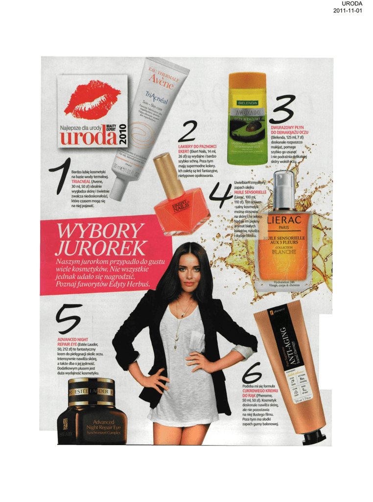 URODA 2011-11-01 1 " //, r, f e S °*Z',~ kn 'o,,. w AW OKA00 ':«' u maas Najlepsze dla urody • ara? Bardzo lubię kosmetyki na bazie wody termalnej. TRIACNEAL(Avene, 30 m1,50 zt) idealnie wygładza skórę i świetnie zwalcza niedoskonałości, które czasem mogą się na niej pojawić. nr?v WRAZIU O ""f« • DWUFAZOWY PŁYN DO DEMAKIJAŻU OCZU (Bielenda, 125 ml, 7 zt) doskonale rozpuszcza makijaż, pomaga \>, szybko go usunąć o i nie podrażnia delikaU} skóry wokół J LAKIERY DO PAZNOKCI EKERT(EkertNails,14ml, 26 zl) są wydajne i bardzo szybko schną. Poza tym mają supermodne kolory, kh zaletą są też fantazyjne, nietypowe opakowania. #8 &c UwielbianYzmystowy * zapach olejku I> HUILE SENSORIELLE *" ^^B/L? (IJerac, 100 ml, ^ ^ ^ \ y ^ - 110 zł). Ten uniwer- / W -salny kosmetyk n możną stosować " na skórę i na włosy Ą Nadaje im piękny 1 ,. : " ir, c aromat białych PARIS 0 kwiatów, nawilża $ ) a**} i dodaje blasku. JILE SENSORIELLE AUX 3 FLEURS U ER AC WYBORY JUROREK a ) Naszym jurorkom przypadło dog* wiele kosmetyków. Nie wszystkie jednak udało się nagrodzić. Poznaj faworytów Edyty Heri .. BLANCHE Hydratation 24h Visage, corps & cheveux ?v O. ADVANCED NIGHT REPAIR EYE (Estee Lauder, 50,212 zl) to fantastyczny krem do pielęgnacji okolic oczu. Intensywnie nawilża skórę, a także dba o jej jędrność. Dodatkowym plusem jest duża wydajność kosmetyku. ¥ *»: £000 \'!gggi /V K ,JI ii ed Niehl Repaii Eye Podoba mi się formuła CUKROWEGO KREMU DO RĄK (Phenome, 50 ml, 50 zł). Kosmetyk doskonale nawilża skórę, ale nie pozostawia na niej tłustego filmu. Poza tym ma słodki zapach gumy balonowej. w* *W^
