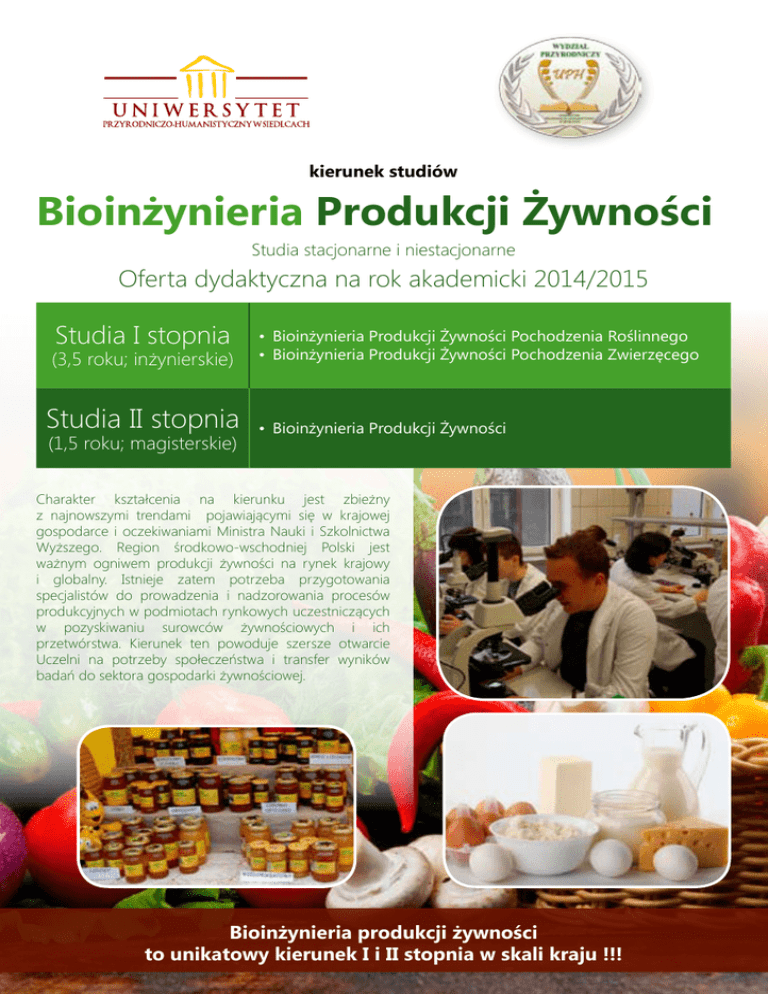 kierunek studiów Bioinżynieria Produkcji Żywności Studia stacjonarne i niestacjonarne Oferta dydaktyczna na rok akademicki 2014/2015 Studia I stopnia (3,5 roku; inżynierskie) Studia II stopnia (1,5 roku; magisterskie) • Bioinżynieria Produkcji Żywności Pochodzenia Roślinnego • Bioinżynieria Produkcji Żywności Pochodzenia Zwierzęcego • Bioinżynieria Produkcji Żywności Charakter kształcenia na kierunku jest zbieżny z najnowszymi trendami pojawiającymi się w krajowej gospodarce i oczekiwaniami Ministra Nauki i Szkolnictwa Wyższego. Region środkowo-wschodniej Polski jest ważnym ogniwem produkcji żywności na rynek krajowy i globalny. Istnieje zatem potrzeba przygotowania specjalistów do prowadzenia i nadzorowania procesów produkcyjnych w podmiotach rynkowych uczestniczących w pozyskiwaniu surowców żywnościowych i ich przetwórstwa. Kierunek ten powoduje szersze otwarcie Uczelni na potrzeby społeczeństwa i transfer wyników badań do sektora gospodarki żywnościowej. Bioinżynieria produkcji żywności to unikatowy kierunek I i II stopnia w skali kraju !!! Bioinżynieria Produkcji Żywności Absolwent zdobędzie wiedzę interdyscyplinarną z zakresu: • technik i technologii stosowanych w produkcji, przechowywaniu, standaryzacji i oceny surowców żywnościowych pochodzenia roślinnego i zwierzęcego, a także systemów kontroli ich jakości i bezpieczeństwa zdrowotnego, • podstaw przetwarzania surowców żywnościowych, organizacji produkcji włącznie z doborem maszyn i urządzeń, • funkcjonowania rynku produktów żywnościowych oraz zarządzania przedsiębiorstwami działającymi w różnych obszarach gospodarki żywnościowej. Absolwent zostanie przygotowany do pracy w: przedsiębiorstwach i gospodarstwach rolnych ukierunkowanych na produkcję surowców żywnościowych, przedsiębiorstwach przemysłu rolno-spożywczego, jednostkach zajmujących się obrotem i przetwórstwem surowców i produktów żywnościowych, firmach i instytucjach zajmujących się doskonaleniem procesów produkcji i przetwarzania żywności, w laboratoriach analitycznych, badawczych, firmach zajmujących się standaryzacją i certyfikacją żywności, jednostkach zajmujących się dystrybucją i obrotem żywności, w ośrodkach badawczo-rozwojowych, jednostkach administracji rządowej i samorządowej, w firmach doradczych i audytujących w łańcuchu żywnościowym. Zasady rekrutacji Rejestracja internetowa irk.uph.edu.pl Szczegółowe terminy rekrutacji na stronie internetowej wydziału www.wp.uph.edu.pl, tel. 25 643 1364, 25 643 1353 ul. Prusa 14, 08-110 Siedlce