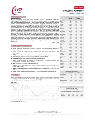 BIULETYN PORANNY czwartek, 4 sierpnia 2016 KOMENTARZ PORANNY Zadyszka byków Euforii wywołanej ostateczną wersją projektu ustawy o kredytach walutowych wystarczyło tylko aby we wtorek przetestować zeszłotygodniowe szczyty. Wczoraj zaś mieliśmy niewielkie cofnięcie i patrząc na miejsce w, którym się ono dokonało można oczekiwać kontynuacji tego osłabienia. Aktualnie najbliższym oporem są wtorkowe szczyty, które w przypadku indeksu WIG20 nakładają się na lipcowe maksima. Najbliższym wsparciem pozostają okolice 1750 pkt., gdzie zarówno na indeksie blue chips jak i w przypadku kontraktów znajduje się koniec dolnego cienia świeczki doji jaką możemy zaobserwować na WIG20. Ewentualne przełamanie tego poziomu otworzyłoby niedźwiedziom drogę do 1700 pkt., a nawet czerwcowego dołka. W perspektywie powrotu do wzrostów w nieco dłuższym terminie kluczowe powinny być okolice 1850 pkt. gdzie zbiega się kilka lokalnych szczytów z maja i z czerwca. Do jakichś większych ruchów indeksach może doprowadzić dzisiejsza decyzja BoE w sprawie stóp procentowych, którą poznamy o 13:00 czasu polskiego. Rynki oczekują obniżki o 25 pkt. bazowych, jednak poprzednio już się rozczarowały i wywołało to chwilowe turbulencje na rynkach. W kalendarzu makro znajdują się dziś jeszcze dane na temat amerykańskiego rynku pracy oraz zamówienia w tamtejszym przemyśle. Marek Jurzec Notowania: środa, 3 sierpnia 2016 Wartość Zmiana 1D YTD WIG20 1 790,1 -0,8% -3,7% WIG30 2 032,3 -0,7% -2,1% mWIG40 3 631,6 -0,4% 1,8% sWIG80 13 708,6 0,0% 3,8% WIG 46 762,2 -0,6% 0,6% WIG Banki 5 984,3 -0,3% -1,7% WIG Bud 2 686,5 0,0% -8,2% WIG Chemia 12 836,9 -2,7% -22,0% WIG Dew 1 629,6 -0,2% 7,7% WIG Energia 2 831,6 -1,7% -3,3% WIG IT 1 853,2 -0,8% 15,0% WIG Media 4 352,7 0,1% 10,4% WIG Paliwa 4 455,0 -1,0% -0,3% WIG Spoż 3 975,2 0,0% 16,2% WIG Surowce 2 598,4 -0,1% 32,8% 689,1 -0,9% -14,7% -5,3% WIG Telco DAX 10 170,2 0,3% CAC40 4 321,1 -0,2% -6,8% BUX 27 023,9 -0,5% 13,0% S&P500 2 163,8 0,3% 5,9% DJIA 18 355,0 0,2% 5,3% Pekao: Bank liczy, że w 2016 roku jego zysk netto będzie bliski zyskowi osiągniętemu w 2015 roku - prezes Nasdaq Comp 5 159,7 0,4% 3,0% Bovespa 57 076,9 1,6% 31,7% ING: Bank nie wyklucza, że może być wzmacniany poprzez akwizycje – prezes; Nikkei225 16 206,8 0,8% -14,9% Ronsos: Wyniki znacznie poniżej naszych oczekiwań [komentarz BDM]; S&P/ASX 200 5 483,3 0,3% 3,5% Złoto 1 357,5 -0,5% 27,8% Miedź 4 892,0 0,2% 4,0% Ropa 40,8 3,3% -3,7% SKRÓT INFORMACJI ZE SPÓŁEK Banki: Ewentualne zwiększenie wag ryzyka najszybciej odczują Getin Noble, Millennium i mBank – Parkiet; Asseco BS: Wyniki nieco powyżej konsensusu [komentarz BDM]; Ciech: Zarząd uspokaja, że dojście do porozumienia z rumuńskim dostawcą pary technologicznej jest kwestią czasu – Parkiet; EUR/PLN 4,30 -0,6% 0,8% Netia: EBITDA w 2Q’16 nieco powyżej konsensusu; USD/PLN 3,85 -0,2% -2,0% Emperia: Wzrost sprzedaży towarów LFL w sklepach własnych Stokrotki w lipcu 2016 roku wyniósł około 8,0% r/r; CHF/PLN 3,96 -0,9% 0,9% EUR/USD 1,12 -0,4% 2,8% Radpol: Spółka jest w trakcie rozmów z mBankiem; po 1H’16 spółka ma 6,0 mln PLN straty netto; USD/JPY 101,3 0,6% -15,7% FW20: środa, 4 sierpnia 2016 Bytom: Spółka wypracowała w lipcu blisko 12,4 mln PLN przychodów [komentarz BDM]; Wartość zmiana Kurs otwarcia 1 812 30 1,68% Kurs zamknięcia 1 800 -12 -0,66% Kurs amerykańskiego ubezpieczyciela wystrzelił wczoraj w górę o ponad 7%! Była to reakcja na Kurs min. wzrost zysku netto o ponad 6% r/r. Dodatkowo AIG zadeklarowało wprowadzenie skupu akcji Kurs max. własnych ()jego wartość ma sięgnąć maksymalnie 3 mld USD). Wolumen obrotu 1 791 9 0,51% 1 818 -12 -0,66% 11 815 -16 131 -57,72% Otwarte pozycje 64 360 1 868 2,99% WYKRES DNIA AIG - daily System: Aktualna pozycja – długa sygnał otwarcia krótkiej – 1789 Ostatnia zmiana sygnału z krótkiej na długą - 1778 Opory: 1826 1855 1876 1915 Wsparcia: 1722 1657 1600 1440 Źródło: BDM S.A., Bloomberg Wydział Analiz i Informacji Dom Maklerski BDM S.A. ul. 3-go Maja 23, 40-096 Katowice, Tel.: 032 208 14 12, [email protected] Opracowanie ma charakter czysto informacyjny i zostało opracowany na podstawie informacji uznanych przez autorów za wiarygodne . Zawarte w nim komentarze są subiektywnymi poglądami autorów. Opracowanie i zawarte w nim komentarze nie są podstawą żadnej rekomendacji kupna bądź sprzedaży w rozumieniu obowiązującego prawa i nie powinny być tak interpretowane. Publikowanie w prasie lub w Internecie całości lub części opracowania wymaga zgody sporządzających raport. BIULETYN PORANNY czwartek, 4 sierpnia 2016 GPW – PODSUMOWANIE Indeksy GPW FW20 (1,812.00, 1,818.00, 1,791.00, 1,800.00, -12.0000) 2000 1950 1900 Open Low High Close WIG20 1 806,6 1 787,7 1 810,1 1 790,1 -0,8% 572 WIG30 2 050,2 2 030,7 2 053,4 2 032,3 -0,7% 627 MWIG40 3 642,0 13 691,9 13 769,8 3 631,6 -0,4% 90 SWIG80 13 736,4 3 624,3 3 642,7 13 708,6 0,0% 32 WIG-PL 47 644,5 47 528,9 47 644,5 47 528,9 -0,6% 698 WIG 47 095,3 46 701,8 47 143,9 46 762,2 -0,6% 710 WIG20 Cena Mkt Cap Alior 1750 1700 1650 25 1 8 15 February 22 29 7 March 14 21 29 4 11 April 18 25 2 9 May 16 23 30 6 June 13 20 27 4 July 11 18 25 1 8 August 15 WIG20 (1,806.56, 1,810.12, 1,787.69, 1,790.09, -13.5400) 2000 1950 1900 1850 1800 1750 1700 1650 25 1 8 15 February 22 29 7 March 14 21 29 4 11 April 18 25 2 9 May 16 23 30 6 June 13 20 27 4 July 11 18 25 1 8 August 15 KOMENTARZ POPOŁUDNIOWY Brak kontynuacji Po wczorajszej udanej sesji na GPW i potencjalnie przełomowej (w pozytywnym sensie) informacji dla sektora bankowego dziś mogliśmy oczekiwać, że rynek będzie próbował ustabilizować się na zdobytym wczoraj pułapie w ramach budowania większego ruchu wzrostowego. Niestety, choć otwarcie wypadło w pobliżu wtorkowego zamknięcia, kolejne godziny sesji przyniosły zniżki zarówno wśród dużych spółek, jak i na szerokim rynku. Największym po