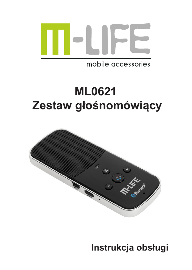 ML0621 Zestaw głośnomówiący Instrukcja obsługi Instrukcja obsługi Specyfikacja • Bluetooth: 3.0 + EDR • Obsługa multipoint (dwa telefony jednocześnie) • Łatwa procedura powiązania urządzeń • Zasięg do 10m • Automatyczne wyłączenie po 10 min braku połączenia z telefonem • Obsługa Voice dialing (komendy zapisane w telefonie) • Automatyczne ponowne parowanie z telefonem • Zaawansowana technologia redukcji dźwięków otoczenia • Wysokiej jakości głośnik • Przycisk wyciszenia mikrofonu podczas rozmowy • Zintegrowany najnowszy chip dla redukcji odgłosu min. otwartej szyby • Dioda sygnalizacyjna LED • Łatwe przełączanie między trybem rozmowy przez telefon i zestaw • Regulacja głośności • Czas słuchania muzyki: do 3 godzin • Czas rozmów: do 8 godzin • Czas czuwania: do 1000 godzin • Waga bez baterii: 45g Uwaga: Specyfikacja produktu może ulec zmianie bez powiadomienia. PL 2 Instrukcja obsługi Opis Głośnik Wskaźnik LED Wyciszenie Przycisk wielofunkcyjny Głośność + Gniazdo ładowania Przycisk zmiany trybu Głośność - Mikrofon Włączenie / wyłączenie urządzenia Aby włączyć urządzenie, należy nacisnąć i przytrzymać przycisk wielofunkcyjny przez około 3 sekundy (do momentu usłyszenia sygnału dźwiękowego). Aby wyłączyć urządzenie, należy ponownie nacisnąć i przytrzymać przycisk wielofunkcyjny przez około 3 sekundy. PL 3 Instrukcja obsługi Parowanie urządzeń 1. Należy umieścić oba urządzenia w odległości nie większej niż 1 metr od siebie. 2. Należy upewnić się, że zestaw głośnomówiący jest wyłączony. 3. Należy nacisnąć i przytrzymać przycisk wielofunkcyjny przez około 6 sekund (do momentu usłyszenia sygnału „Ready to pair”). W trybie parowania wskaźnik LED miga na przemian na kolor czerwony/niebieski. 4. Należy włączyć funkcję Bluetooth na telefonie i uruchomić wyszukiwanie nowych urządzeń (patrz instrukcja obsługi telefonu). 5. Z listy dostępnych urządzeń należy wybrać „BT Speaker”. 6. W razie potrzeby, należy podać kod „0000”. O poprawnym sparowaniu urządzeń informuje komunikat „Phone 1 connected” oraz niebieska dioda migająca co 3 sekundy. Niniejszym firma Lechpol oświadcza, że urządzenie ML0621 jest zgodne z zasadniczymi wymaganiami oraz innymi stosownymi postanowieniami dyrektywy 1999/5/WE. Właściwa deklaracja do pobrania na stronie www.lechpol.eu PL 4 www.m-life.pl