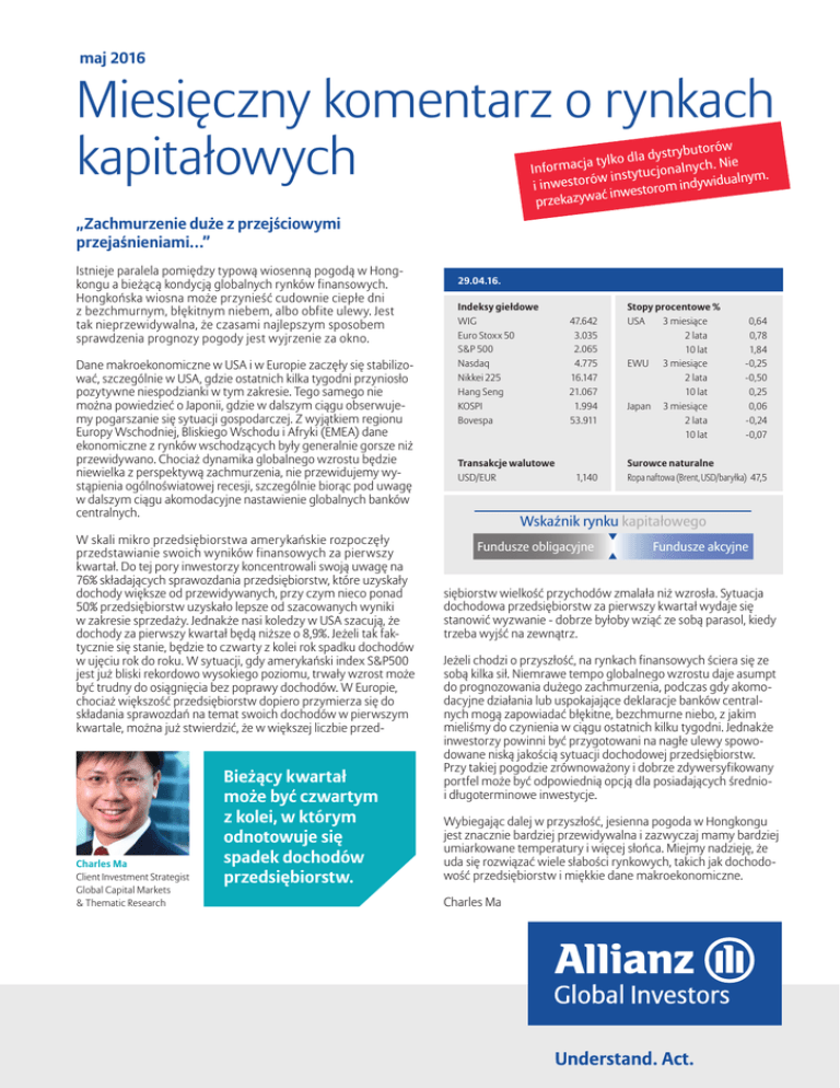 maj 2016 Miesięczny komentarz o rynkach kapitałowych w strybutoró lko dla dy ty ie ja N c . a h c lny Inform stytucjona in w lnym. ró u to id indyw a i inwes m ro o st e ać inw przekazyw „Zachmurzenie duże z przejściowymi przejaśnieniami…” Istnieje paralela pomiędzy typową wiosenną pogodą w Hongkongu a bieżącą kondycją globalnych rynków finansowych. Hongkońska wiosna może przynieść cudownie ciepłe dni z bezchmurnym, błękitnym niebem, albo obfite ulewy. Jest tak nieprzewidywalna, że czasami najlepszym sposobem sprawdzenia prognozy pogody jest wyjrzenie za okno. Dane makroekonomiczne w USA i w Europie zaczęły się stabilizować, szczególnie w USA, gdzie ostatnich kilka tygodni przyniosło pozytywne niespodzianki w tym zakresie. Tego samego nie można powiedzieć o Japonii, gdzie w dalszym ciągu obserwujemy pogarszanie się sytuacji gospodarczej. Z wyjątkiem regionu Europy Wschodniej, Bliskiego Wschodu i Afryki (EMEA) dane ekonomiczne z rynków wschodzących były generalnie gorsze niż przewidywano. Chociaż dynamika globalnego wzrostu będzie niewielka z perspektywą zachmurzenia, nie przewidujemy wystąpienia ogólnoświatowej recesji, szczególnie biorąc pod uwagę w dalszym ciągu akomodacyjne nastawienie globalnych banków centralnych. W skali mikro przedsiębiorstwa amerykańskie rozpoczęły przedstawianie swoich wyników finansowych za pierwszy kwartał. Do tej pory inwestorzy koncentrowali swoją uwagę na 76% składających sprawozdania przedsiębiorstw, które uzyskały dochody większe od przewidywanych, przy czym nieco ponad 50% przedsiębiorstw uzyskało lepsze od szacowanych wyniki w zakresie sprzedaży. Jednakże nasi koledzy w USA szacują, że dochody za pierwszy kwartał będą niższe o 8,9%. Jeżeli tak faktycznie się stanie, będzie to czwarty z kolei rok spadku dochodów w ujęciu rok do roku. W sytuacji, gdy amerykański index S&P500 jest już bliski rekordowo wysokiego poziomu, trwały wzrost może być trudny do osiągnięcia bez poprawy dochodów. W Europie, chociaż większość przedsiębiorstw dopiero przymierza się do składania sprawozdań na temat swoich dochodów w pierwszym kwartale, można już stwierdzić, że w większej liczbie przed- Charles Ma Client Investment Strategist Global Capital Markets & Thematic Research Bieżący kwartał może być czwartym z kolei, w którym odnotowuje się spadek dochodów przedsiębiorstw. 29.04.16. Indeksy giełdowe WIG47.642 Euro Stoxx 50 3.035 S&P 500 2.065 Nasdaq4.775 Nikkei 225 16.147 Hang Seng 21.067 KOSPI1.994 Bovespa53.911 Stopy procentowe % USA 3 miesiące 2 lata 10 lat EWU 3 miesiące 2 lata 10 lat Japan 3 miesiące 2 lata 10 lat Transakcje walutowe USD/EUR1,140 Surowce naturalne Ropa naftowa (Brent, USD/baryłka)47,5 0,64 0,78 1,84 -0,25 -0,50 0,25 0,06 -0,24 -0,07 Wskaźnik rynku kapitałowego Fundusze obligacyjne Fundusze akcyjne siębiorstw wielkość przychodów zmalała niż wzrosła. Sytuacja dochodowa przedsiębiorstw za pierwszy kwartał wydaje się stanowić wyzwanie - dobrze byłoby wziąć ze sobą parasol, kiedy trzeba wyjść na zewnątrz. Jeżeli chodzi o przyszłość, na rynkach finansowych ściera się ze sobą kilka sił. Niemrawe tempo globalnego wzrostu daje asumpt do prognozowania dużego zachmurzenia, podczas gdy akomodacyjne działania lub uspokajające deklaracje banków centralnych mogą zapowiadać błękitne, bezchmurne niebo, z jakim mieliśmy do czynienia w ciągu ostatnich kilku tygodni. Jednakże inwestorzy powinni być przygotowani na nagłe ulewy spowodowane niską jakością sytuacji dochodowej przedsiębiorstw. Przy takiej pogodzie zrównoważony i dobrze zdywersyfikowany portfel może być odpowiednią opcją dla posiadających średnioi długoterminowe inwestycje. Wybiegając dalej w przyszłość, jesienna pogoda w Hongkongu jest znacznie bardziej przewidywalna i zazwyczaj mamy bardziej umiarkowane temperatury i więcej słońca. Miejmy nadzieję, że uda się rozwiązać wiele słabości rynkowych, takich jak dochodowość przedsiębiorstw i miękkie dane makroekonomiczne. Charles Ma Allianz Global Investors GmbH: Podsumowanie rynku kapitałowego – maj 2016 Rynki szczegółowo Taktyczna alokacja akcji & obligacji skarbowych • Chociaż najważniejsze banki centralne przyjmują rozmaitą politykę, globalna polityka monetarna ma nadal charakter akomodacyjny. Globalny rozwój gospodarczy pozostaje w granicach swojego potencjału, chociaż jest wciąż stosunkowo anemiczny. Choć stopy inflacji kształtują się na niskim poziomie pod wpływem cen ropy naftowej, nie przewiduje się deflacji w długim okresie. • Przewiduje się zwiększenie niestabilności na rynkach. Raczej słaba sytuacja dochodowa, utrzymujące się wątpliwości co do perspektyw wzrostu na niektórych rynkach wschodzących, wydarzenia polityczne oraz wyceny w niektórych klasach aktywów mogą pogorszyć warunki dla ryzykownych aktywów. Sugeruje to bardziej defensywną alokację w krótkim terminie. • W sytuacji niskiego wzrostu i niskich zwrotów realnych dywidendy powinny w dalszym ciągu stanowić głównych czynnik ogólnych zysków z akcji. Akcje niemieckie • Dzięki wzrostowi zatrudnienia i poprawie wyprzedzających wskaźników ekonomicznych prognoza gospodarcza pozostaje pozytywna. Wydatki na cele konsumpcyjne okazują się dobrym źródłem wsparcia dla gospodarki, podczas gdy słaba sytuacja w gospodarce globalnej stanowi obciążenie dla efektywności eksportu. • Wyceny na niemieckim rynku akcji są nadal atrakcyjne i kształtują się poniżej swoich długookresowych średnich mierzonych korygowanym o wahania cykliczne wskaźnikiem cena/zysk (P/E Shillera). Akcje europejskie • Sytuacja gospodarcza w strefie euro ulega dalszej poprawie. Chociaż na początku roku 2016 wskaźniki nastrojów wskazywały na pewne przytłumienie, nie ma żadnych oznak, aby sytuacja w tym względzie miała ulec zmianie. Ekstremalnie poluzowana polityka monetarn