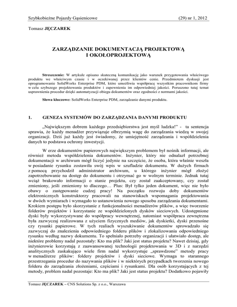 Szybkobieżne Pojazdy Gąsienicowe (29) nr 1, 2012 Tomasz JĘCZAREK ZARZĄDZANIE DOKUMENTACJĄ PROJEKTOWĄ I OKOŁOPROJEKTOWĄ Streszczenie: W artykule opisano skuteczną komunikację jako warunek przygotowania właściwego produktu we właściwym czasie i w oczekiwanej przez klientów cenie. Przedmiotem dyskusji jest oprogramowanie SolidWorks Enterprise PDM, które umożliwia współpracę wszystkim pracownikom firmy w celu szybszego projektowania produktów i zapewnienia im odpowiedniej jakości. Poruszono tutaj temat usprawnienia procedur dzięki automatyzacji obiegu dokumentów oraz zgodności z normami jakości. Słowa kluczowe: SolidWorks Enterprise PDM, zarządzanie danymi produktu. 1. GENEZA SYSTEMÓW DO ZARZĄDZANIA DANYMI PRODUKTU „Największym dobrem każdego przedsiębiorstwa jest myśl ludzka!” - ta sentencja sprawia, że każdy menadżer przywiązuje olbrzymią wagę do zarządzania wiedzą w swojej organizacji. Dziś już każdy jest świadomy, że umiejętność zarządzania i współdzielenia danych to podstawa ochrony inwestycji. W erze dokumentów papierowych największym problemem był nośnik informacji, ale również metoda współdzielenia dokumentów. Inżynier, który nie odnalazł potrzebnej dokumentacji w archiwum mógł liczyć jedynie na szczęście, że osoba, która właśnie weszła w posiadanie rysunku zostawiła swój wpis w szufladzie dokumentu. W dużych firmach z pomocą przychodził administrator archiwum, u którego inżynier mógł złożyć zapotrzebowanie na dostęp do dokumentu i otrzymać go w wolnym terminie. Jednak tutaj wciąż brakowało informacji o stanie projektu, czy został zaakceptowany, czy został zmieniony, jeśli zmieniony to dlaczego… Plus: Był tylko jeden dokument, więc nie było obawy o zastępowanie cudzej pracy! Na początku rozwoju doby dokumentów elektronicznych konstruktorzy pracowali na stanowiskach wspomagania projektowania w dwóch wymiarach i wymagało to ustanowienia nowego sposobu zarządzania dokumentami. Krokiem postępu było skorzystanie z funkcjonalności menadżerów plików, a więc tworzenie folderów projektów i korzystanie ze współdzielonych dysków sieciowych. Udostępnione dyski były wykorzystywane do współpracy wewnętrznej, natomiast współpraca zewnętrzna była zazwyczaj realizowana z użyciem fizycznych mediów, jak dyskietki, dyski przenośne czy rysunki papierowe. W tych realiach wyszukiwanie dokumentów sprowadzało się zazwyczaj do znalezienia odpowiedniego folderu plików i zlokalizowania odpowiedniego rysunku według nazwy dokumentu. To spełniało potrzeby organizacji i ułatwiało dostęp, ale niektóre problemy nadal pozostały: Kto ma plik? Jaki jest status projektu? Nawet dzisiaj, gdy inżynierowie korzystają z zaawansowanej technologii projektowania w 3D i z narzędzi analitycznych zaskakująco wiele firm nadal wykorzystuje „sprawdzone” metody pracy w menadżerze plików: foldery projektów i dyski sieciowe. Wymaga to starannego przestrzegania procedur do nazywania plików i w niektórych przypadkach tworzenia nowego folderu do zarządzania złożeniami, częściami i rysunkami. Dla osób korzystających z tej metody, problem nadal pozostaje: Kto ma plik? Jaki jest status projektu? Dodatkowo pojawiły Tomasz JĘCZAREK – CNS Solutions Sp. z o.o., Warszawa Tomasz JĘCZAREK się sytuacje z przypadkowo nadpisaną pracą wykonaną przez kogoś innego, z usunięciem pliku… A praca w systemach 3D CAD wymaga kolejnej uwagi: dbałość o kompletność złożenia podczas kopiowania czy przenoszenia plików, wpływ zmian pojedynczej części na projekty, w których występuje, zmiana nazwy pliku bez utraty referencji. Jeśli dodamy do tego stan, w którym zespół projektowy jest rozproszony geograficznie - liczba problemów z zarządzaniem wiedzą wzrasta. Niezależni analitycy z Business Standards Institute oraz CIMdata przedstawili fakty podsumowujące powyżej nakreśloną sytuację: 47% przypadków nieprzyznania przez ISO (Międzynarodową Organizację Normalizacyjną) certyfikatu dla zakładów i firm wynika ze złej kontroli nad dokumentacją; około 3-7% danych technicznych jest bezpowrotnie traconych każdego roku z powodu zagubienia dokumentacji inżynieryjnej; 20% czasu inżynierowie i technolodzy spędzają na szukaniu właściwej wersji dokumentacji produktu. Te fakty są genezą systemów do zarządzania danymi produktu (z ang.: product data magament – PDM), które coraz częściej stają się podstawowym składnikiem rozwiązań informatycznych w przedsiębiorstwach. Skuteczny system PDM spełnia nie tylko rolę, jaką w przeszłości odgrywały systemy zarządzania dokumentacją, ale stanowi również niesłychanie ważny kolejny krok w kierunku maksymalizacji korzyści płynących z automatyzacji CAD na poszczególnych etapach opracowywania produktu i w całym przedsiębiorstwie. 2. MOŻLIWOŚCI SYSTEMU SOLIDWORKS ENTERPRISE PDM Potrzeba stosowania prostego, bezpiecznego rozwiązania PDM do zarządzania różnorodnymi danymi trójwymiarowych projektów w grupie roboczej lub w całym przedsiębiorstwie jest oczywista, jednakże wielu producentom nie udawało się znaleźć właściwego rozwiązania PDM do czasu wprowadzenia oprogramowania SolidWorks Enterprise PDM (rys.1.) od SolidWorks Corporation. Rys.1. SolidWorks Enterprise PDM – zarządzanie danymi projektu Zarządzanie dokumentacją projektową i okołoprojektową SolidWorks Enterprise PDM jest pierwszym i jedynym komercyjnym systemem PDM całkowicie zintegrowanym z aplikacją Windows Explorer. Projektanci, inżynierowie i inni specjaliści wiedzą, jak uzyskać dostęp do plików i zarządzać nimi przy użyciu aplikacji Windows Explorer na swoich komputerach, dlatego też oprogramowanie SolidWorks Enterprise PDM zostało zaprojektowane tak, by wykorzystać tę wiedzę. Użytkownicy wykorzystują wszystkie funkcje oprogramowania PDM SolidWorks Enterprise za pośrednictwem aplikacji Windows Explore