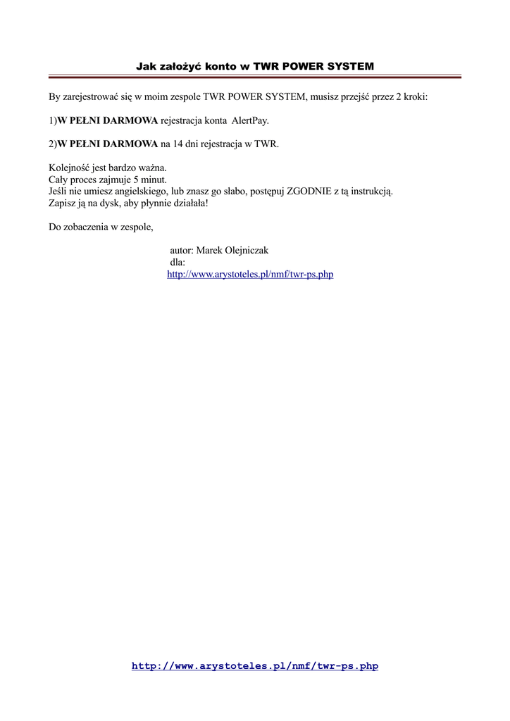 Jak założyć konto w TWR POWER SYSTEM By zarejestrować się w moim zespole TWR POWER SYSTEM, musisz przejść przez 2 kroki: 1)W PEŁNI DARMOWA rejestracja konta AlertPay. 2)W PEŁNI DARMOWA na 14 dni rejestracja w TWR. Kolejność jest bardzo ważna. Cały proces zajmuje 5 minut. Jeśli nie umiesz angielskiego, lub znasz go słabo, postępuj ZGODNIE z tą instrukcją. Zapisz ją na dysk, aby płynnie działała! Do zobaczenia w zespole, autor: Marek Olejniczak dla: http://www.arystoteles.pl/nmf/twr-ps.php http://www.arystoteles.pl/nmf/twr-ps.php Jak założyć konto w TWR POWER SYSTEM Część 1. Darmowa Rejestracja konta w Banku AlertPay. Wejdź na stronę główną AlertPay. W tym celu kliknij w ten link : AlertPay Miło mi będzie, jeśli skorzystasz właśnie z tego linku, gdyż dzięki temu ten system płatności daje mi dodatkowe korzyści, za polecanie go znajomym (tez będziesz mógł w przyszłości z nich korzystać). Po mojej akcji, jeśli zdecydujesz się dalej promować TWR, a gwarantuję ci, że będziesz chciał (np. tworząc drugie konto), też będziesz mógł otrzymywać od tego Banku dodatkowe korzyści. Jeśli nie skorzystasz z tego linku, wszystkie prowizje za przelewy dostaje Bank. A jeśli skorzystasz, to się ze mną podzieli. Jeśli wejdziesz przez link, to przy wpłatach powyżej 250 dolarów, polecająca osoba dostaje 5 dolarów z PROWIZJI JAKĄ MA BANK ( Bank i tak pobiera opłaty za przelewy). Jestem przekonany, że Taką prowizję dostaniesz już w najbliższym czasie. Skorzystaj zatem proszę z tego linku: Alertpay Najprawdopodobniej wyskoczy blokada Programu acrobat reader, kliknij więc przycisk „ALLOW”, czyli pozwól. Inną możliwością jest skopiowanie linku http://www.arystoteles.pl/nmf/alertpay-go.php do przeglądarki Internetowej. Wyskakuje nam strona: Klikamy na zielony przycisk, po prawej stronie: http://www.arystoteles.pl/nmf/twr-ps.php Jak założyć konto w TWR POWER SYSTEM Rodzaj Konta: W zależności od wyboru konta, takie Bank będzie pobierał prowizję. Konto personal STARTER, umożliwia wpłaty w wysokości do 400 dolarów miesięcznie, do 2000 dolarów rocznie. Konto personal PRO, nie ma ograniczeń, za to płacimy prowizję Bankowi (2,5% od każdej wpłaty). Docelowo i tak będziesz musiał korzystać z Personal Pro, jednak na początek możesz wybrać opcję Personal Starter, by bank pobierał mniejsze opłaty i jak tylko zajdzie potrzeba, można w każdej chwili zmienić Typ Konta w panelu. Oczywiście za darmo. Następnie klikamy przycisk „NEXT” w prawym dolnym rogu. Wypełnij teraz podany formularz swoimi danymi. Pamiętaj by pisać BEZ polskich znaków! Telefon podaj z kierunkowym do Polski: 0048…. Pełny opis masz na załączonym obrazku. http://www.arystoteles.pl/nmf/twr-ps.php Jak założyć konto w TWR POWER SYSTEM Jeśli chodzi o zawód, oto tłumaczenie: Accounting/finance - Księgowość i finance Computer related (Internet) - Związane z Internetem Computer related (other) - Związane z komputerem Consulting - Doradztwo Customer service/support – Obsługa klienta Education/training - Edukacja / Szkolenia Engineering - Inżynieria Executive/senior management - Kadra zarządzająca General administrative/supervisory - Administracja Government/military - Rząd/Wojsko IS/IT management - Zarządzanie technologiami Manufacturing/production/operations - Produkcja Professional (medical, legal, etc.) - Zdrowie Research and development - Badania i rozwój Retired – Jestem na emeryturze Sales/marketing/advertising - Sprzedaż / marketing / reklama Self-employed/owner – własna działalność Student - Uczeń / Student Unemployed/between jobs - Bezrobotny / zmieniający pracę Homemaker - Gospodyni domowa Tradesman/craftsman - Handlowiec / rzemieślnik Other - Inna Następnie klikamy NEXT, w prawym dolnym rogu ekranu. Bardzo ważny w tym kroku, jest Twój Pin potwierdzający, który jest wymagany, przy każdej http://www.arystoteles.pl/nmf/twr-ps.php Jak założyć konto w TWR POWER SYSTEM transakcji. Ustalasz go właśnie w tym kroku. Następnie klikamy przycisk REGISTER, znajdujący się w prawym dolnym rogu. Po kliknięciu REGISTER, jeśli nie ma błędów, AlertPay wysyła link aktywacyjny, na adres e-mail, jaki podałeś. Odwiedź Teraz swoją skrzynkę e-mail, odbierz wiadomość od AlertPay i kliknij w link aktywacyjny, w celu dokończenia rejestracji Twojego konta AlertPay. http://www.arystoteles.pl/nmf/twr-ps.php Jak założyć konto w TWR POWER SYSTEM Po kliknięciu w link, wyskakuje nam okienko. Musimy się zalogować, a następnie kliknąć LOG IN. TO WSZYSTKO. Czas zarejestrować się ZA DARMO NA 14 dni w TWR POWER SYSTEM. Część 2. Rejestracja konta w TWR POWER SYSTEM. Kiedy masz już założone konto w AlertPay, czas na założenie konta w systemie TWR POWER SYSTEM. Kliknij w mój link referencyjny: http://www.twrpowersystem.com/aff/uid/passiveinc_1 Jeżeli Acrobat Reader będzie miał jakieś problemy, likamy „ALLOW”. Zostaniesz przekierowany na stronę w języku angielskim. A następnie kliknij w czerwoną ikonkę: JOIN NOW WITH A 14 DAYS TRIAL. Wyskakuje nam okienko, w które wpisujemy nasze dane, zgodnie z instrukcją. http://www.arystoteles.pl/nmf/twr-ps.php Jak założyć konto w TWR POWER SYSTEM ZWRÓĆ BACZNĄ UWAGĘ, CZY NA GÓRZE JEST INFORMACJA: REFERRED BY passiveinc (albo jeżeli podam Ci inny link, np. kogoś pode mną, to napis zmieni się odpowiednio do tego linku – na grze strony musi być to co na końcu linku, bez podkreślenia i jedynki na końcu). Jeśli będzie inna nazwa użytkownika, zamknij tę stronę przeglądarki i użyj tego linku http://www.arystoteles.pl/nmf/twr-ps.php Jak założyć konto w TWR POWER SYSTEM http://www.twrpowersystem.com/aff/uid/passiveinc_1 raz jeszcze. Inaczej trafisz do przypadkowego zespołu!!! W tym modelu struktury zawsze ktoś pod kimś być musi... Ważne jest też, by podać adres E-Mail, z konta Alert-PAY. Następnie klikamy przycisk Z