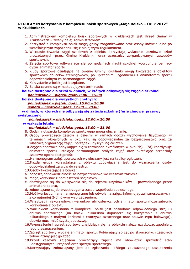 REGULAMIN korzystania z kompleksu boisk sportowych „Moje Boisko – Orlik 2012” w Kruklankach 1. Administratorem kompleksu boisk sportowych w Kruklankach jest Urząd Gminy w Kruklankach – zwany dalej Administratorem. 2. Korzystać z kompleksu boisk mogą grupy zorganizowane oraz osoby indywidualne po wcześniejszym zapoznaniu się z niniejszym regulaminem. 3. W czasie trwania zajęć szkolnych z obiektu korzystają wyłącznie uczniowie szkół prowadzonych przez Gminę Kruklanki, oraz uczestnicy zorganizowanych zawodów sportowych. 4. Zajęcia sportowe odbywające się po godzinach nauki szkolnej koordynuje pełniący dyżur animator sportu. 5. Kluby sportowe działające na terenie Gminy Kruklanki mogą korzystać z obiektów sportowych do celów treningowych, po uprzednim uzgodnieniu z animatorem sportu odpowiedzialnym za harmonogram zajęć. 6. Korzystanie z boisk jest bezpłatne. 7. Boiska czynne są w następujących terminach: boiska dostępne dla szkół w dniach, w których odbywają się zajęcia szkolne: poniedziałek – piątek: godz. 8.00 – 15.00 boiska dostępne dla wszystkich chętnych: poniedziałek – piątek: godz. 15.00 – 20.00 sobota – niedziela: godz. 12.00 – 20.00 w dniach, w których nie odbywają się zajęcia szkolne (ferie zimowe, przerwy świąteczne): poniedziałek – niedziela: godz. 12.00 – 20.00 w wakacje letnie: poniedziałek – niedziela: godz. 13.00 – 21.00 8. Godziny otwarcia kompleksu sportowego mogą ulec zmianie. 9. Osoby prowadzące zajęcia z dziećmi w ramach godzin wychowania fizycznego, w terminach określonych w pkt. 7a), są odpowiedzialne za bezpieczeństwo oraz za właściwą organizację zajęć, porządek i dyscyplinę ćwiczeń. 10.Zajęcia sportowe odbywające się w terminach określonych w pkt. 7b) – 7d) koordynuje animator sportu ustalając harmonogram stałych zajęć oraz określając przedziały czasowe ogólnodostępności. 11.Harmonogram zajęć sportowych wywieszany jest na tablicy ogłoszeń. 12.Każda grupa korzystająca z obiektu zobowiązana jest do wyznaczenia osoby odpowiedzialnej za wpis do rejestru. 13.Osoby korzystające z boiska: a. ponoszą odpowiedzialność za bezpieczeństwo we własnym zakresie, b. mogą korzystać z pomieszczeń socjalnych, c. obowiązane są do wpisywania się do rejestru użytkowników – prowadzonego przez animatora sportu, d. zobowiązane są do przestrzegania zasad współżycia społecznego. 13.Możliwa jest zmiana harmonogramu lub odwołania zajęć, informując zainteresowanych z co najmniej 2-dniowym wyprzedzeniem. 14.W sytuacji niekorzystnych warunków atmosferycznych animator sportu może zabronić korzystania z obiektu. 15.Warunkiem korzystania z kompleksu boisk jest posiadanie odpowiedniego stroju i obuwia sportowego (na boisku piłkarskim dopuszcza się korzystanie z obuwia piłkarskiego z małymi korkami z tworzywa sztucznego oraz obuwie typu halowego), obuwie musi mieć czystą podeszwę. 16.Wyposażenie i sprzęt sportowy znajdujący się na obiekcie należy użytkować zgodnie z jego przeznaczeniem. 17.Sprzęt sportowy wydaje animator sportu. Pobierający sprzęt po skończonych zajęciach zobowiązany jest go zdać. 18.Przed każdymi zajęciami prowadzący zajęcia ma obowiązek sprawdzić stan udostępnionych urządzeń oraz sprzętu sportowego. 19.Korzystający zobowiązany jest do zgłaszania każdego zauważonego uszkodzenia urządzeń lub sprzętu sportowego animatorowi sportu. 20.W celu zapewnienia bezpieczeństwa użytkownikom, oraz korzystania z boisk zgodnie z ich przeznaczeniem zabrania się: a. używania butów piłkarskich na wysokich i metalowych korkach oraz kolców; b. wprowadzania i użytkowania sprzętu innego niż zgodnego z przeznaczeniem boisk, np. rower, motorower, deskorolka, rolki itp.; c. niszczenia urządzeń sportowych i płyty boiska; d. wchodzenia na ogrodzenie i urządzenia sportowe; e. palenia tytoniu, spożywania alkoholu, żucia gumy; f. zaśmiecania, wnoszenia opakowań szklanych i metalowych; g. przeszkadzania w zajęciach lub grze; h. zakłócania porządku i używania słów wulgarnych; i. wprowadzania zwierząt; j. korzystania z boisk bez zgody animatora sportu; k. przebywania i korzystania z obiektów poza godzinami otwarcia. 22.Wiążące rozstrzygnięcia dotyczące sposobu korzystania z boisk podejmuje animator sportu, który w zależności od sytuacji może: a. nakazać zmianę obuwia sportowego i stroju; b. zwrócić uwagę na niewłaściwe, niezgodne z regulaminem zachowanie; c. nakazać opuszczenie terenu boisk; d. zakazać dalszych wstępów na kompleks. 23.Administrator kompleksu nie ponosi odpowiedzialności za wypadki powstałe w trakcie korzystania z obiektu. 24.Użytkownicy korzystają z boisk na własną odpowiedzialność i odpowiadają materialnie za wyrządzone szkody na zasadach określonych w odrębnych przepisach. 25.Prowadzący zajęcia jest zobowiązany powiadomić administratora o każdym zaistniałym wypadku. 26.Osoby do 12-go roku życia mogą korzystać z kompleksu boisk jedynie w obecności i pod nadzorem osób dorosłych (rodzic, instruktor, trener, nauczyciel). Opiekun opuszcza obiekt ostatni po wyjściu całej grupy, za którą jest odpowiedzialny. 27.Korzystający z obiektu są zobowiązani do bezwzględnego przestrzegania regulaminu, przepisów ppoż. i bhp, a w szczególności uwag animatora sportu. 28.Za rzeczy pozostawione w szatni i na boiskach administrator obiektu nie ponosi odpowiedzialności. 29.Ustala się dni, w których kompleks „Orlik 2012” będzie nieczynny: a. 1 listopada; b. Wigilia; c. Pierwszy dzień Świąt Bożego Narodzenia; d. Nowy Rok e. Pierwszy dzień Świąt Wielkanocnych; f. Inne dni zarządzone przez administratora obiektu. 23.Niezastosowanie się do niniejszego regulaminu rozpatrywane będzie w drodze postępowania karno-administracyjnego, a w szczególnych przypadkach w drodze postępowania karnego.