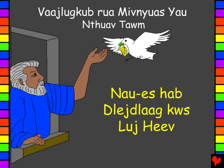 Vaajlugkub rua Mivnyuas Yau Nthuav Tawm Nau-es hab Dlejdlaag kws Luj Heev Tug Sau yog: Edward Hughes Tug Kus Dluab yog: Byron Unger; Lazarus Tug Hloov yog: M. Maillot; Tammy S. Tug Txhais yog: Andy Yang Tug Tsim yog: Bible for Children www.M1914.org ©2013 Bible for Children, Inc. Ntawv Tso Cai: Koj muaj cai muab zaaj nuav kaij lossis luam, tsuav yog koj tsi xob muab muag xwb. Nau-es yog ib tug kws pehawm Vaajtswv. Lwmleej lwmtug puavleej ntxub hab tsi noog Vaajtswv lug. Muaj ib nub, Vaajtswv has ib yaam kws txaus ntshai heev. “Kuv yuav rhuav lub nplajteb kws phemqas nuav kuas puamtsuaj moog,” Vaajtswv has rua Nau-es. “Tsuas yog koj tsev tuabneeg xwb txhaj le yuav dlim.” Vaajtswv ceebtoom rua Nau-es has tas yuav muaj dlejdlaag luj heev lug nyaab lub nplajteb. “Txua ib lub nkoj ntoo, ib lub nkoj kuam luj txaus koj tsev tuabneeg hab ntau ntau tug tsaj,” Nau-es raug saamfwm. Vaajtswv qha txhij txhua has tas yuav ua le caag rua Nau-es. Nau-es rau sab ntso ua! Tejzag tuabneeg yuav luag Nau-es thaum nwg qha puab has tas vim le caag nwg txhaj le txua nkoj. Nau-es rau sab ntso txua. Nwg xijpheej qha tuabneeg txug Vaajtswv hab. Tsi muaj leejtwg noog le. Nau-es muaj kev ntseeg luj heev. Nwg ntseeg Vaajtswv txawm has tas naag tsi tau lug dlua ib zag le. Tsi ntev tomqaab, lub nkoj npaaj txhij kws yuav ntim khoom rua huv lawm. Zag nuav coj tej tsaj lug. Tej hom tsaj Vaajtswv coj xyaa khub, hab lwm hom tsaj ob khub. Noog luj noog miv, tsaj sab tsaj nqeg taug kev rua huv lub nkoj. Tejzag tuabneeg yuav tshev lug saib tsi taug rua Nau-es thaum nwg muab tej tsaj ntim rua huv. Puab yeej tsi tso tseg puab txuj kev ua txhum tawmtsaam Vaajtswv le. Puab yeej tsi thov moog nkaag rua huv lub nkoj. Thaum xaus, taagnrho tej tsaj hab noog muab ntim taag lawm. “Nkaag lug rua huv lub nkoj,” Vaajtswv caw Nau-es. “Koj hab koj tsev tuabneeg.” Nau-es, nwg puaspuj, nwg peb tug tub hab puab cov quaspuj nkaag rua huv lub nkoj. Ces Vaajtswv kaw lub qhovrooj! Ces naag txawm lug. Ib nthwv naag hlub hlub lug nyaab lub nplajteb tau plaubcaug nub plaubcaug mo. Dlejdlaag nyaab tej nroog hab tej zog. Thaum naag tu, tej roobsab los dlej nyaab huvsi. Txhua yaam kws ua paa tuag huvsi. Thaum cov dlej fuam, lub nkoj ntaab sau nplaimdlej. Tejzag huv plawv nkoj yuav tsaus, tejzag yuav ndlaas, hab tejzag yuav txaus ntshai hab. Tabsis lub nkoj tivthaiv Nau-es dlhau cov dlejdlaag. Tsib lub hlis tomqaab dlejdlaag nyaab, Vaajtswv tso ib nthwv cua lug ntsawj. Lub nkoj maav maav lug nreg rua sau ib lub roobsab hu ua Alalaj. Nau-es nyob huv nkoj tau plaubcaug nub ntxiv kuam cov dlej nqeg. Nau-es tso ib tug uab-laag hab ib tug nquab tawm huv lub qhovrais moog. Tug nquab nrhav tsi tau chaw qhuav tsaws hab rov lug rua Nau-es. Ib lub limtam tomqaab, Nau-es rov ua dlua. Tug nquab kwv ib rev nplooj txiv ntoo roj mog mog ntawm nwg tug kawg ncauj rov lug. Lub limtam tomqaab Nau-es paub has tas lub nplajteb qhuav lawm vim tug nquab tsi rov lug lawm. Vaajtswv qha rua Nau-es tas txug caij tawm huv lub nkoj lawm. Nau-es hab nwg tsev tuabneeg koomteg muab tej tsaj tso tawm. Ntshai Nau-es yuav uatsaug heev le! Nwg teeb ib lub thaaj hab pehawm Tug kws cawm nwg Vaajtswv hab nwg tsev tuabneeg dlim ntawm cov nam dlejdlaag kws qasntsuav. Vaajtswv cog ib yaam lug zoo heev rua Nau-es. Nwg yuav tsi tso dlejdlaag lug rau txim rua tuabneeg tej kev txhum ib zag ntxiv le lawm. Vaajtswv tsim ib yaam zoo heev lug ua chaw ncu txug Nwg txuj kev coglug. Tug dluab zaaj yog lub cim rua Vaajtswv txuj kev coglug. Nau-es hab nwg tsev tuabneeg muaj chaw chivtshab tomqaab dlejdlaag. Tomqaab nuav, nwg cov xeebntxwv fuamvaam puv nplajteb. Txhua haiv tuabneeg huv qaabntuj nuav yog fuamvaam ntawm Nau-es hab nwg cov mivnyuas lug. Nau-es hab Dlejdlaag kws Luj Heev Ib zaaj huv Vaajtswv Txujlug, phoo Vaajlugkub, yog nyob rua huv Chivkeeb 6-10 “Lub chaw rua Koj cov Lug nkaag kws muaj teeb ci.” Ntawv Nkauj 119:130 Qhov Xaus Zaaj Vaajlugkub nuv qha peb txug peb tug Vaajtswv zoo kawg nkaus kws tsim peb hab Nwg xaav kuam koj paub Nwg. Vaajtswv paub has tas peb tau ua ntau yaam phem, kws Nwg hu ua kev txhum. Txuj kev rau txim rua kev txhum yog kev tuag, tabsis Vaajtswv hlub koj kawg le kws Nwg xaa Nwg tuableeg Tub, Yexus, lug tuag sau ib tug Ntoo Khaublig hab raug rau txim hloov koj txuj kev txhum. Tomqaab ntawd Yexus sawv rov lug muaj sa hab rov moog nyob nwg lub tsev sau Ntuj Ceebtsheej! Yog koj ntseeg Yexus hab thov kuam Nwg zaam koj tej kev txhum, Nwg yuav ua le ntawd! Nwg yuav lug nyob huv koj taamsim nuav, hab koj yuav nrug Nwg nyob moog le ib txhis. Yog koj ntseeg has tas nuav yog qhov tseeb, ha le nuav rua Vaajtswv: Aub Yexus, kuv ntseeg has tas Koj yog Vaajtswv, hab lug yug ua ib tug tuabneeg lug tuag hloov kuv tej kev txhum, hab nwgnuav Koj tseem muaj sa nyob. Thov Koj lug nyob huv kuv lub neej hab zaam kuv tej kev txhum, sub kuv txhaj le muaj txujsa tshab taamsim nuav, hab ib nub moog nrug Koj nyob moog ib txhis. Thov paab kuam kuv noog Koj lug hab ua neej rua Koj le Koj tug mivnyuas. Amees. Nyeem phoo Vaajlugkub hab nrug Vaajtswv sibthaam txhua nub! Yuhaas 3:16