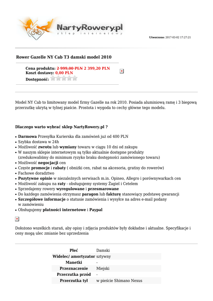 Utworzono: 2017-03-02 17:27:21 Rower Gazelle NY Cab T3 damski model 2010 Cena produktu: 2 999,00 PLN 2 399,20 PLN Koszt dostawy: 0,00 PLN Dostępność: Model NY Cab to limitowany model firmy Gazelle na rok 2010. Posiada aluminiową ramę i 3 biegową przerzutkę ukrytą w tylnej piaście. Prostota i wygoda to cechy główne tego modelu. Dlaczego warto wybrać sklep NartyRowery.pl ? ● ● ● ● ● ● ● ● ● ● ● ● ● Darmowa Przesyłka Kurierska dla zamówień już od 400 PLN Szybka dostawa w 24h Możliwość zwrotu lub wymiany towaru w ciągu 10 dni od zakupu W naszym sklepie internetowym są tylko aktualnie dostępne produkty (zredukowaliśmy do minimum ryzyko braku dostępności zamówionego towaru) Możliwość negocjacji cen Częste promocje i rabaty ( obniżki cen, rabat na akcesoria, gratisy do rowerów) Fachowe doradztwo Pozytywne opinie w niezależnych serwisach m.in. Opineo, Allegro i porównywarkach cen Możliwość zakupu na raty - obsługujemy systemy Żagiel i Cetelem Sprzedajemy rowery wyregulowane i przesmarowane Do każdego zamówienia otrzymasz paragon lub fakturę stanowiący podstawę gwarancji Szczegółowe informacje o statusie zamówienia i wysyłce na adres e-mail podany w zamówieniu Obsługujemy płatności internetowe i Paypal Dołożono wszelkich starań, aby opisy i zdjęcia produktów były dokładne i aktualne. Specyfikacje i ceny mogą ulec zmianie bez uprzedzenia Płeć Damski Widelec/ amortyzator sztywny Manetki Przeznaczenie Przerzutka przód Przerzutka tył Miejski w pieście Shimano Nexus Kaseta/ wolnobieg - Korbowód - Pedały - Hamulce Gazelle - Rolkowy Piasta przód - Piasta tył - Obręcze RODI - stożkowe Szprychy DT Swiss - stal nierdzewna (przód 2mm; tył - 2,35mm) Kolekcja 2010 Opony Schwalbe Fat Frank - z powłoką antyprzebiciową i bocznymi paskami odblaskowymi Stery - Mostek - Kierownica - Chwyty - Siodło - Sztyca - Waga 17 kg Rama Aluminium 7005 Hamulce Inne Damper - Pegi - Ilość biegów 3 Adres: http://nartyrowery.pl/ Telefon: 34 365 66 09, 793 61 04 29 Email: [email protected] Gadu-Gadu: Skype: