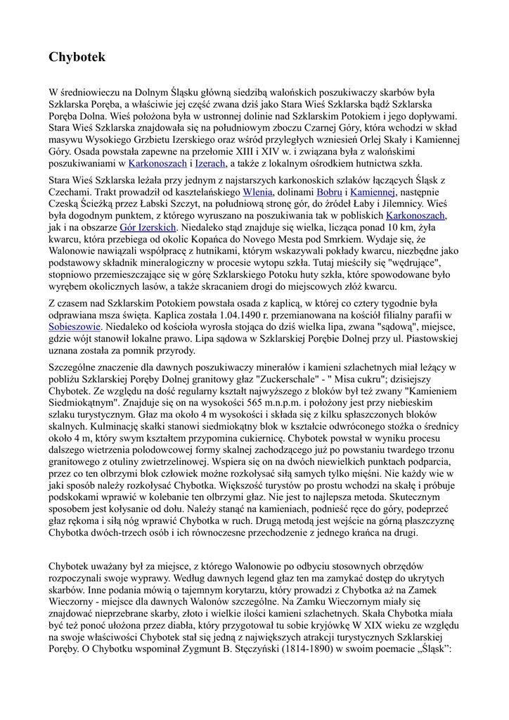 Chybotek W średniowieczu na Dolnym Śląsku główną siedzibą walońskich poszukiwaczy skarbów była Szklarska Poręba, a właściwie jej część zwana dziś jako Stara Wieś Szklarska bądź Szklarska Poręba Dolna. Wieś położona była w ustronnej dolinie nad Szklarskim Potokiem i jego dopływami. Stara Wieś Szklarska znajdowała się na południowym zboczu Czarnej Góry, która wchodzi w skład masywu Wysokiego Grzbietu Izerskiego oraz wśród przyległych wzniesień Orlej Skały i Kamiennej Góry. Osada powstała zapewne na przełomie XIII i XIV w. i związana była z walońskimi poszukiwaniami w Karkonoszach i Izerach, a także z lokalnym ośrodkiem hutnictwa szkła. Stara Wieś Szklarska leżała przy jednym z najstarszych karkonoskich szlaków łączących Śląsk z Czechami. Trakt prowadził od kasztelańskiego Wlenia, dolinami Bobru i Kamiennej, następnie Czeską Ścieżką przez Łabski Szczyt, na południową stronę gór, do źródeł Łaby i Jilemnicy. Wieś była dogodnym punktem, z którego wyruszano na poszukiwania tak w pobliskich Karkonoszach, jak i na obszarze Gór Izerskich. Niedaleko stąd znajduje się wielka, licząca ponad 10 km, żyła kwarcu, która przebiega od okolic Kopańca do Novego Mesta pod Smrkiem. Wydaje się, że Walonowie nawiązali współpracę z hutnikami, którym wskazywali pokłady kwarcu, niezbędne jako podstawowy składnik mineralogiczny w procesie wytopu szkła. Tutaj mieściły się "wędrujące", stopniowo przemieszczające się w górę Szklarskiego Potoku huty szkła, które spowodowane było wyrębem okolicznych lasów, a także skracaniem drogi do miejscowych złóż kwarcu. Z czasem nad Szklarskim Potokiem powstała osada z kaplicą, w której co cztery tygodnie była odprawiana msza święta. Kaplica została 1.04.1490 r. przemianowana na kościół filialny parafii w Sobieszowie. Niedaleko od kościoła wyrosła stojąca do dziś wielka lipa, zwana "sądową", miejsce, gdzie wójt stanowił lokalne prawo. Lipa sądowa w Szklarskiej Porębie Dolnej przy ul. Piastowskiej uznana została za pomnik przyrody. Szczególne znaczenie dla dawnych poszukiwaczy minerałów i kamieni szlachetnych miał leżący w pobliżu Szklarskiej Poręby Dolnej granitowy głaz "Zuckerschale" - " Misa cukru"; dzisiejszy Chybotek. Ze względu na dość regularny kształt najwyższego z bloków był też zwany "Kamieniem Siedmiokątnym". Znajduje się on na wysokości 565 m.n.p.m. i położony jest przy niebieskim szlaku turystycznym. Głaz ma około 4 m wysokości i składa się z kilku spłaszczonych bloków skalnych. Kulminację skałki stanowi siedmiokątny blok w kształcie odwróconego stożka o średnicy około 4 m, który swym kształtem przypomina cukiernicę. Chybotek powstał w wyniku procesu dalszego wietrzenia polodowcowej formy skalnej zachodzącego już po powstaniu twardego trzonu granitowego z otuliny zwietrzelinowej. Wspiera się on na dwóch niewielkich punktach podparcia, przez co ten olbrzymi blok człowiek możne rozkołysać siłą samych tylko mięśni. Nie każdy wie w jaki sposób należy rozkołysać Chybotka. Większość turystów po prostu wchodzi na skałę i próbuje podskokami wprawić w kolebanie ten olbrzymi głaz. Nie jest to najlepsza metoda. Skutecznym sposobem jest kołysanie od dołu. Należy stanąć na kamieniach, podnieść ręce do góry, podeprzeć głaz rękoma i siłą nóg wprawić Chybotka w ruch. Drugą metodą jest wejście na górną płaszczyznę Chybotka dwóch-trzech osób i ich równoczesne przechodzenie z jednego krańca na drugi. Chybotek uważany był za miejsce, z którego Walonowie po odbyciu stosownych obrzędów rozpoczynali swoje wyprawy. Według dawnych legend głaz ten ma zamykać dostęp do ukrytych skarbów. Inne podania mówią o tajemnym korytarzu, który prowadzi z Chybotka aż na Zamek Wieczorny - miejsce dla dawnych Walonów szczególne. Na Zamku Wieczornym miały się znajdować nieprzebrane skarby, złoto i wielkie ilości kamieni szlachetnych. Skała Chybotka miała być też ponoć ułożona przez diabła, który przygotował tu sobie kryjówkę W XIX wieku ze względu na swoje właściwości Chybotek stał się jedną z największych atrakcji turystycznych Szklarskiej Poręby. O Chybotku wspominał Zygmunt B. Stęczyński (1814-1890) w swoim poemacie „Śląsk”: "Ale nad wszystkie owe kamienie i skały Kamień ogromny Miską Cukru nazywany, Co swoją równowagą jest utrzymywany, Jak gdyby sobie powstał czarodziejską sztuką, Że go burze nie zwalą, pioruny nie stłuką." Pod koniec XIX w. Chybotek zwrócił uwagę badacza dziejów karkonoskich Roberta Cogho: "Najbardziej interesujące w tym wszystkim jest, że uwaga Walonów skupiała się właśnie tutaj; (nie było jeszcze drogi prowadzącej wzdłuż Kamiennej i dawne huty szkła musiały się znajdować w pewnej od niej odległości). Pomiędzy Szklarską Porębą Dolną, a Kamienną znajduje się kolebiący się kamień, który z powodu swojego kształtu zwany jest "Zuckerschale" - "Misą cukru" (dziś Chybotek - przyp. P.W.). Ułożone w kształcie stopni kamienie, na których Chybotek, stojący na dwóch dolnych wierzchołkach się kolebie, oraz leżące opodal złomki skał dowodzą, że w swoim pierwotnym wyglądzie został on zmieniony. Świadczy o tym pewnego rodzaju okrąg utworzony na wierzchniej powierzchni Chybotka, którego średnica wynosi około 4 - 4,5 m. Bardzo dobrze widocznych jest jeszcze dziś siedem narożników, które występują poza krawędź, pomimo nielicznych odprysków lub uszkodzeń, (jeden z ‘narożników’ wyróżnia się przy spojrzeniu na górną powierzchnię jako dwa występy). W wydanym w 1720 r. w "Hirschberger Merwürdigkeiten" przez Zellera (cz. II, s.22 i n.) tekście księgi walońskiej o "Kamieniu z siedmioma narożnikami" znajdujemy zapis datowany na 6.12.1580 r., którego autor nazwany jako "jeden stary, dobry Włoch z Wenecji". Sprawozdanie to mówi o "zielonej równi