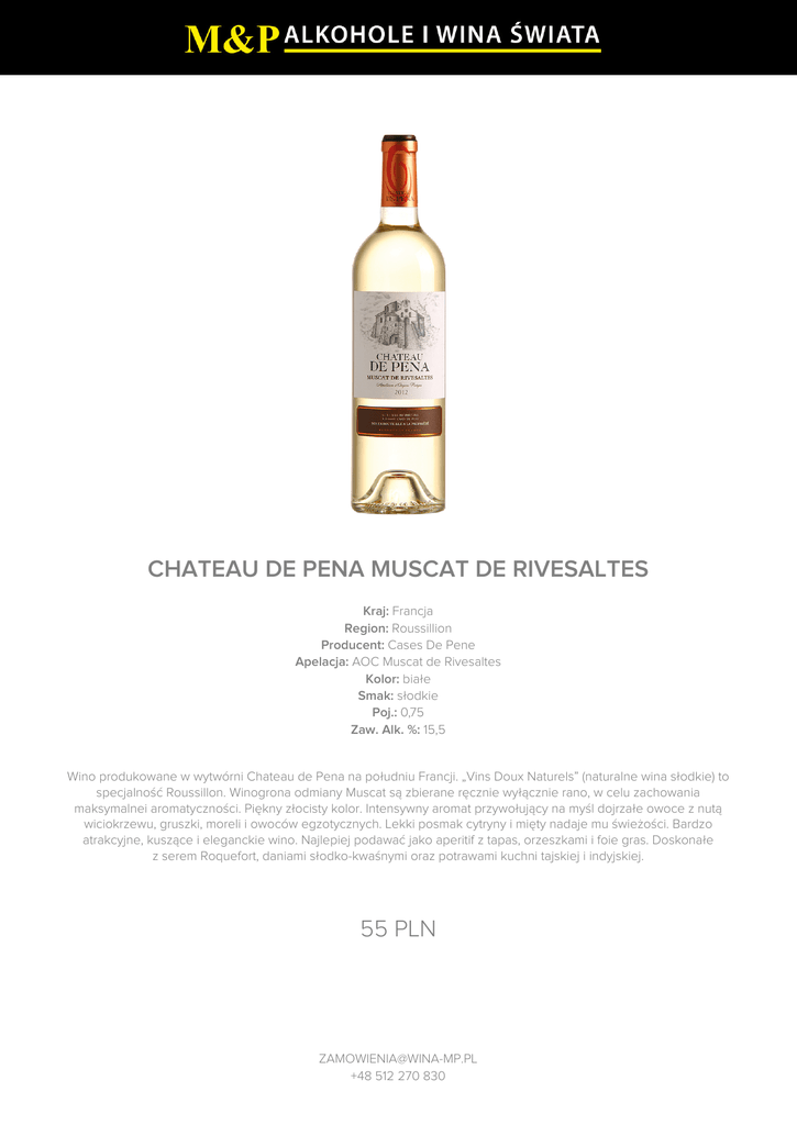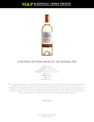 CHATEAU DE PENA MUSCAT DE RIVESALTES Kraj: Francja Region: Roussillion Producent: Cases De Pene Apelacja: AOC Muscat de Rivesaltes Kolor: białe Smak: słodkie Poj.: 0,75 Zaw. Alk. %: 15,5 Wino produkowane w wytwórni Chateau de Pena na południu Francji. „Vins Doux Naturels” (naturalne wina słodkie) to specjalność Roussillon. Winogrona odmiany Muscat są zbierane ręcznie wyłącznie rano, w celu zachowania maksymalnei aromatyczności. Piękny złocisty kolor. Intensywny aromat przywołujący na myśl dojrzałe owoce z nutą wiciokrzewu, gruszki, moreli i owoców egzotycznych. Lekki posmak cytryny i mięty nadaje mu świeżości. Bardzo atrakcyjne, kuszące i eleganckie wino. Najlepiej podawać jako aperitif z tapas, orzeszkami i foie gras. Doskonałe z serem Roquefort, daniami słodko-kwaśnymi oraz potrawami kuchni tajskiej i indyjskiej. 55 PLN [email protected] +48 512 270 830